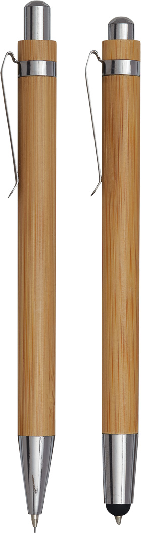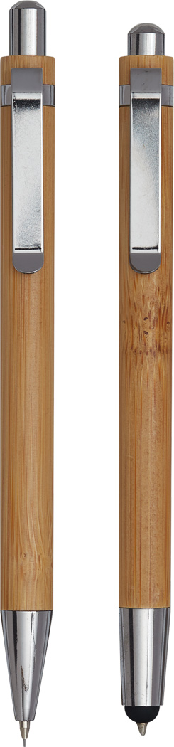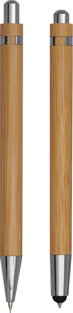 Schreibset DOUBLE BAMBOO: bestehend aus Kugelschreiber mit Druckmechanismus und Touchscreen-Spitze (blauschreibend) sowie Druckbleistift, beide Schreibgeräte mit elegantem Bambusschaft, Lieferung in Papierbox im Bambus-Design