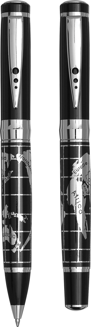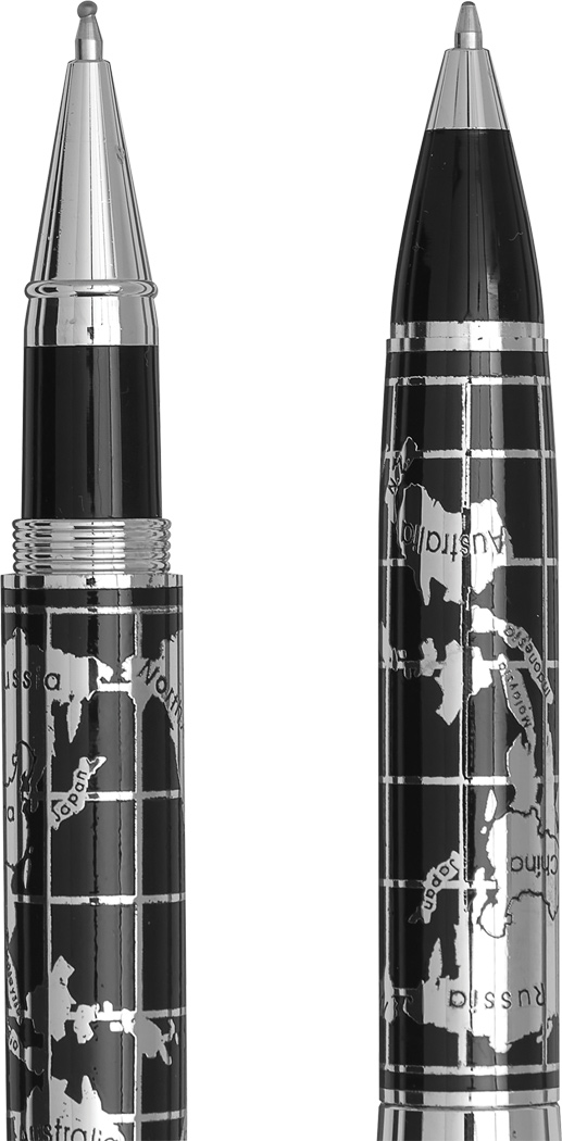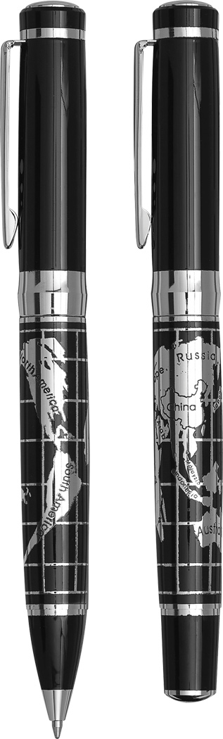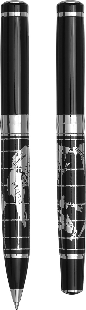 Schreibset INTERCONTINENTAL: bestehend aus Metall-Tintenroller mit Verschlusskappe (schwarzschreibend) und Metall-Drehkugelschreiber (blauschreibend), mit chromglänzendem Weltkarten-Design auf dem Schaft, Lieferung in edler Geschenkbox mit Aluminiumplatte für Veredelung