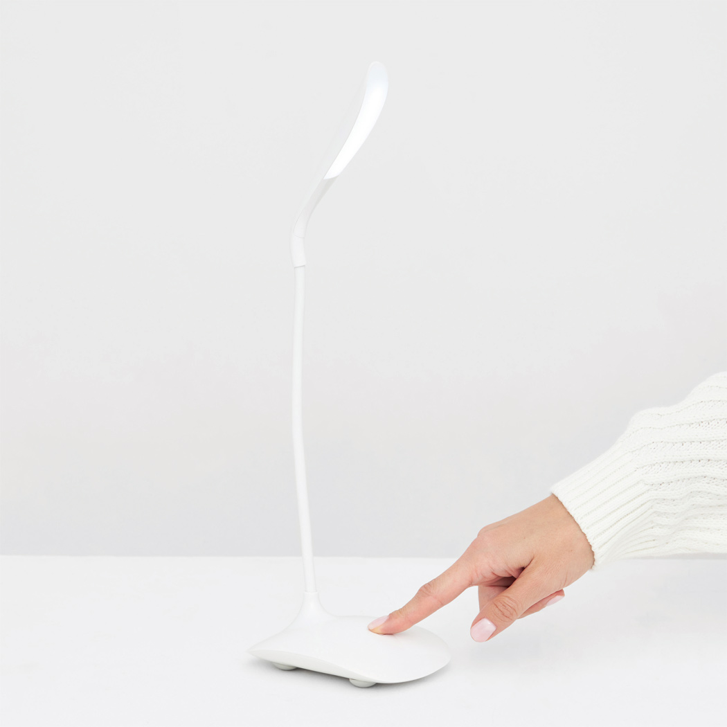 Schreibtischlampe SWAN: 360° flexibel schwenkbarer Leuchtarm mit 14 LED, Dimmfunktion mit 3 Helligkeitsstufen, An und Aus per Fingertipp, inkl. USB-Ladekabel (Länge ca. 120 cm), flexibel einsetzbar dank integriertem Lithium-Akku mit 1.200 mAh, Leistungsaufnahme bis 1,5 Watt, rutschhemmende Füße auf der Unterseite, in Box