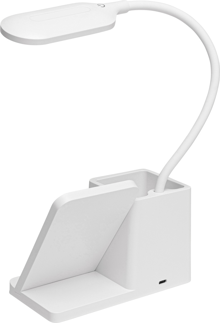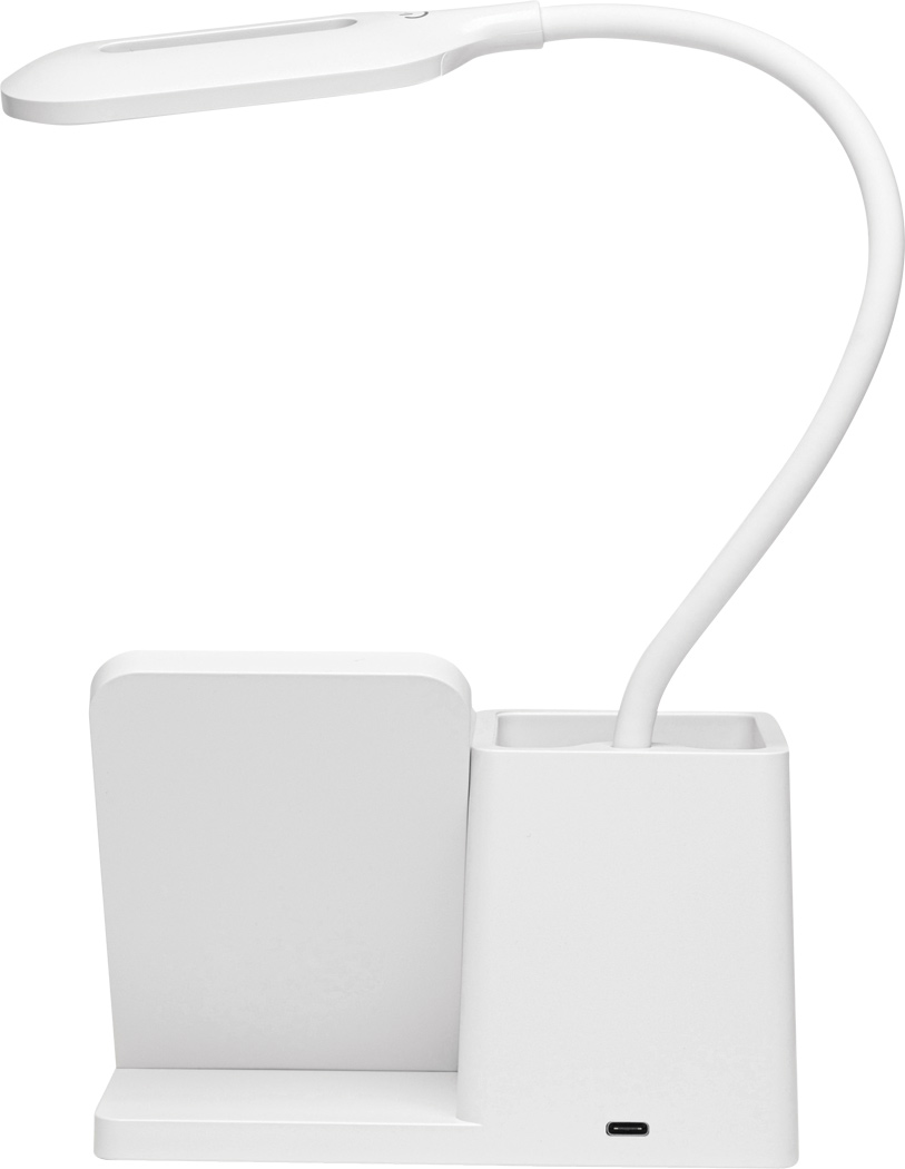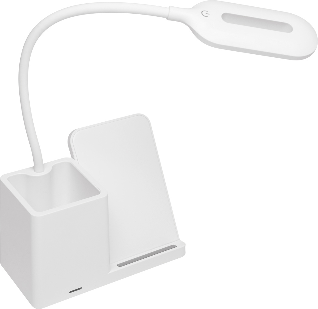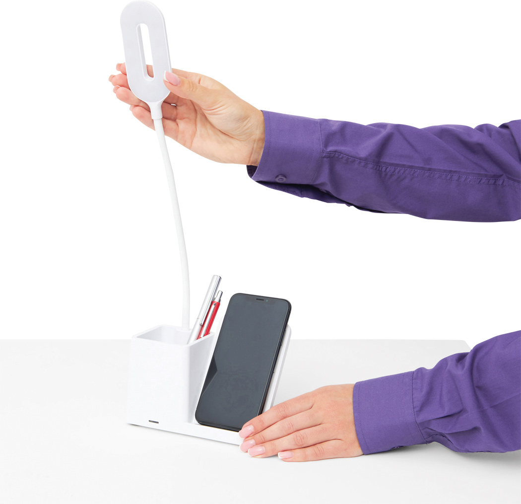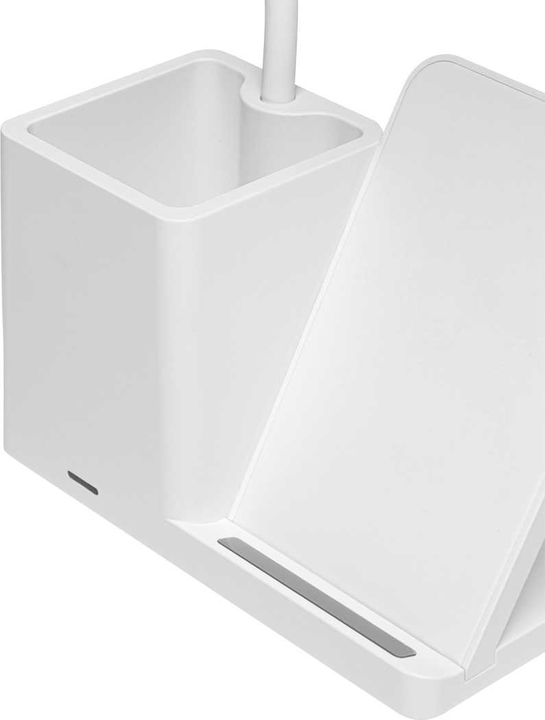 Schreibtischlampe mit Ladestation LIGHT & CHARGE: 360° flexibel schwenkbarer Leuchtarm mit 10 warmweißen und 10 kaltweißen LED, An uns Aus per Fingertipp, Stifthalter und induktive Ladestation, kabelloses Aufladen des Gerätes durch Auflegen auf die Kontaktfläche (Gerät muss für induktives Laden gerüstet sein), inkl. USB-Ladekabel mit USB Typ C Stecker (Länge: ca. 102 cm), Betriebsanzeigelicht, Eingangsleistung: 5V/2A, 9V/2A, Ausgangsleistung: 10W (max.), mit Temperaturkontrolle und Fremdkörpererkennung, 4 rutschhemmende Füße auf der Unterseite, in Box