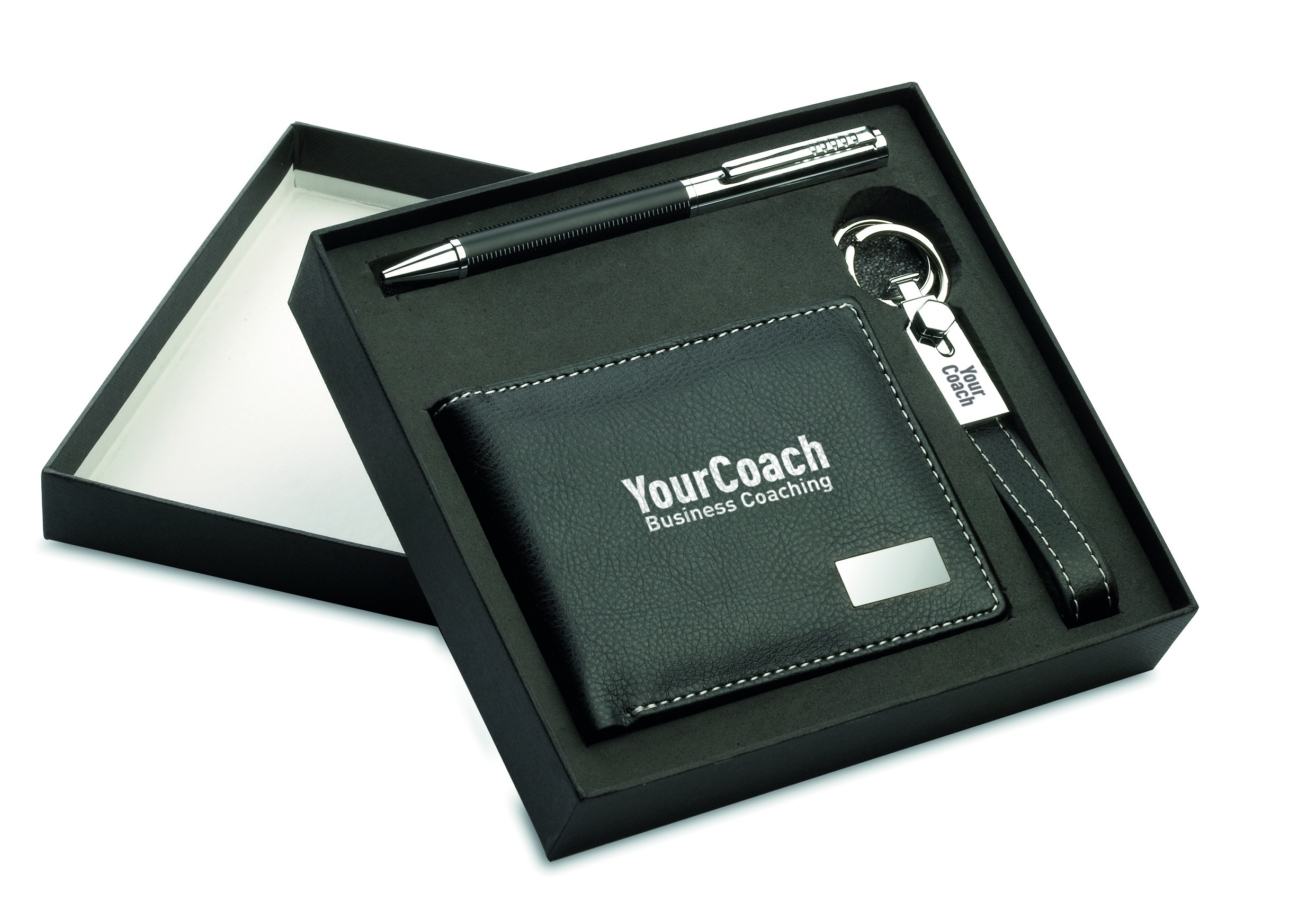 Set mit Geldbörse ELEGANCI bedruckt mit Logo und kurzfristig lieferbar.