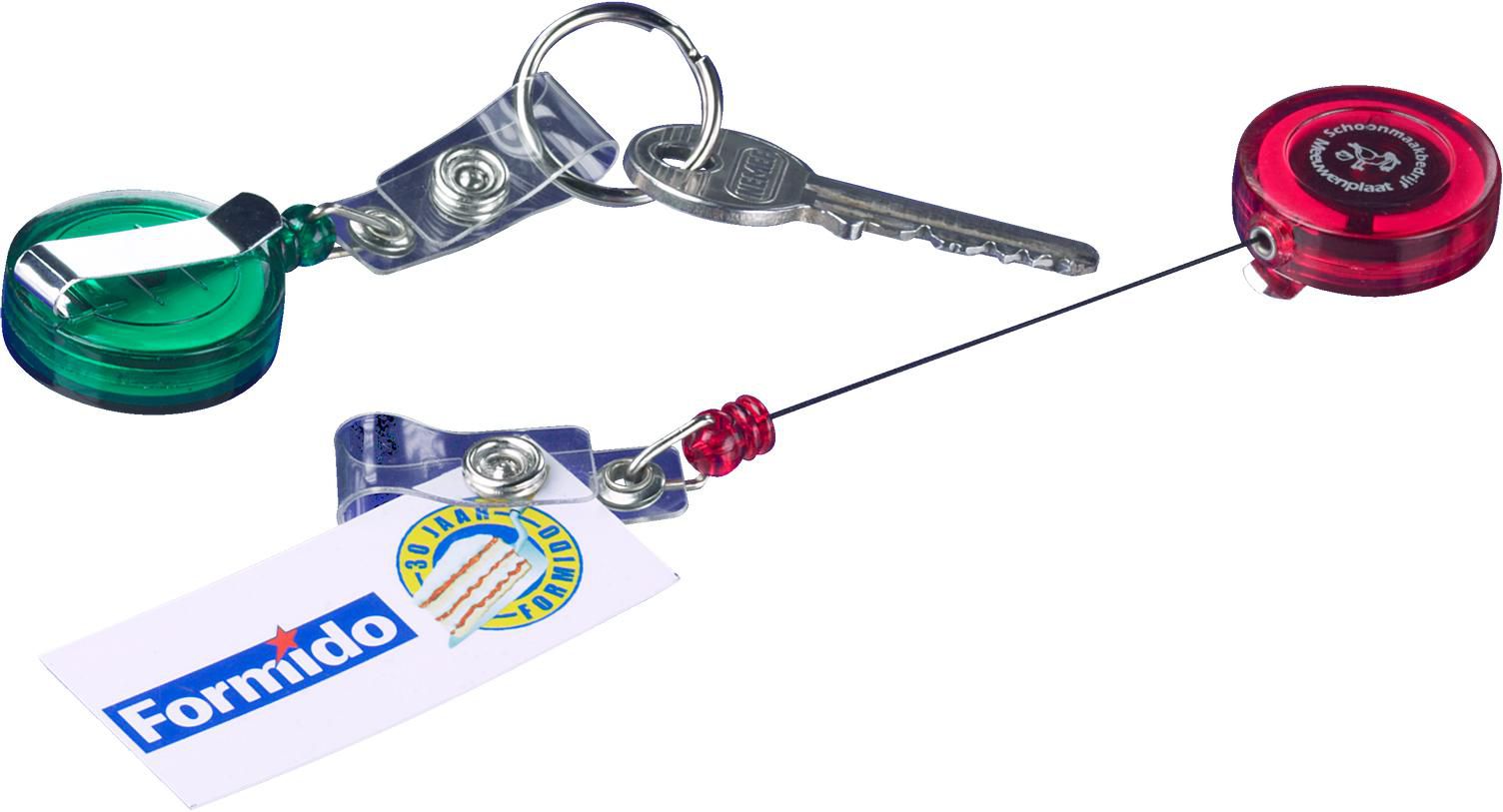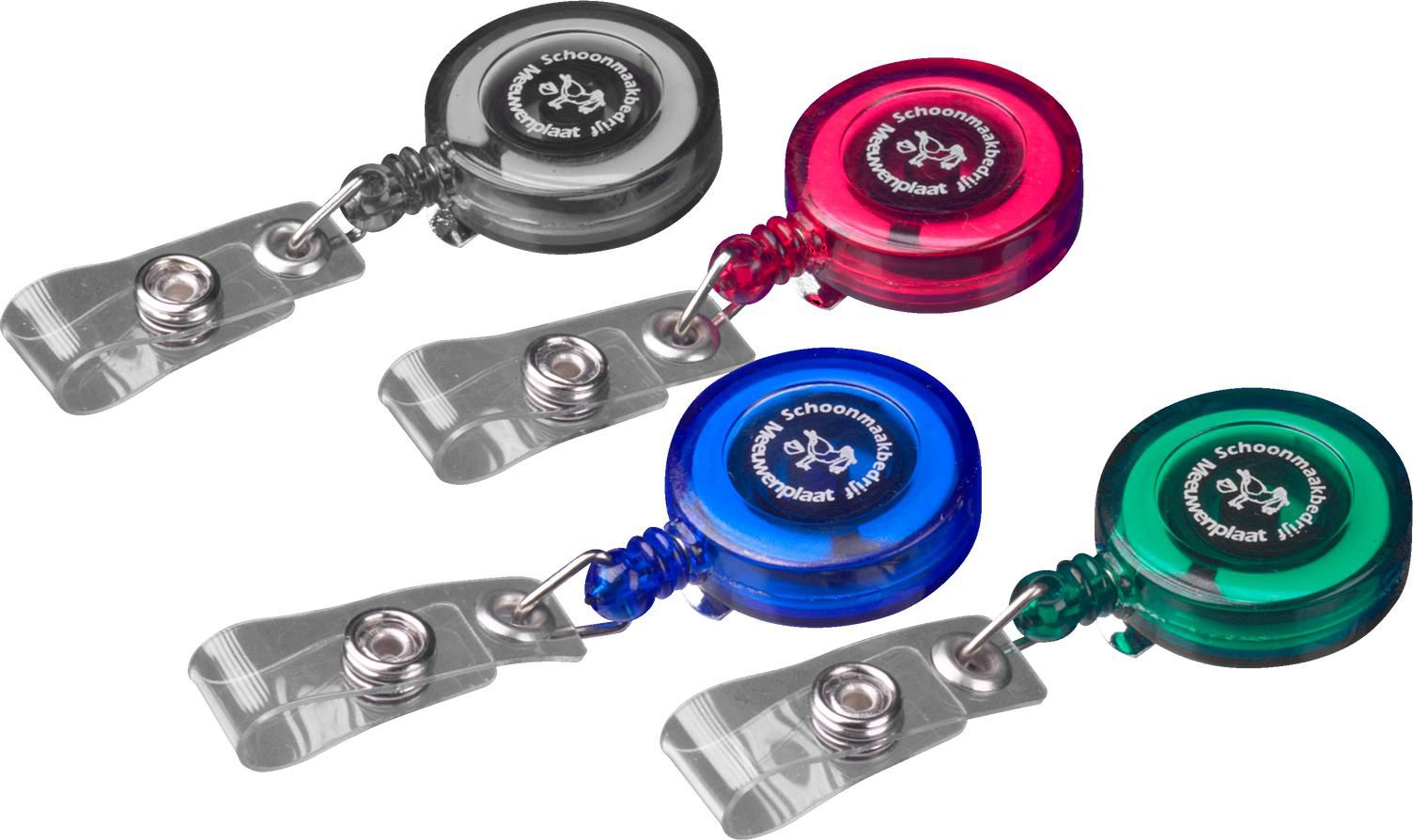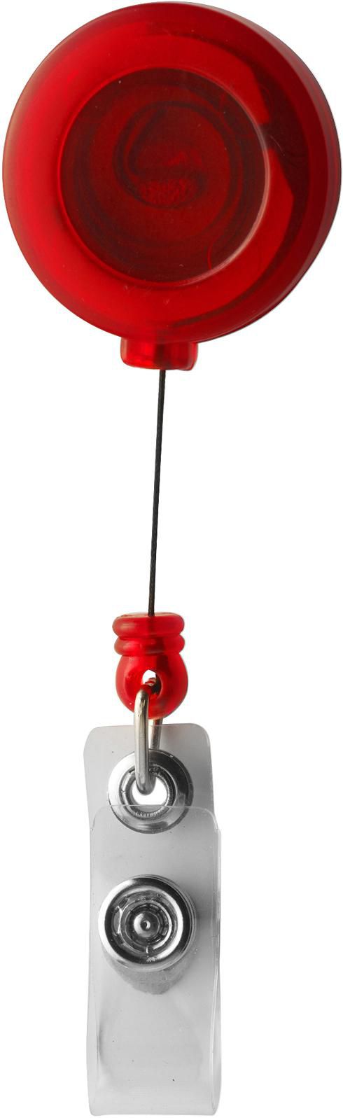 Ausweishalter aus Kunststoff, mit Befestigungsclip aus Metall / Kunststoff und Nylon-Ausziehleine (bis ca. 80 cm).