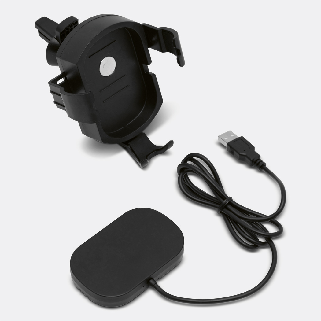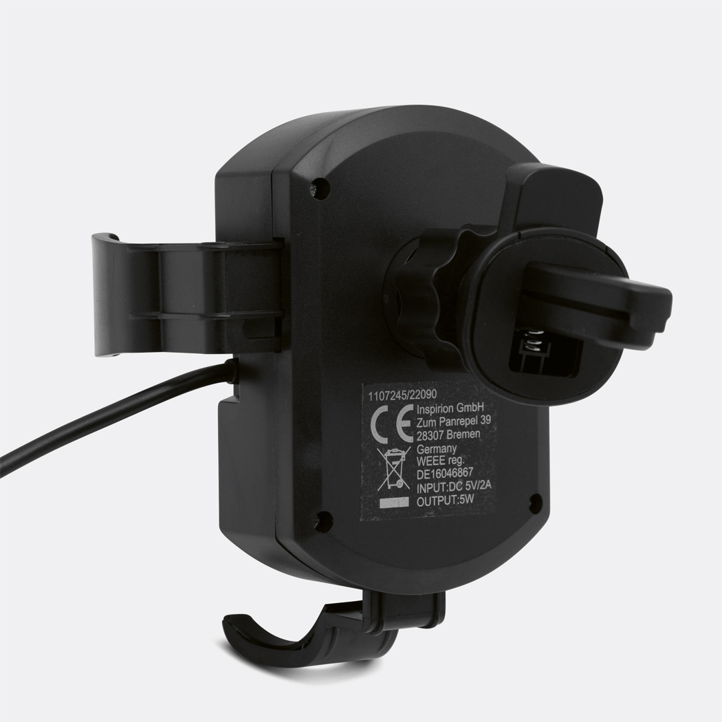 Smartphone-Halter CHARGE N GO: geeignet für die gängigsten Smartphones mit induktiver Ladefunktion, Klemme für die Befestigung an Auto-Lüftungsschlitzen (für verschiedene Lamellenstärken), Kugelgelenk zur optimalen Ausrichtung, Ladeeinheit mit integriertem USB-Ladekabel (Länge: 1 m), mit Magneten im Halter befestigt zur einfachen Entnahme und separaten Verwendung, Eingangsleistung: 5V/2A, Ausgangsleistung: 5W, in Box