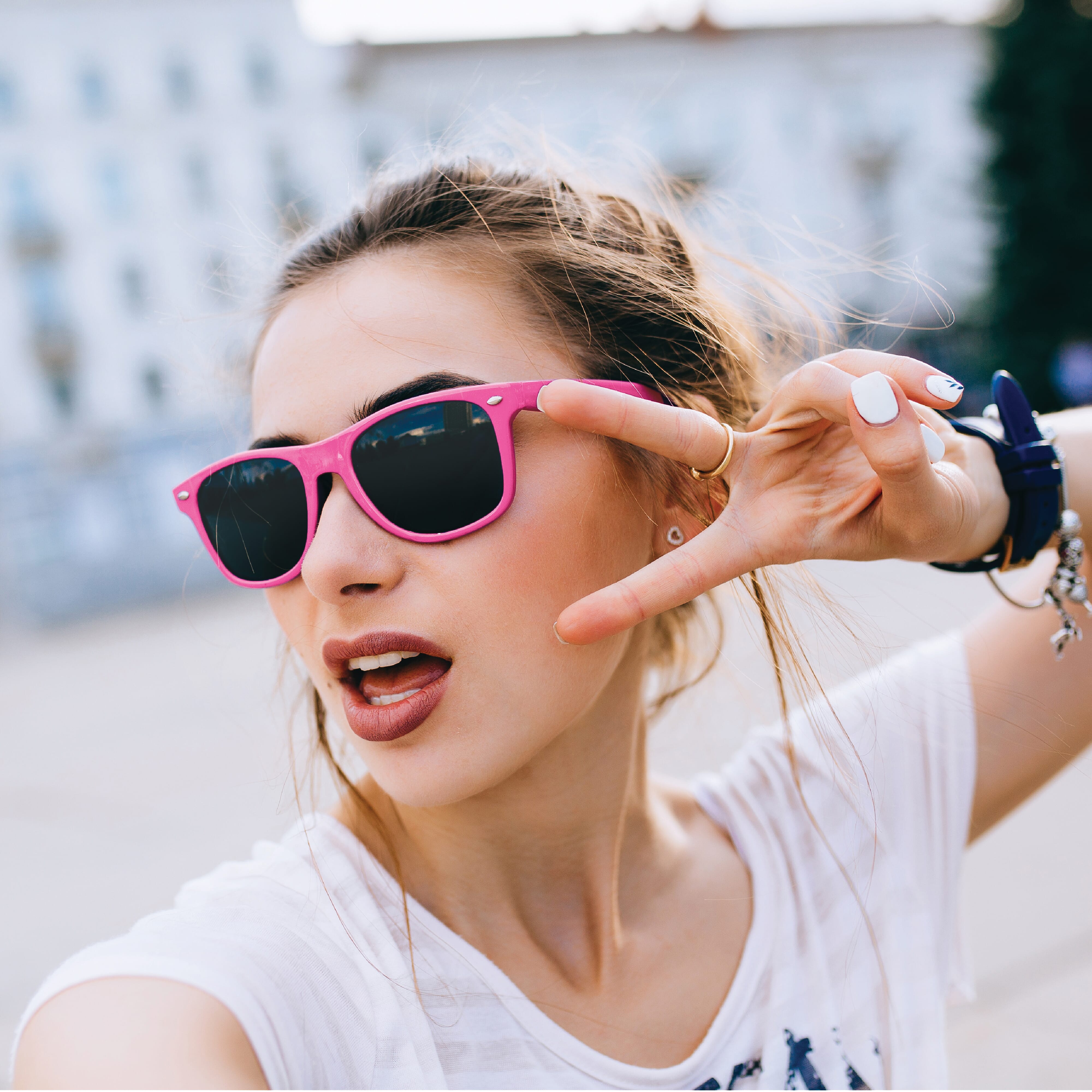 Zeitgenössische Sonnenbrille mit UV400-Filter, für einen modischen Look. Druck auf einem oder beiden Bügeln möglich.