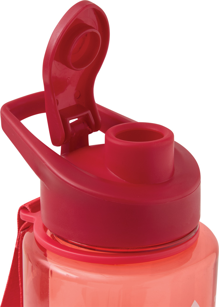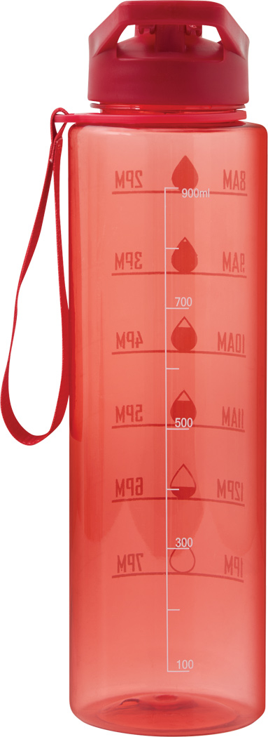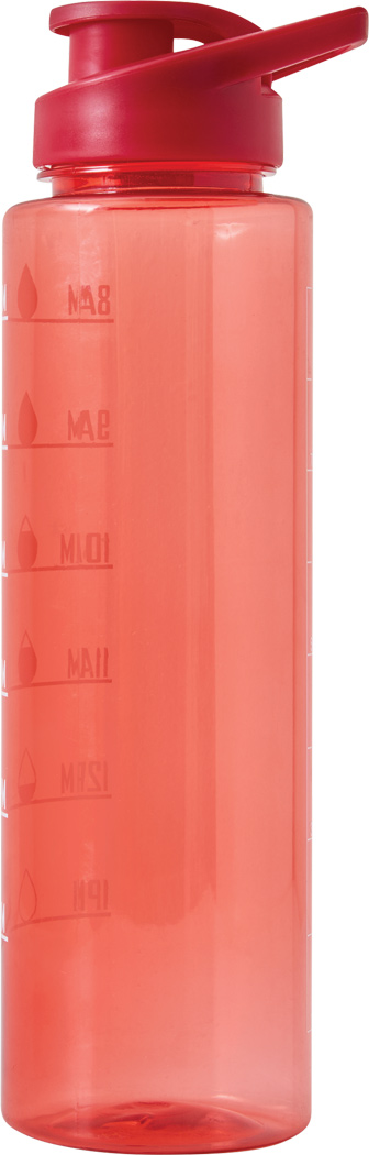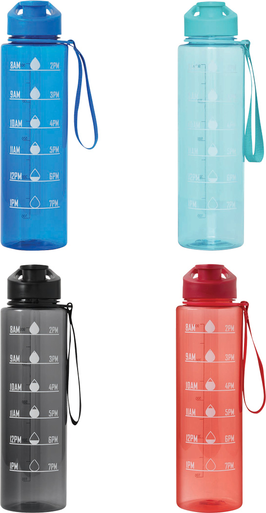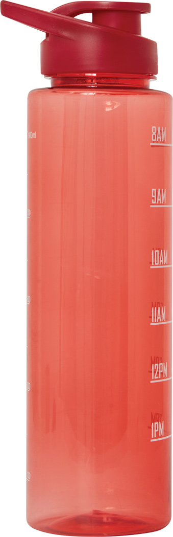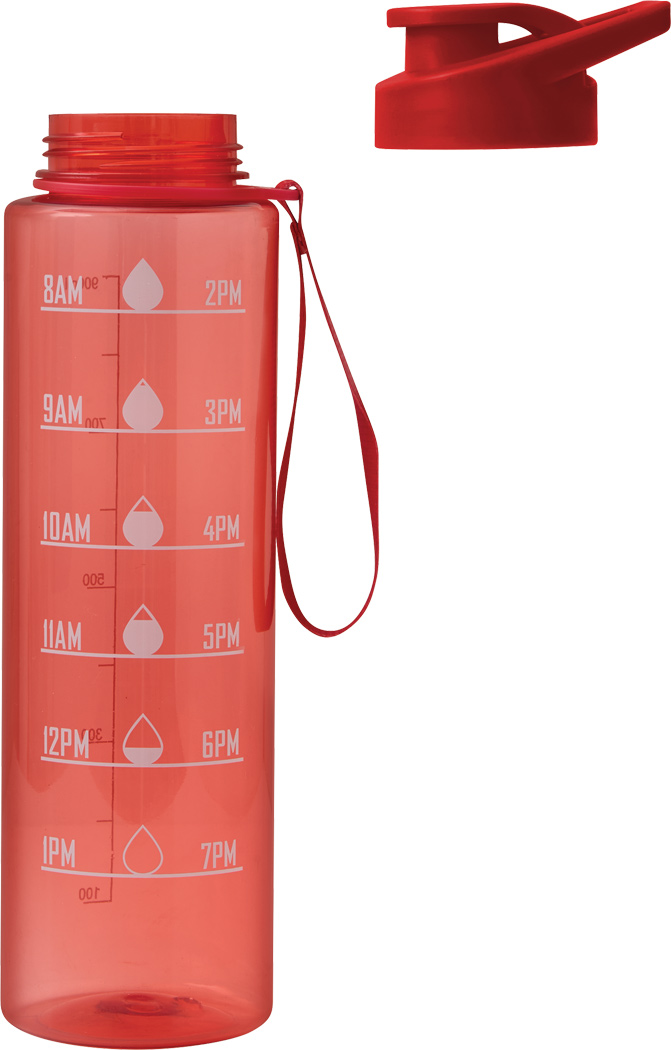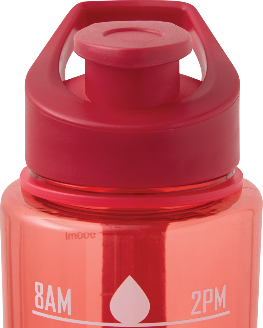Sport-Trinkflasche AQUA LEVEL: transparente farbige Trinkflasche aus langlebigem PETG, farbig abgestimmter Kunststoff-Deckel mit sicherem Schraubverschluss, Silikon-Dichtring, Trinköffnung zum Aufklappen und Tragegriff, motivierende Zeit- und Wassermengenskala (Uhrzeiten / ml), mit Trageschlaufe, Füllmenge ca. 1.000 ml