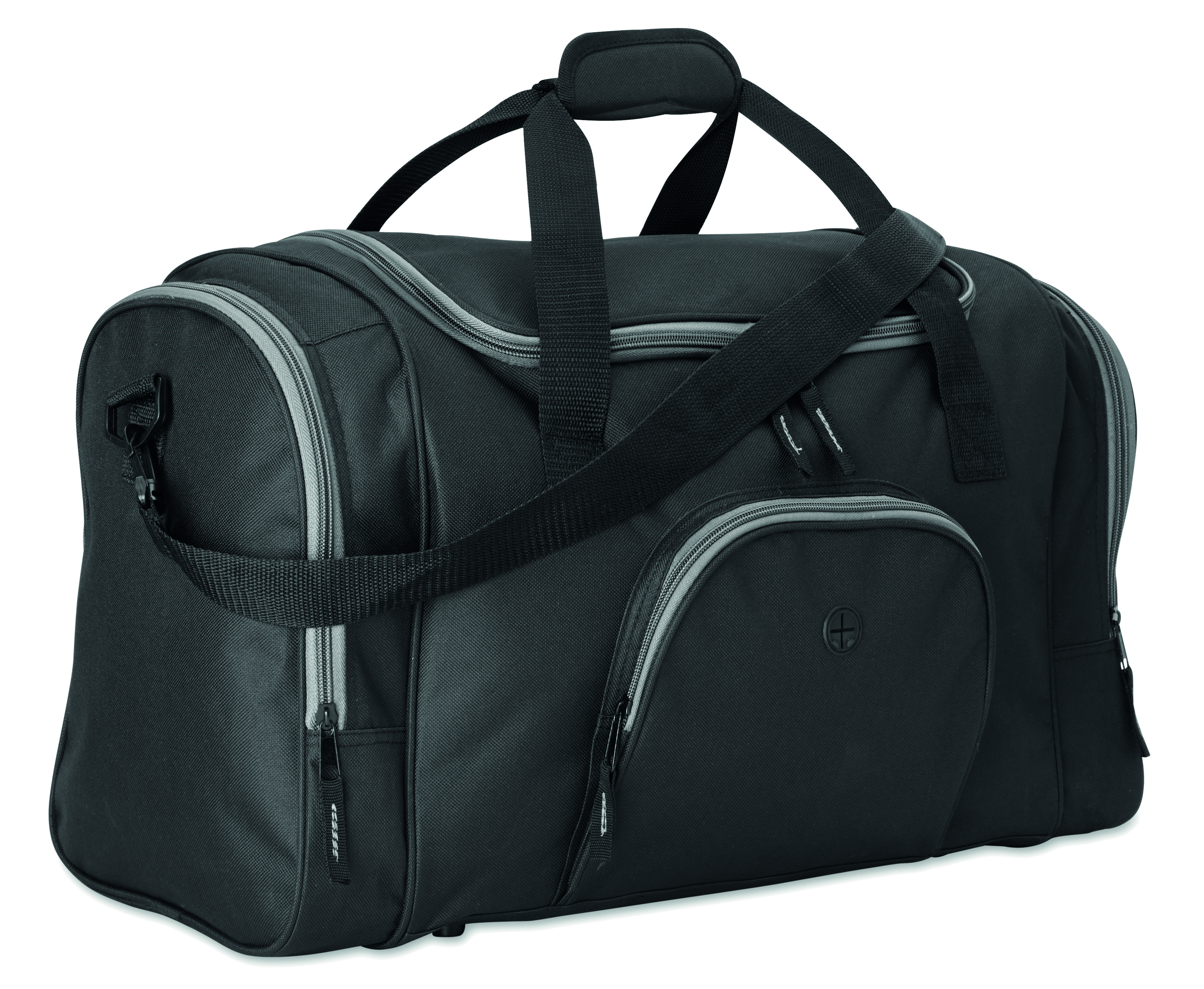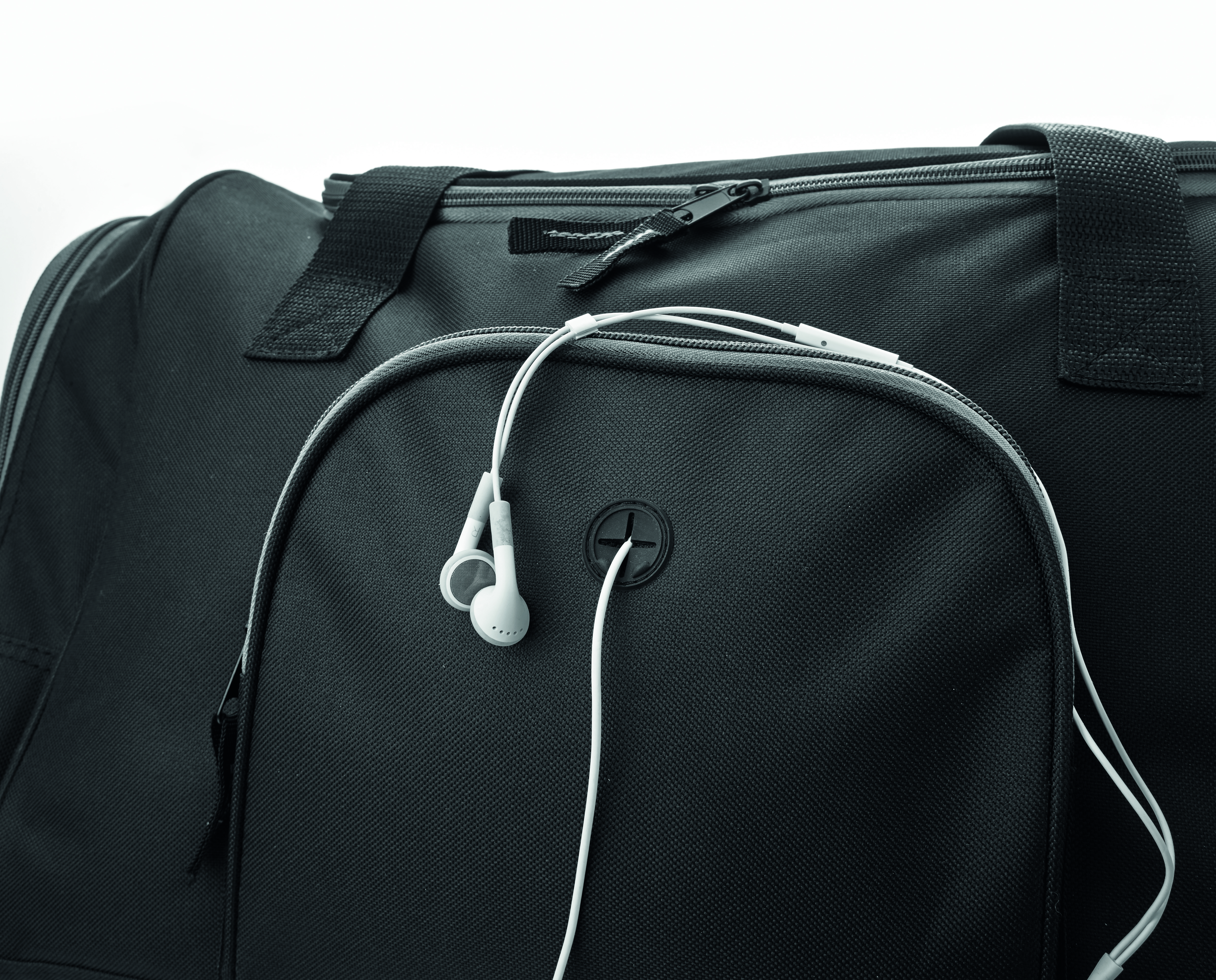 Sporttasche mit mehreren Fächern, verstellbarem Schultergurt und einer Ohrhörer-Öse. 600D Polyester.