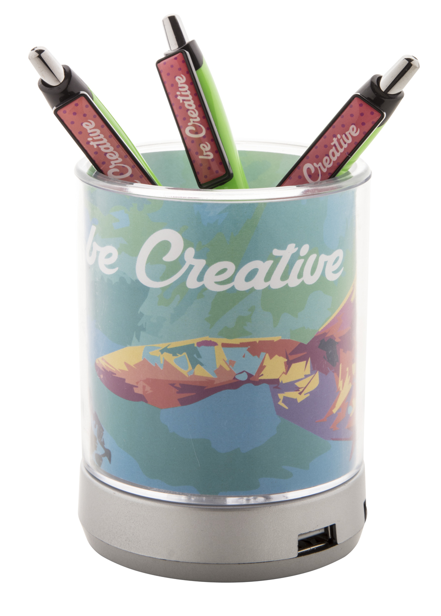 Schtifteköcher aus ABS-Kunststoff mit USB Hub (USB 2.0, 4 Ports) und blauem Licht. Bedruckung erfolgt auf Papiereinleger (zwischen beiden Wänden).