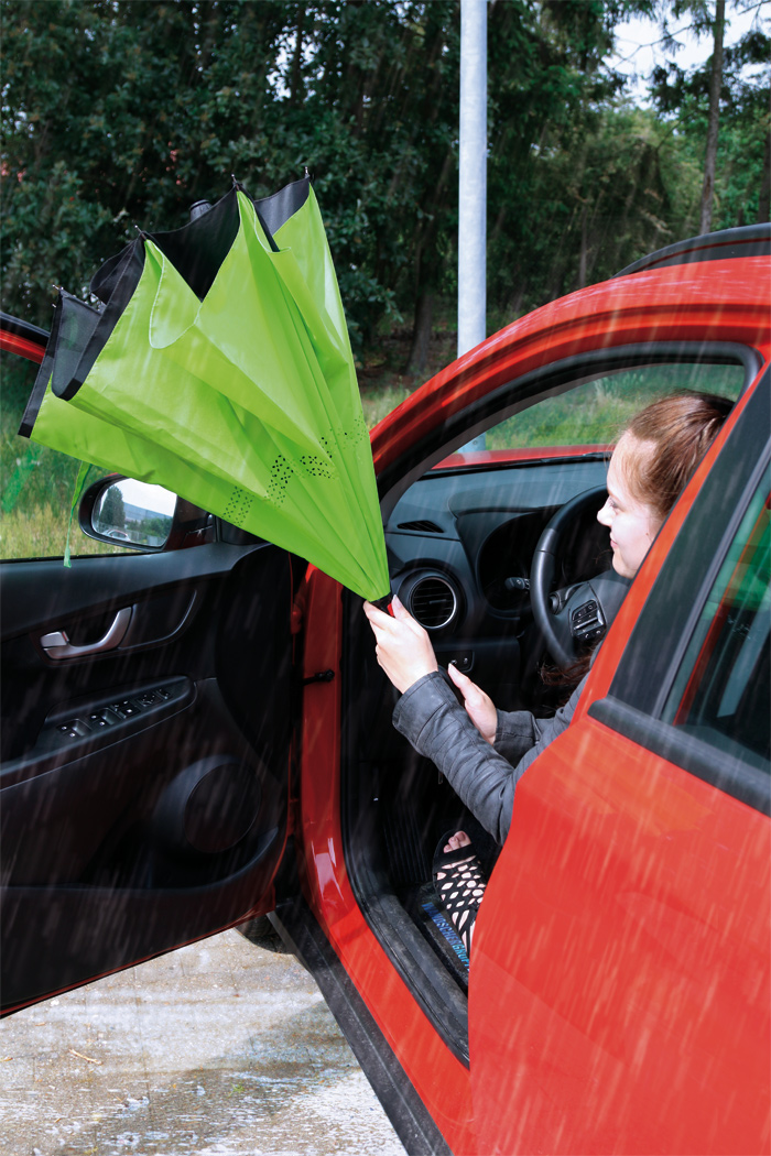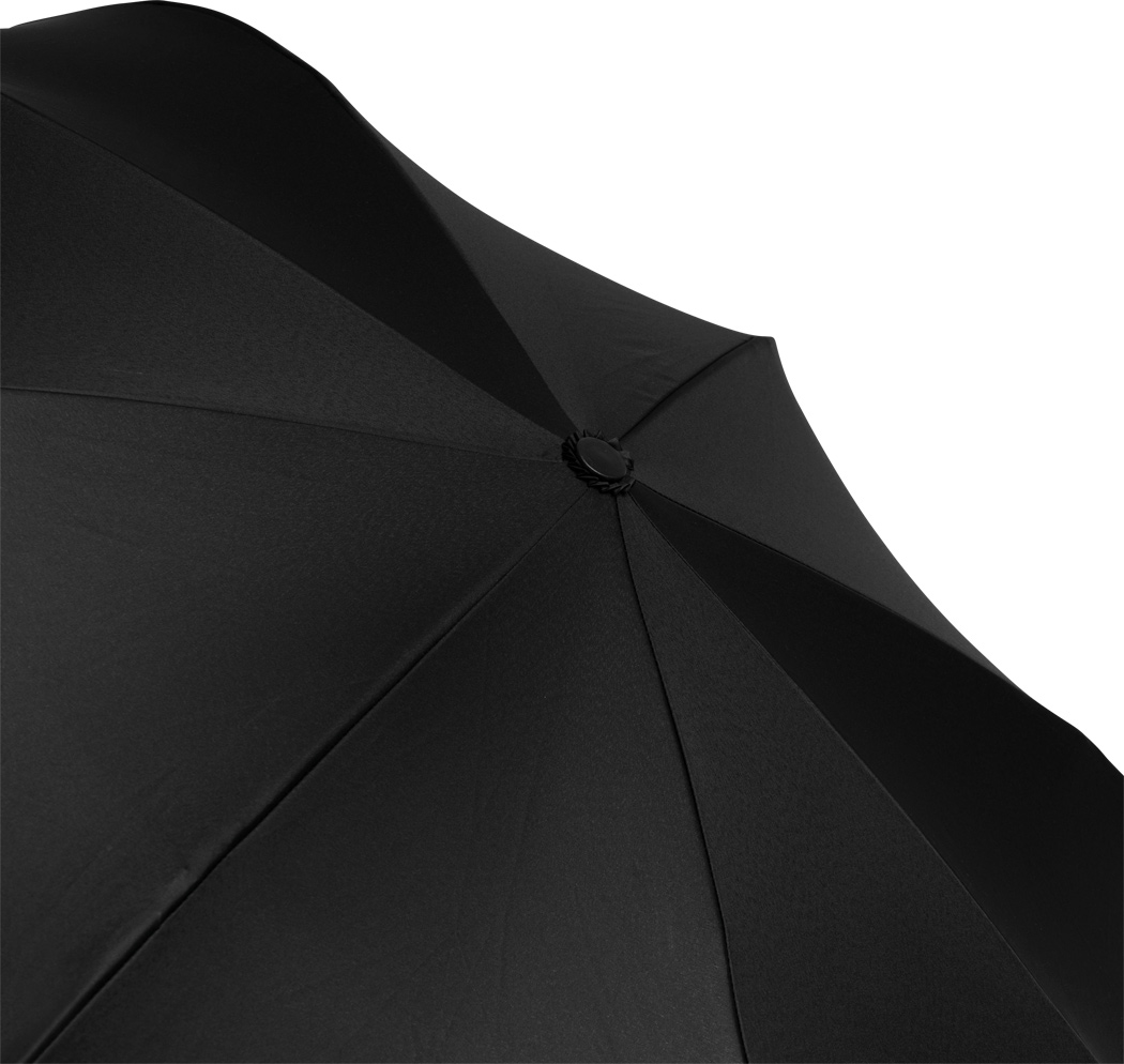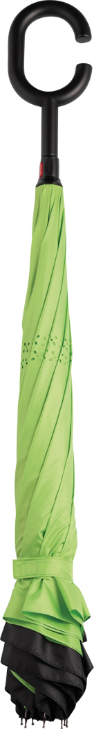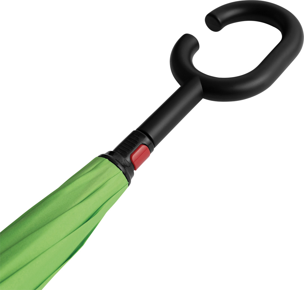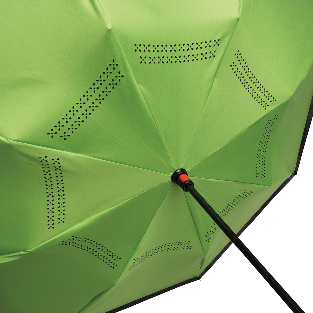 Stockschirm FLIPPED: mit umgekehrtem Öffnungs- und Schließmechanismus, Sicherheitsschieber, freie Hände dank C-Shape-Griff, Doppel-Bezug mit Ventilationsmuster zur Vermeidung von Luftstau, flexibles Gestänge durch Fiberglasspeichen, Metallstock, mit Metalltips, Polyester-Pongee-Bespannung, Schließband mit Klettverschluss