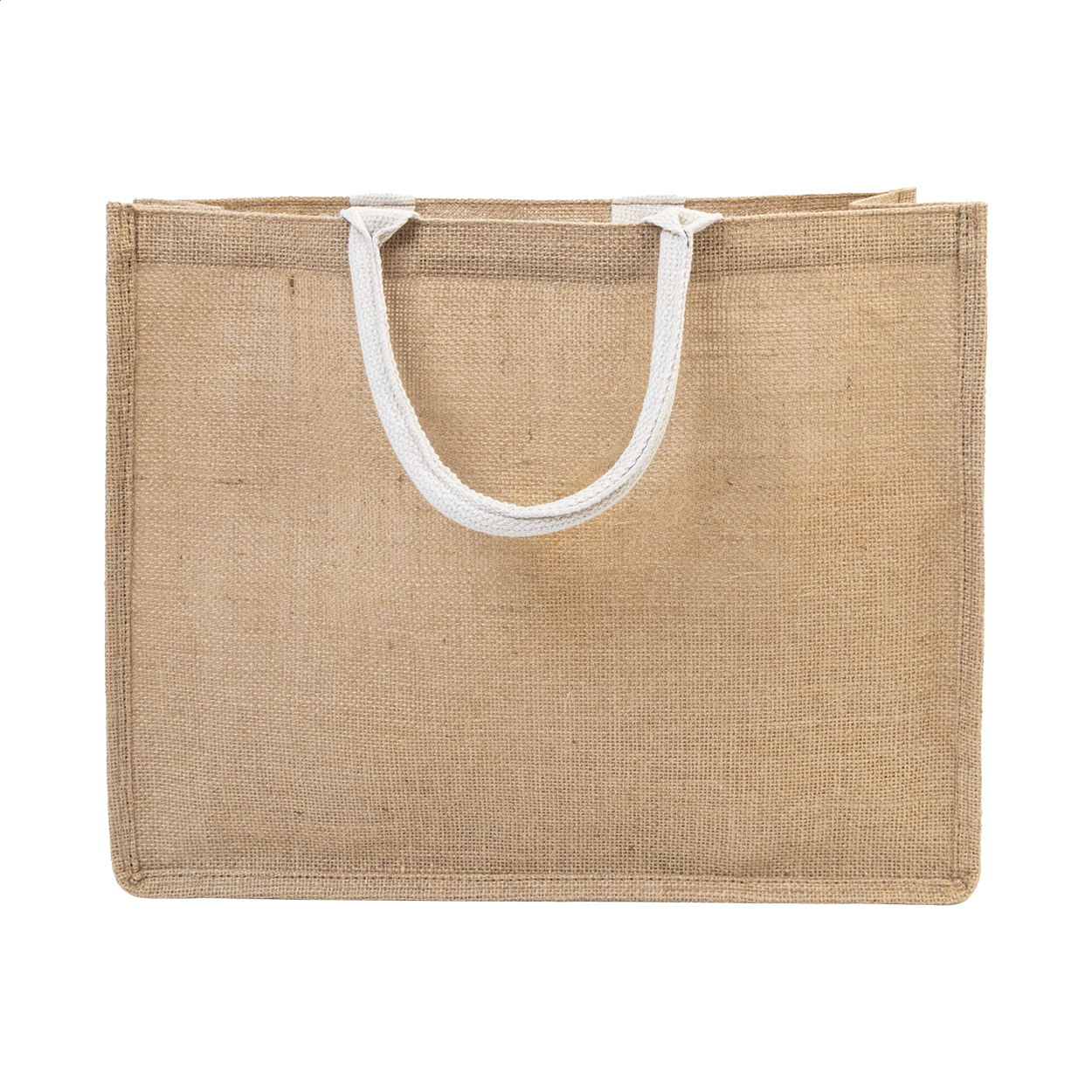 Laminierte Strandtasche aus Jute mit Baumwollgriffen und Fronttasche.