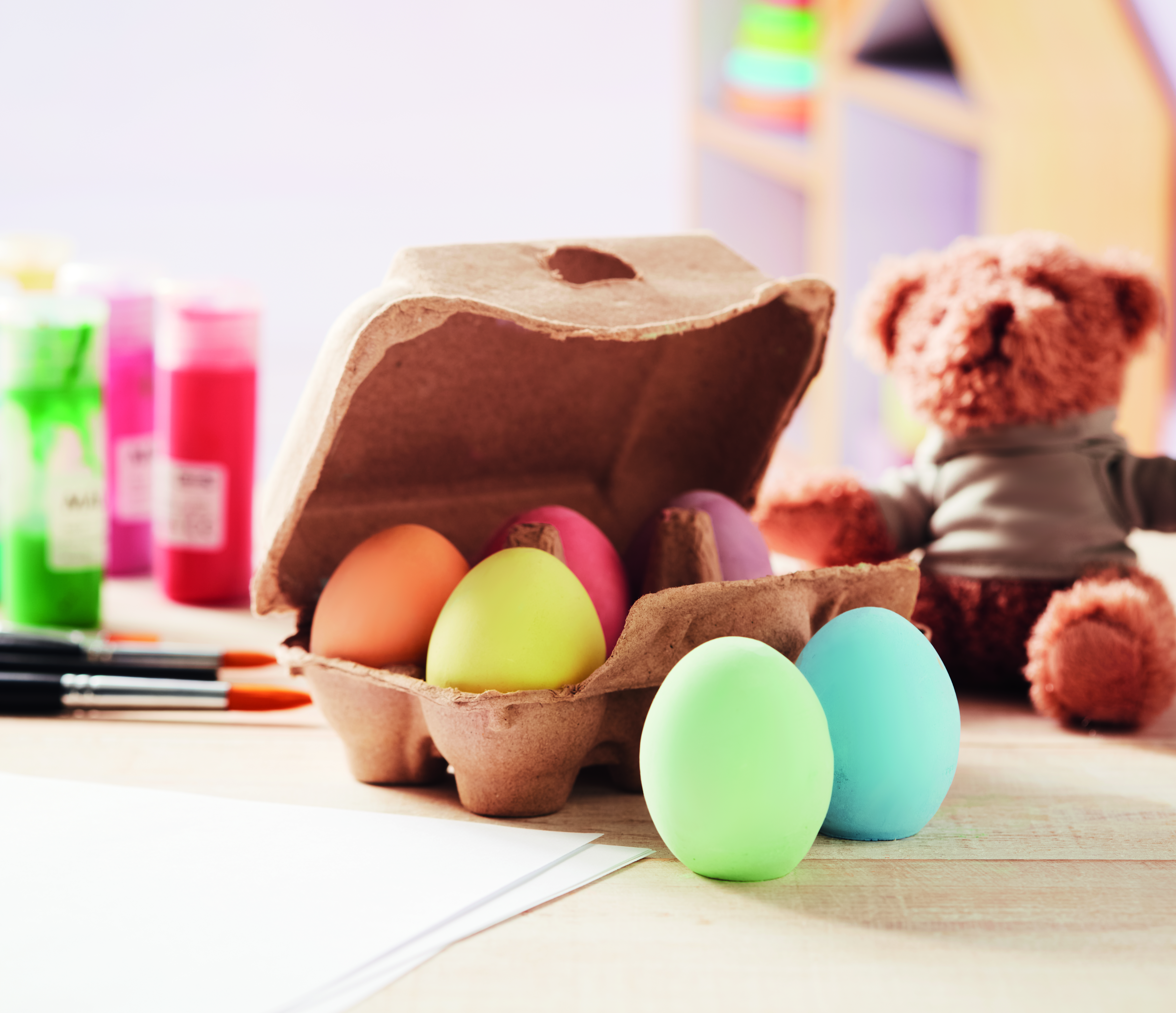 Straßenmalkreide mit 6 Kreide-Eiern im recycelten Eierkarton.