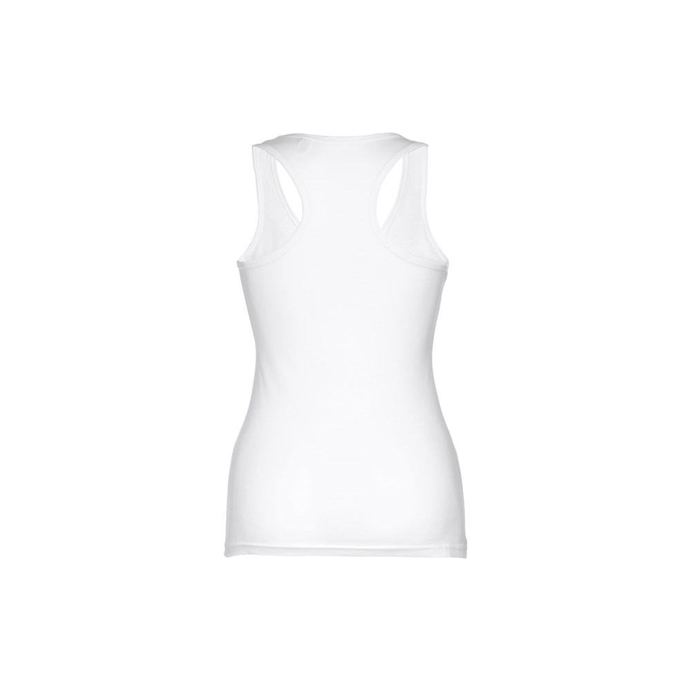 Damen Tank Top aus 100% Strickjersey und Baumwolle (160g / m²) mit kardiertem Baumwollfaden und" T"-Ausschnitt am Rücken. Doppelnaht am Saum, an den Armlöchern und am Ausschnitt. Größen: S, M, L, XL, XXL