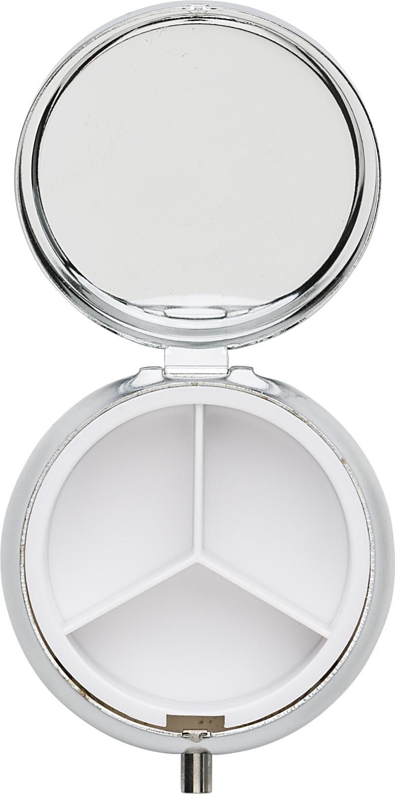 Tablettenbox aus Eisen und PP innen mit 3 Fächern. Glänzende Innenseite kann als Spiegel verwendet werden. Einzeln verpackt in einer weißen Box.