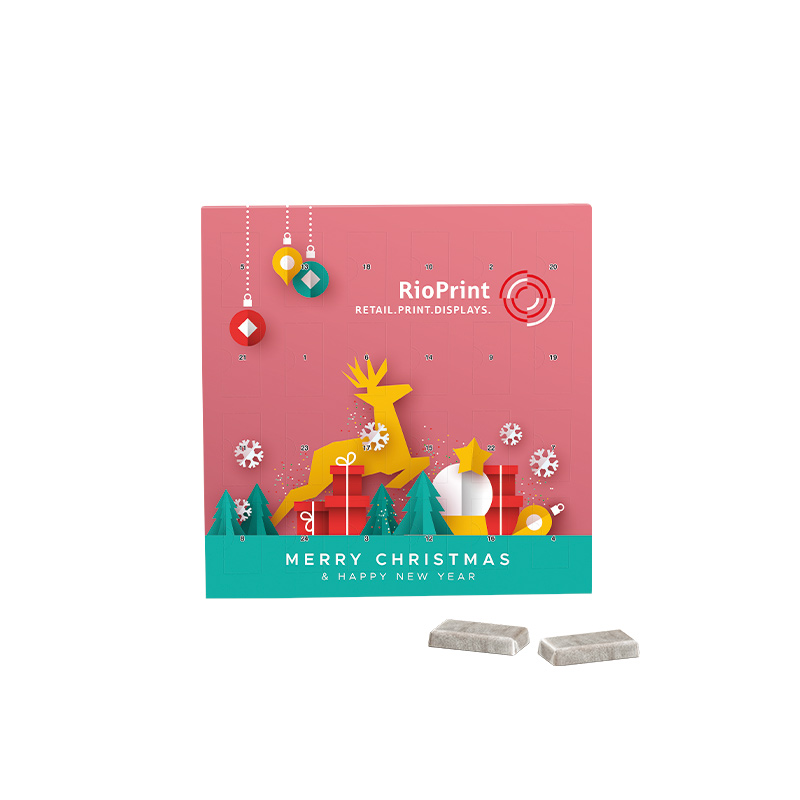 Täfelchen Adventskalender, Alpenmilch Schokotäfelchen mit Logo für Geschäftskunden individuell bedruckt.