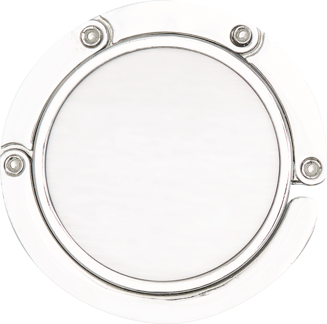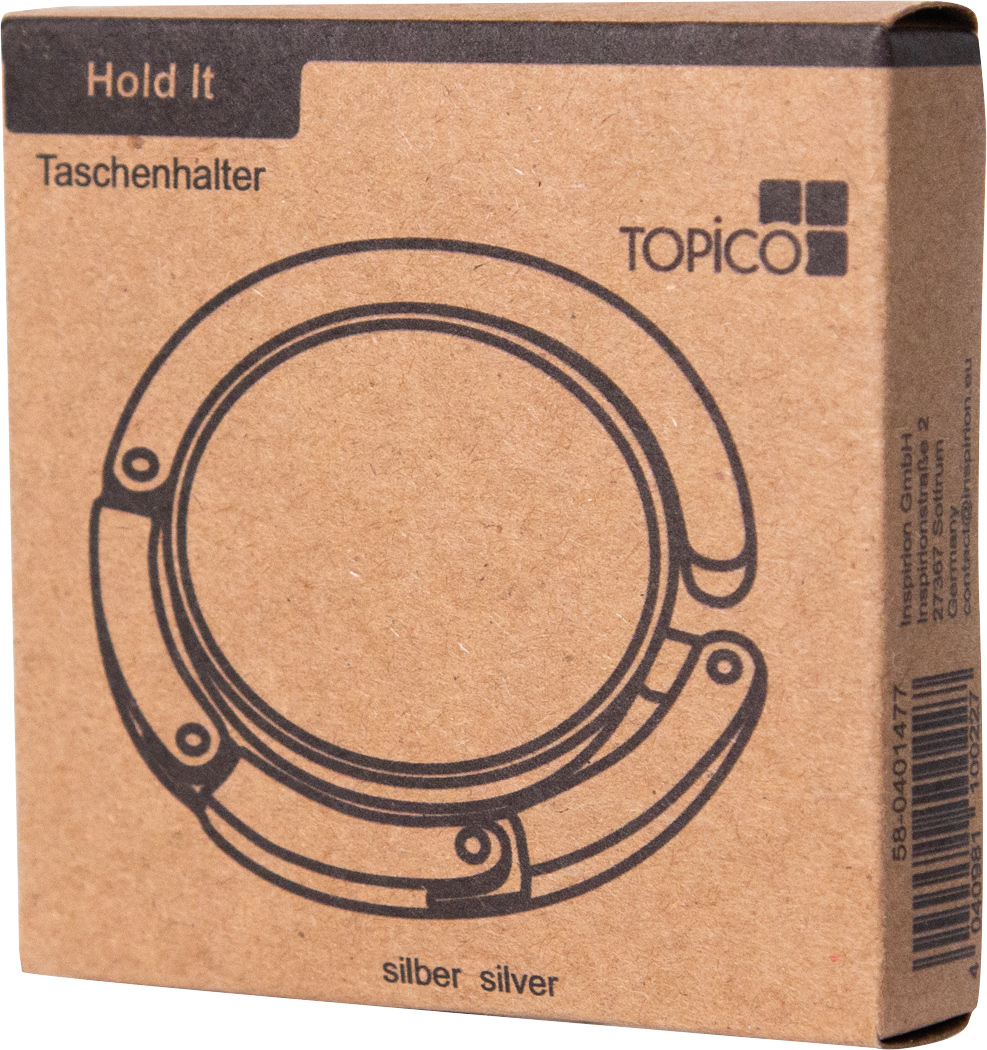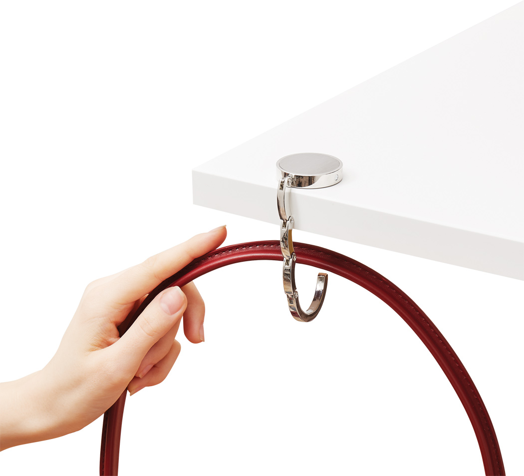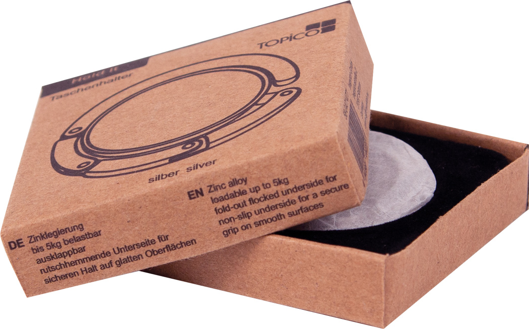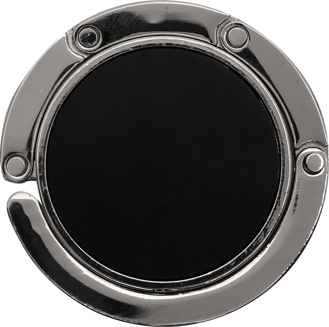 Handtaschenhalter HOLD IT, ausklappbar: Oberseite aus glänzendem Metall für Werbeanbringung, beflockte Unterseite sorgt für sicheren Halt auf glatten Oberflächen