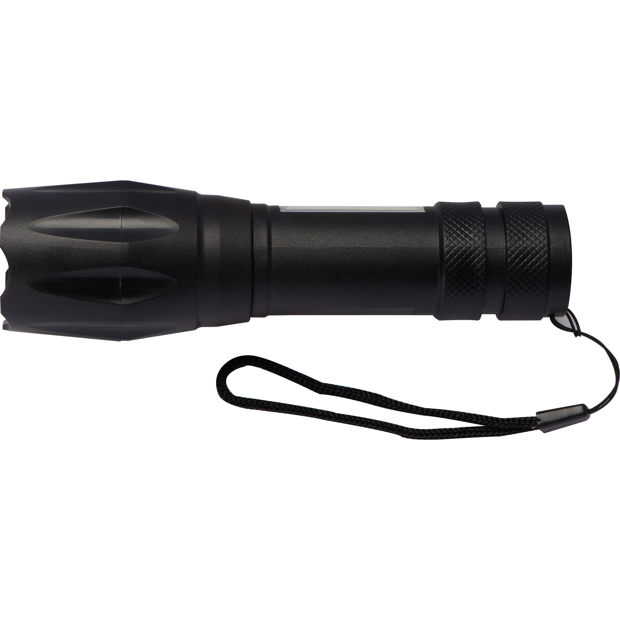 Wiederaufladbare Taschenlampe (3W, 150 Lumen) mit 600mAh Akku und zusätzlichem seitlichem Licht (3W, 130Lumen). Die Taschenlampe besitzt drei Leuchtmodi und wird mit Ladekabel geliefert. Ihre Werbung wird auf die Lampe gedruckt.