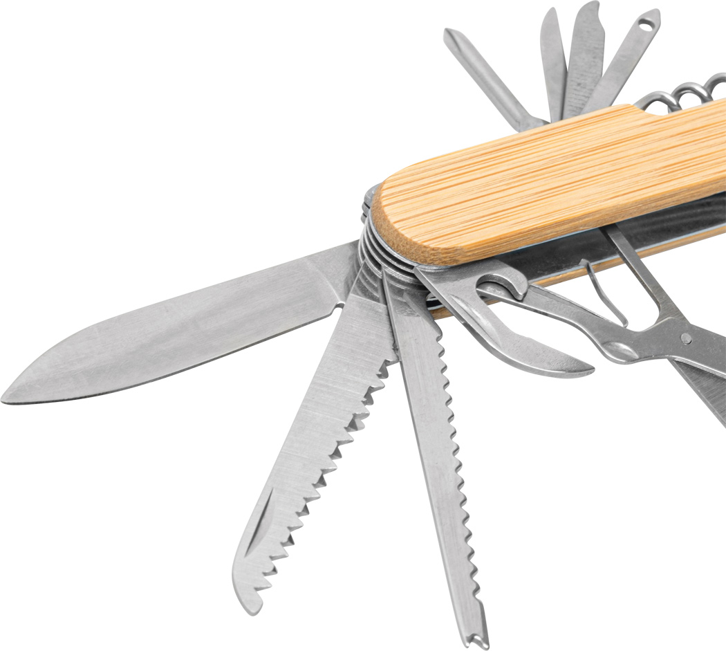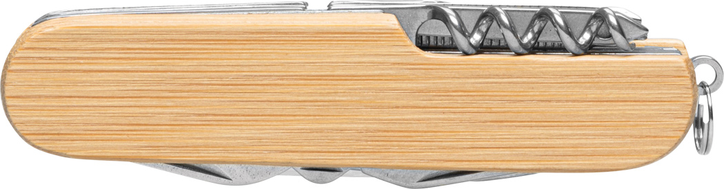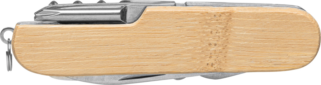 Taschenmesser BAMBOO HELPER, 11-teilig: bestehend aus Schere, große Säge, kleine Säge, Messer, Dosenöffner, Flaschenöffner, Korkenzieher, Ahle, Feile, Lochstecher und Kreuzschraubendreher, inkl. Schlüsselring, aus Edelstahl mit Bambus-Griff, in Box