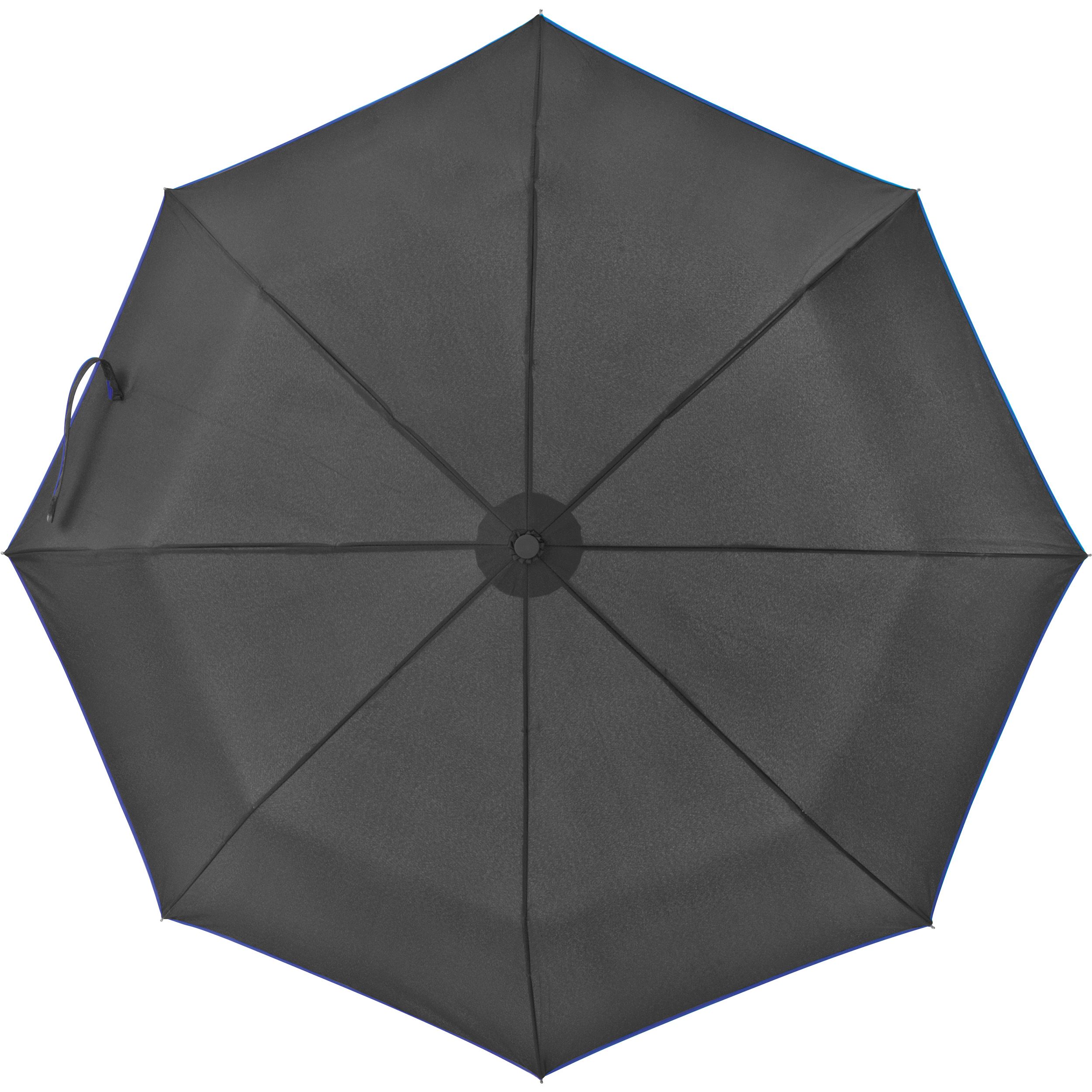 Taschenschirm schwarz mit farbigem Rand aus 190T Pongee und Fiberglassgestänge. Ihre Werbung drucken wir auf ein Segment.