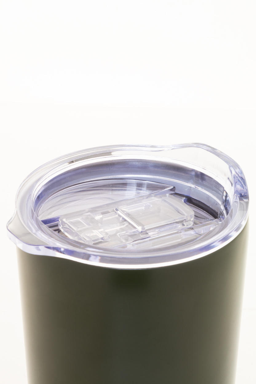 Doppelwandiger, vakuumisoloierter Thermobecher aus recyceltem Edelstahl mit Trinkdeckel aus PS Kunststoff. Füllmenge: 600 ml.