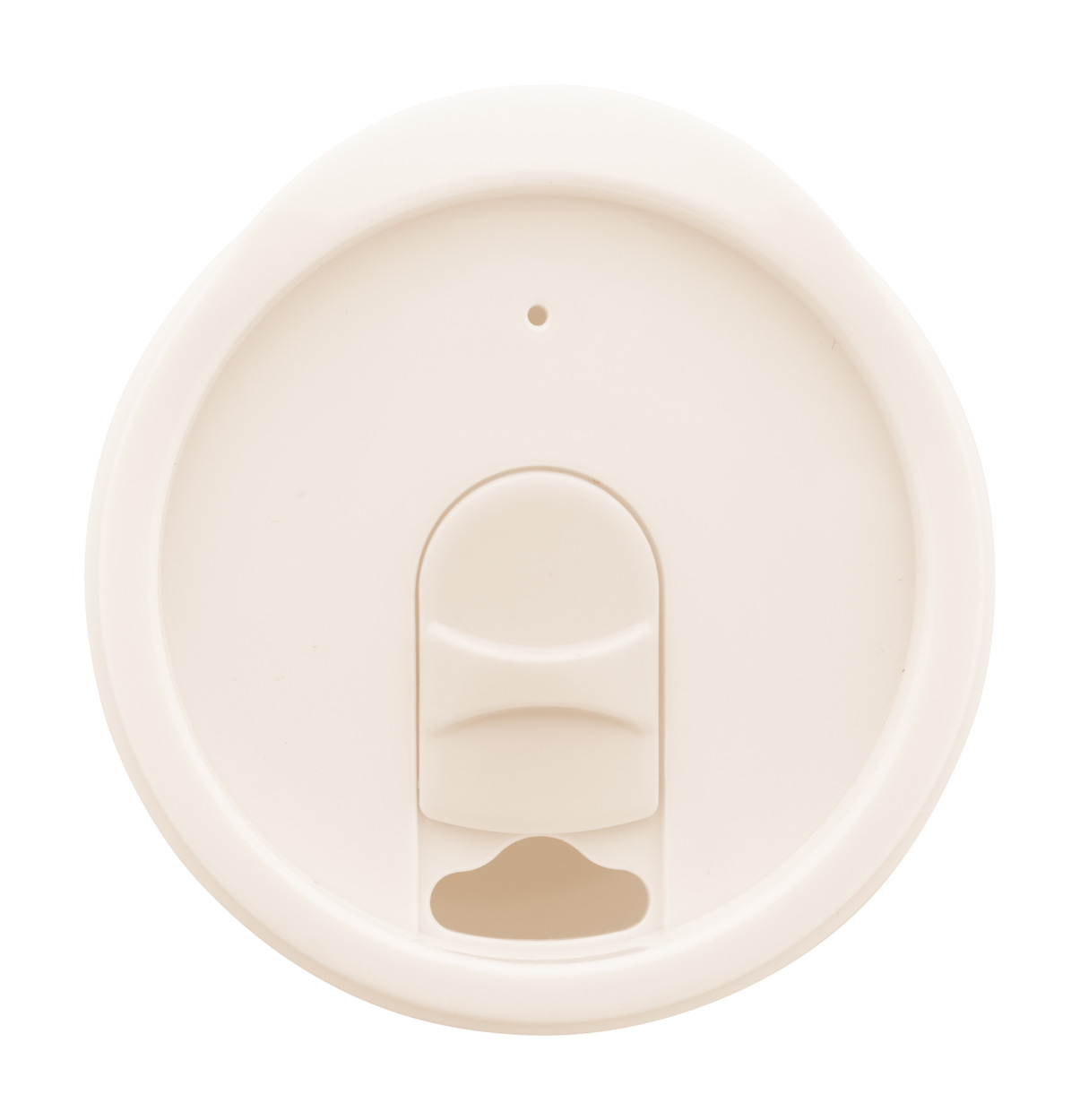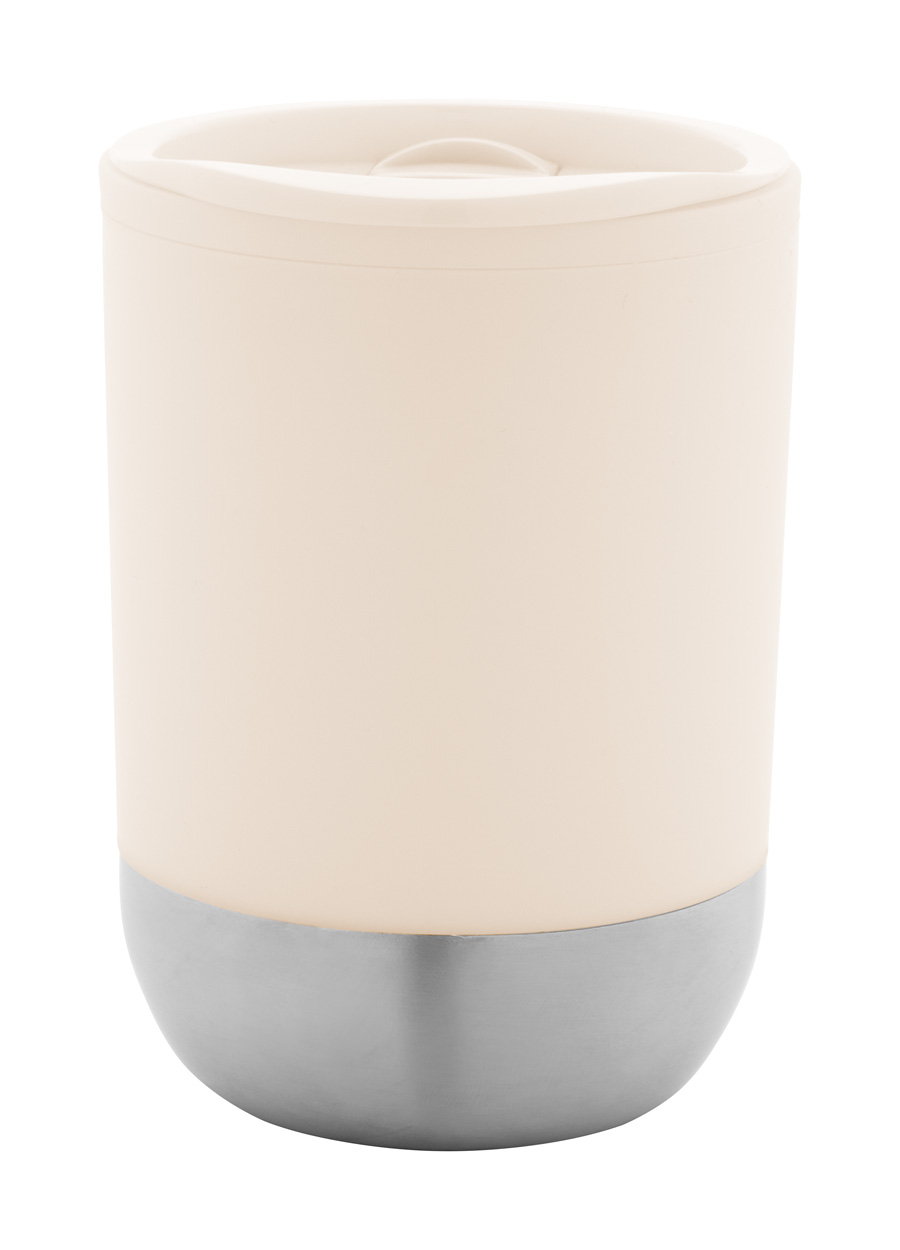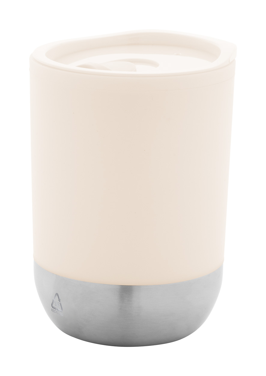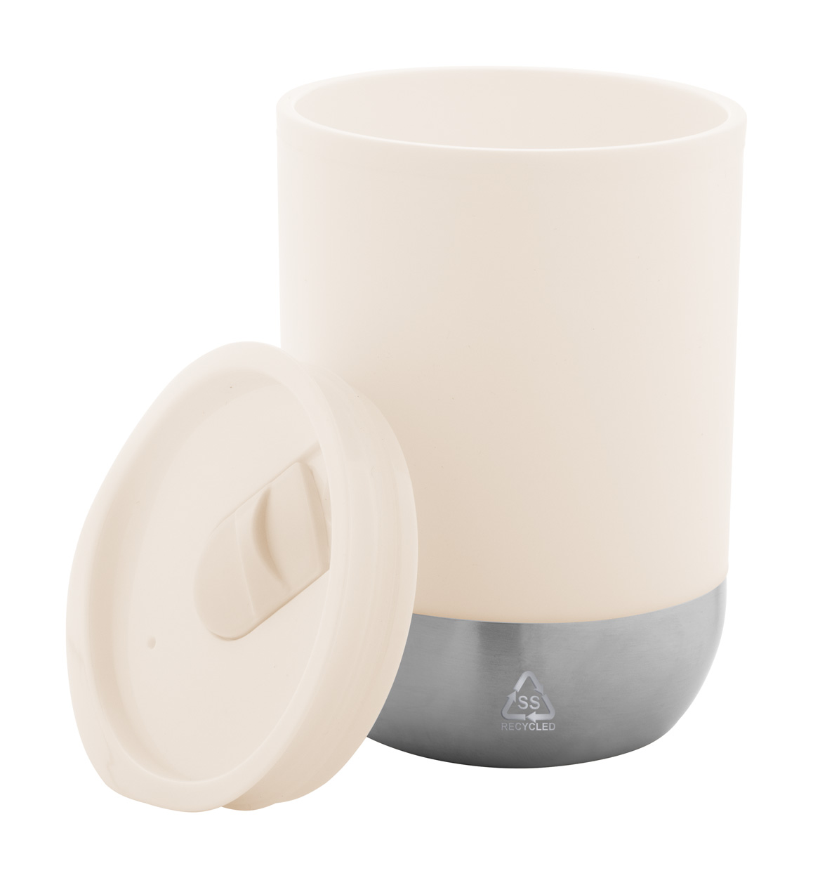 Thermobecher aus doppelwandigem PP-Kunststoff mit recyceltem Edelstahlboden und Trinkdeckel. Füllmenge: 300 ml.