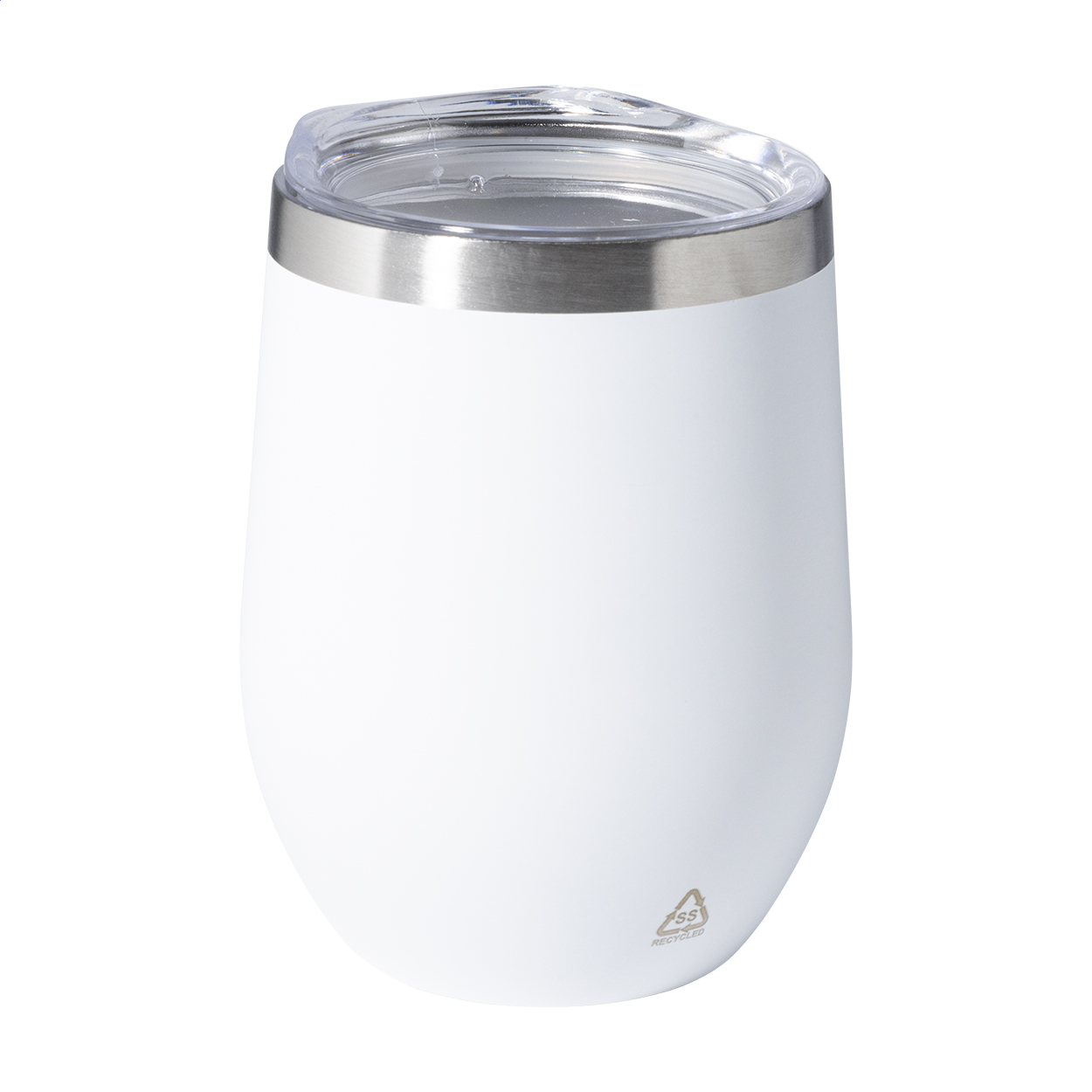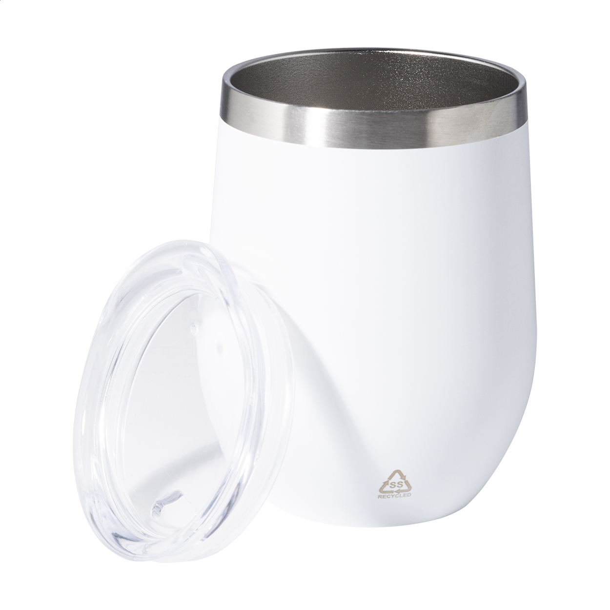 Doppelwandiger Thermobecher aus recyceltem Edelstahl mit Trinkdeckel aus Kunststoff. Füllmenge: 350 ml.