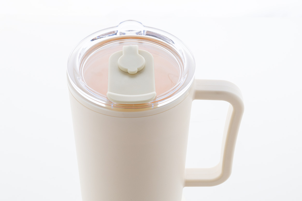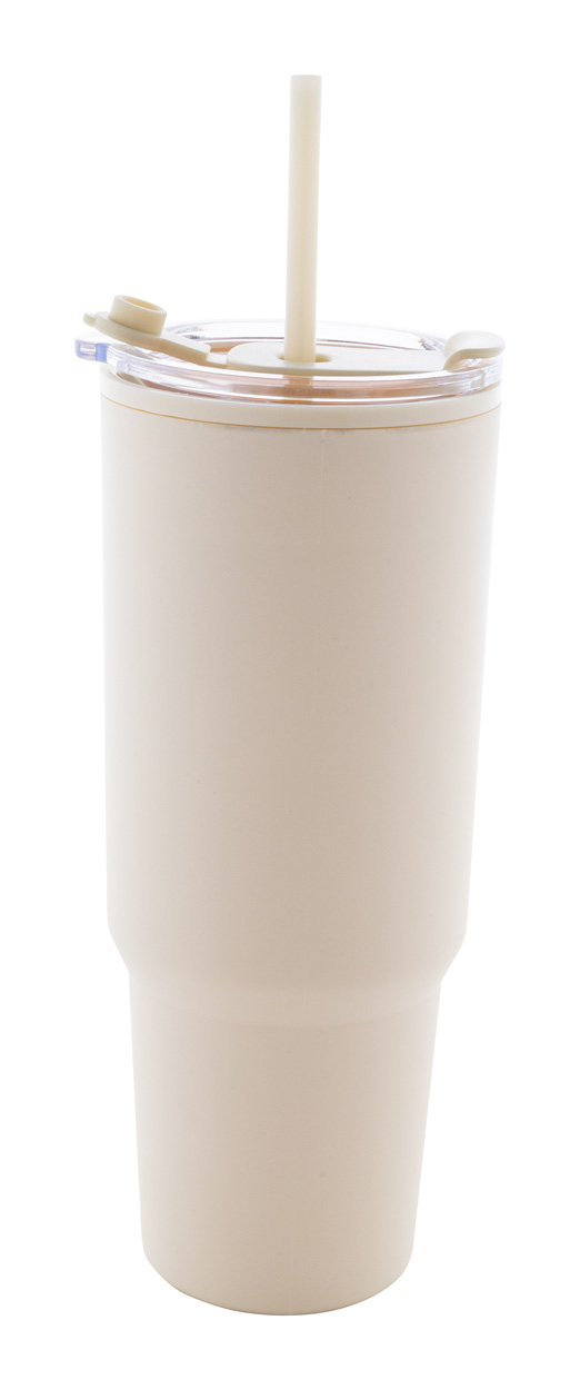Doppelwandiger, isolierter Thermobecher aus PP-Kunststoff mit Trinkdeckel und Strohhalm. Füllmenge: 1100 ml.