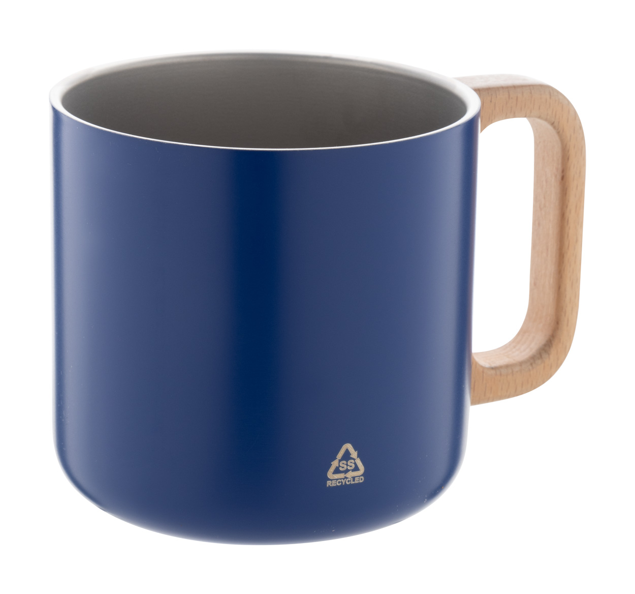 Doppelwandiger Thermobecher aus recyceltem Edelstahl mit Holzgriff. Füllmenge: 350 ml.