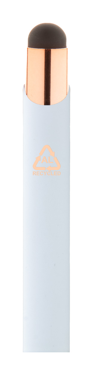 Kugelschreiber mit Touchpen aus recyceltem Aluminium, mit gummierter Oberfläche und roségoldenen Elementen. Mit Spezialbeschichtung für Spiegelgravur in Roségold, blauschreibend.