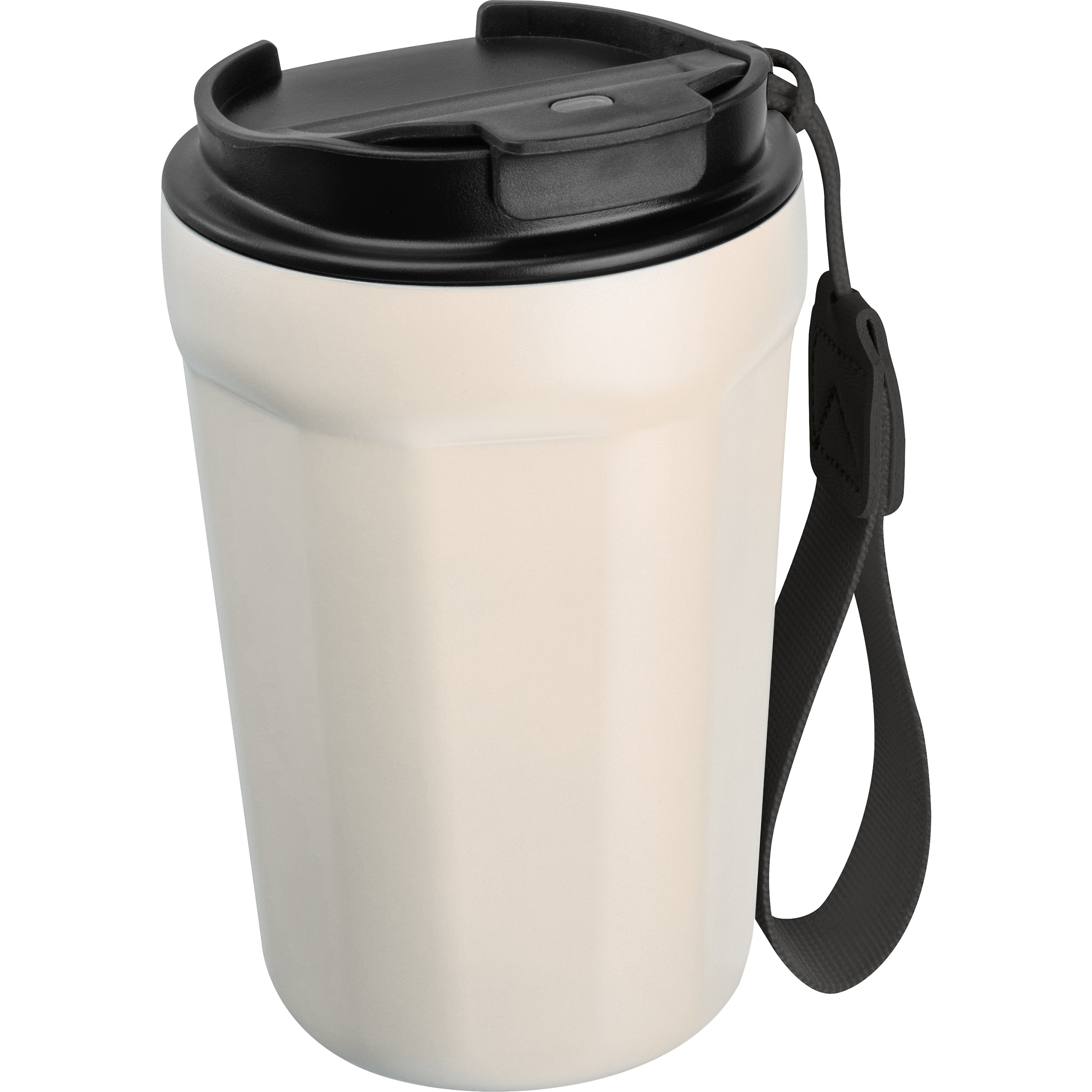Doppelwandiger Vakuum Trinkbecher aus Edelstahl - perfekt für unterwegs. Mit einem Füllvermögen von 350ml und einem auslaufsicheren Deckel. Ihre Werbung gravieren wir auf den Becher.