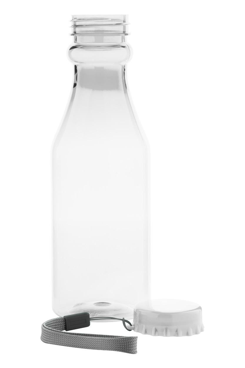 Transparente Trinkflasche aus Kunststoff mit Schraubverschluss-Deckel und Trageschlaufe. Füllmenge: 500 ml. Nicht geeignet für kohlensäurehaltige Getränke.