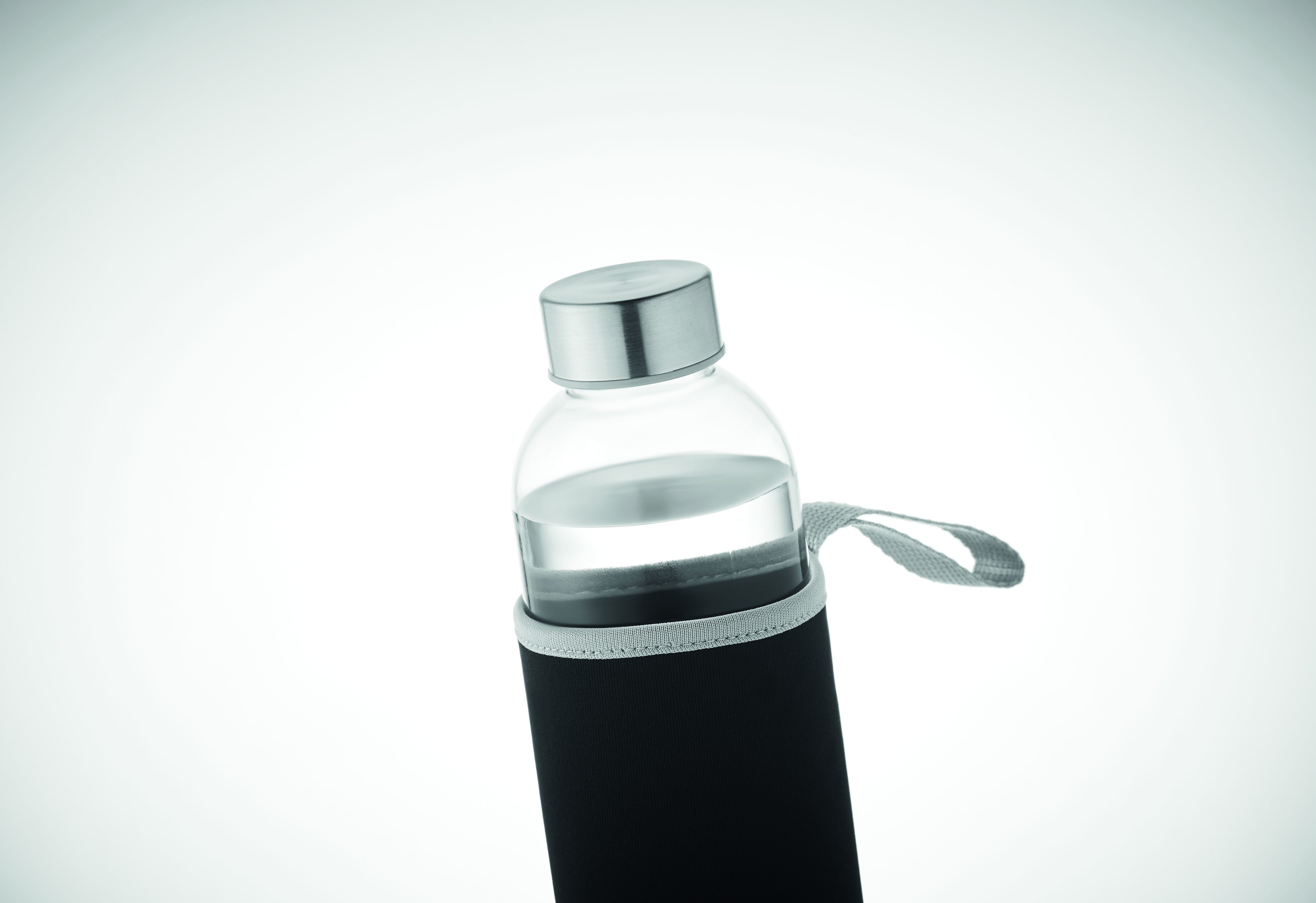 Trinkflasche aus Glas mit Neopren-Schutzhülle. Füllmenge: 750 ml. Nicht geeignet für kohlensäurehaltige Getränke. Auslaufsicher.