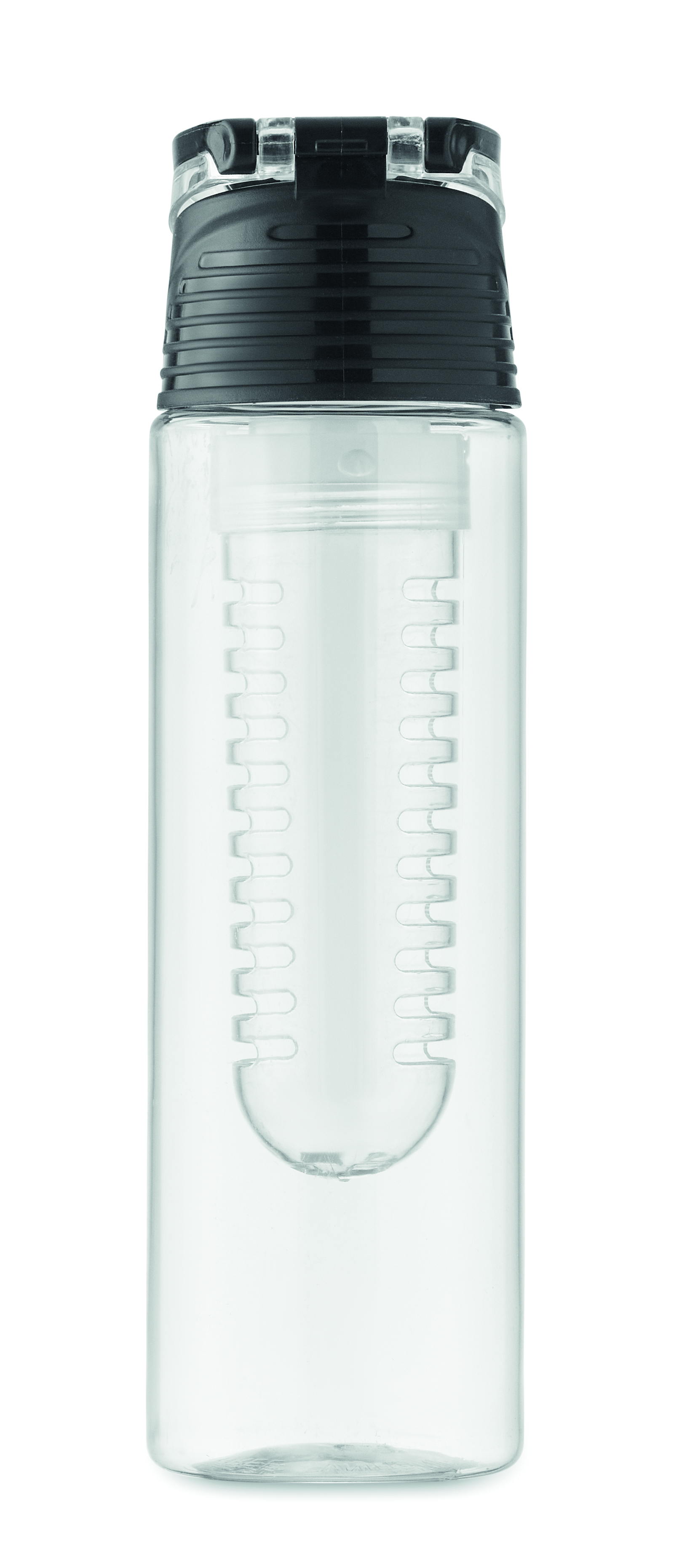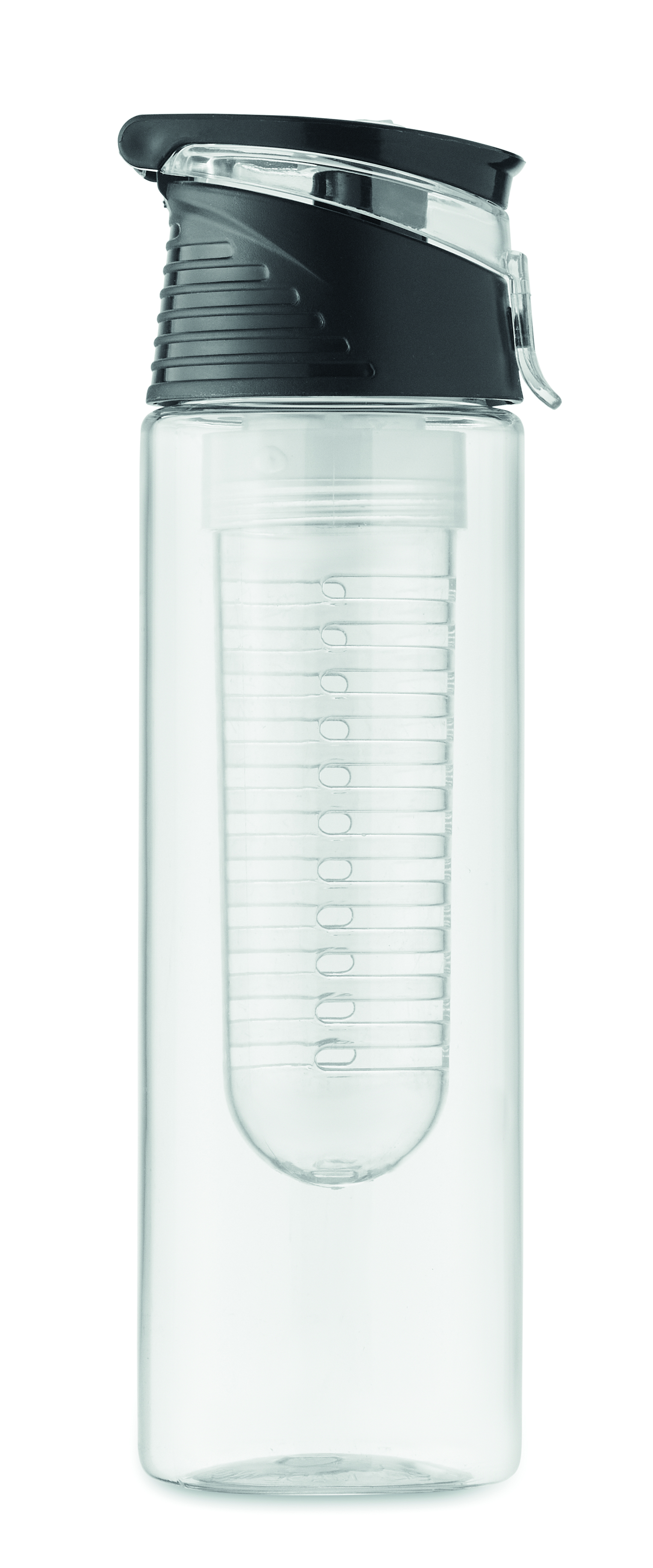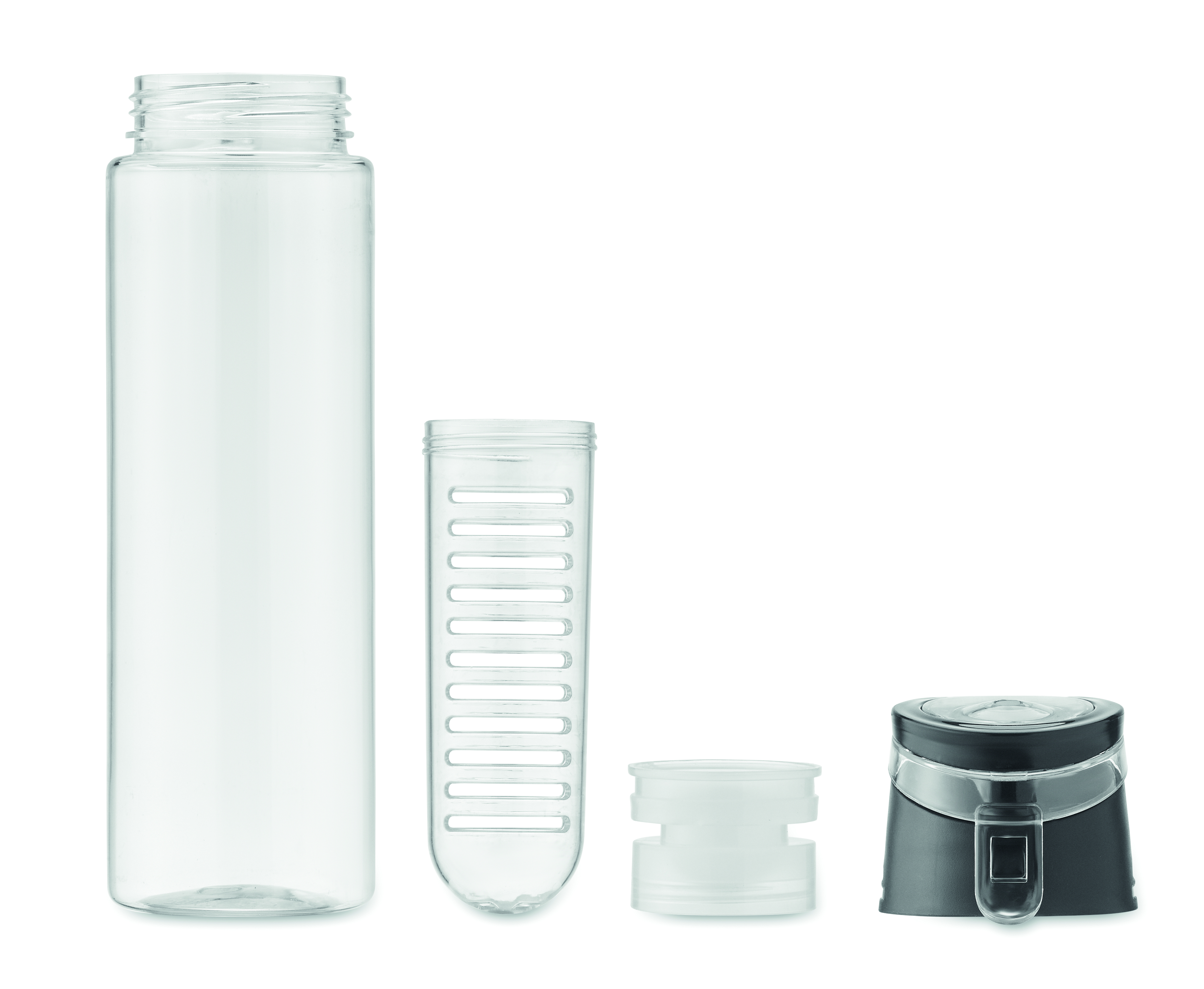 Trinkflasche aus RPET mit entnehmbarem Frucht-Aromafach. Henkel und auslaufsicherer Deckel. Füllmenge: 500 ml.
