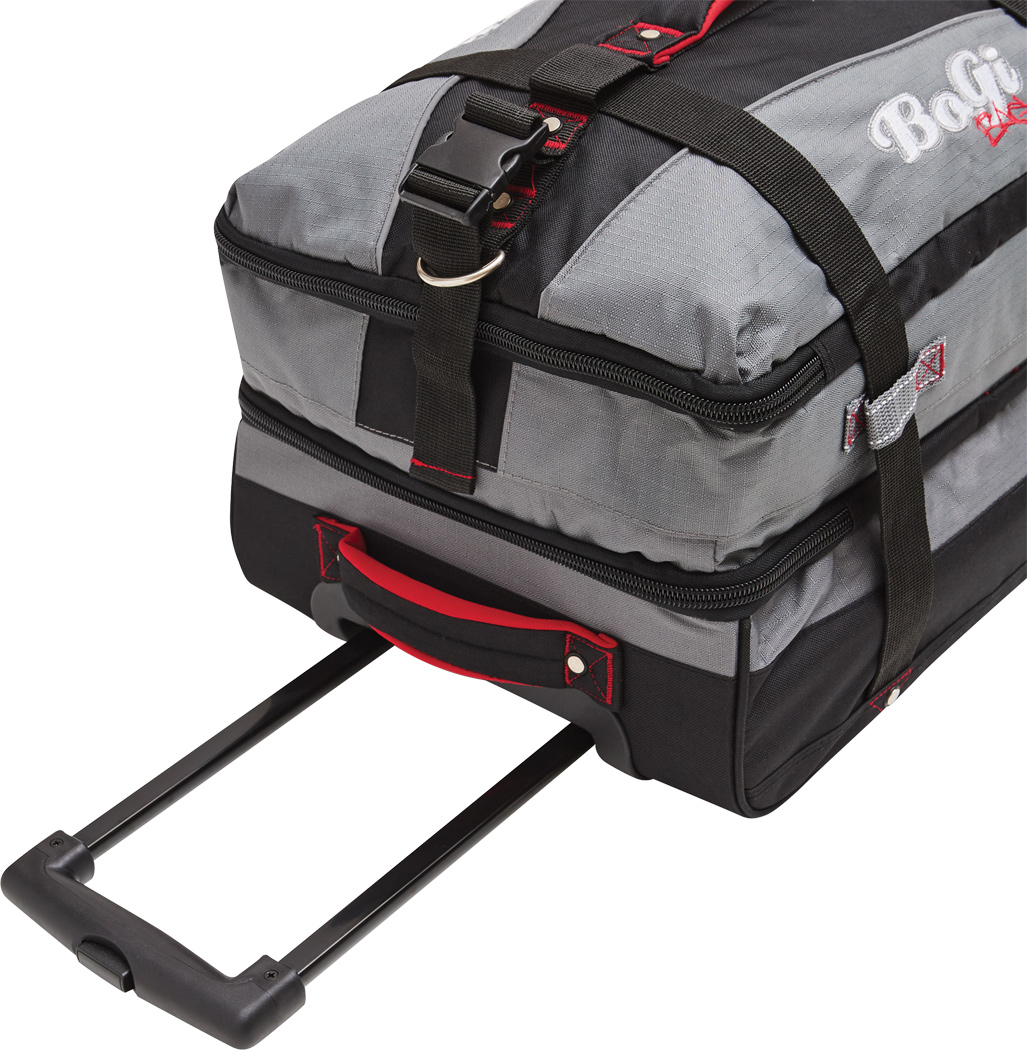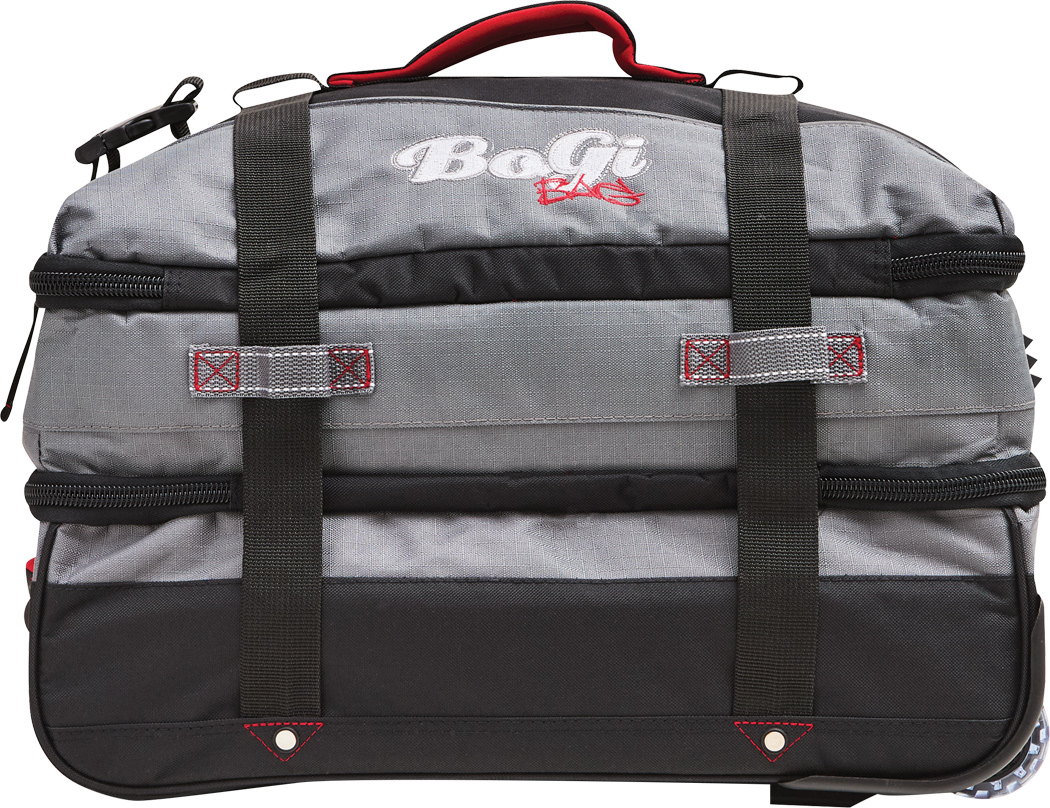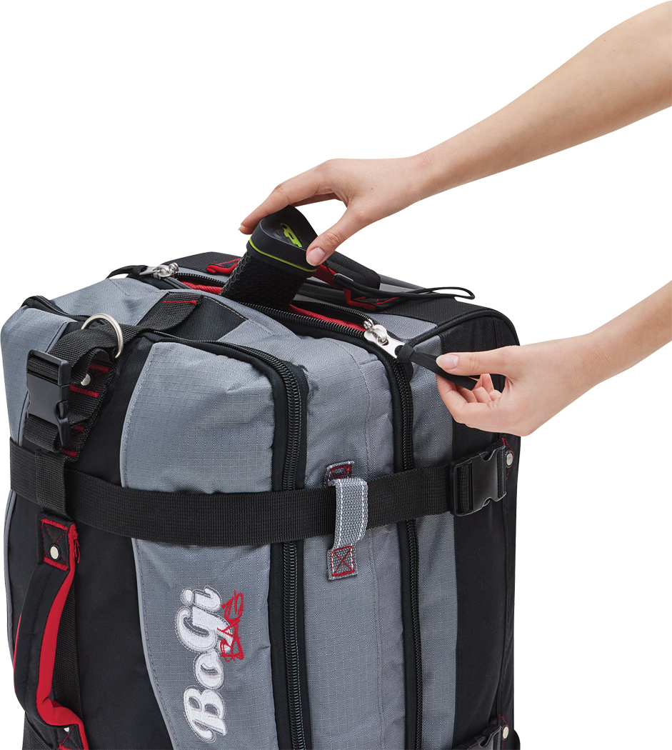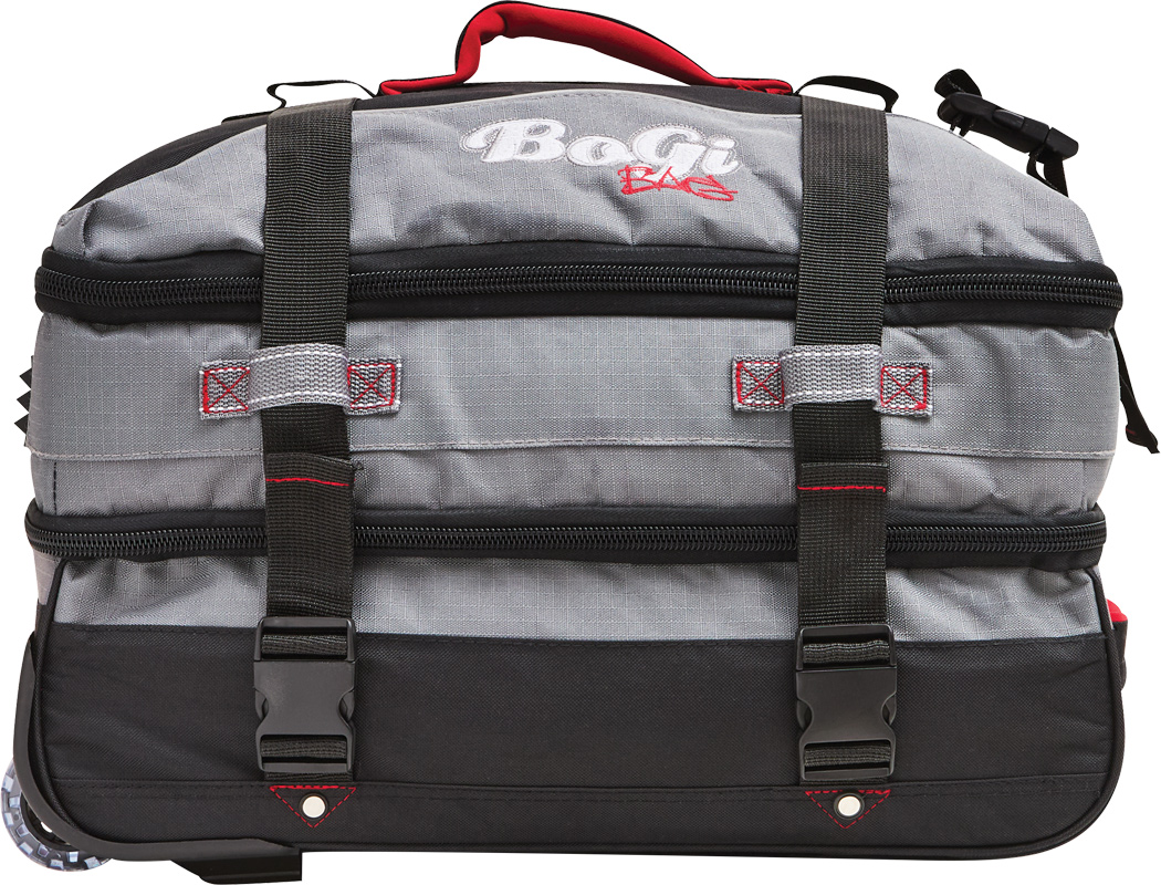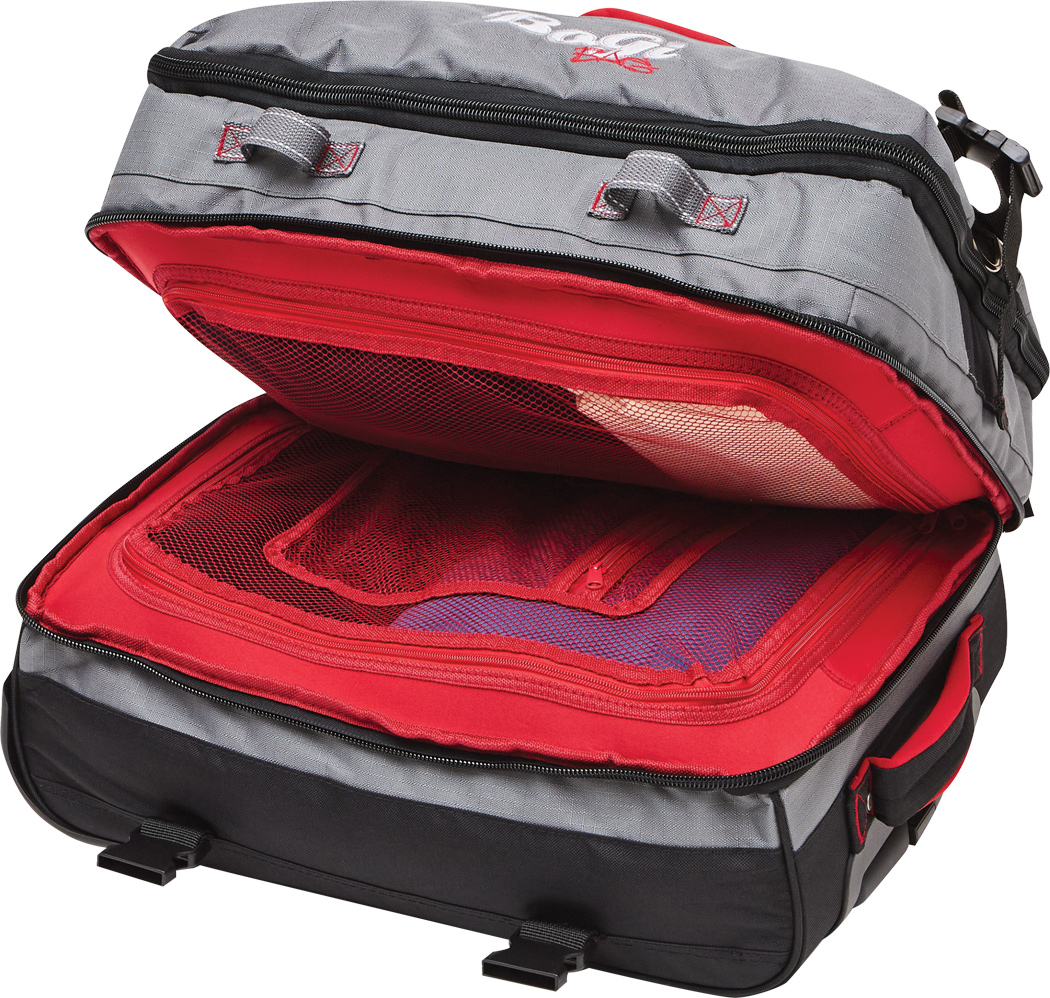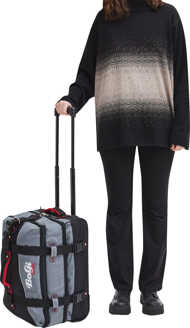 Trolley-Reisetasche BoGi S: getrennte Packebenen mit Reißverschluss, Hauptfach mit 2 Trennwänden, aufgesetzte Netztasche innen, 2 Reißverschluss-Fächer innen, 2 gepolsterte Tragegriffe, versenkbares Trolleygestell, 2 Kompressionsgurte mit Schnappverschluss, Adressfach auf der Rückseite, Leichtlauf-Skaterrollen mit Kantenschutz, 2 Gleitschienen für Treppentransport und Bodenfüße, beigefügtes Zahlenkombinationsschloss
