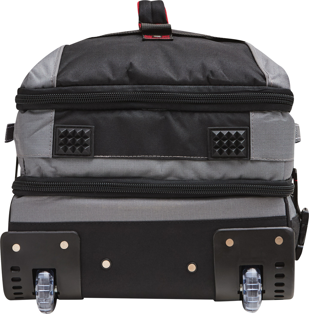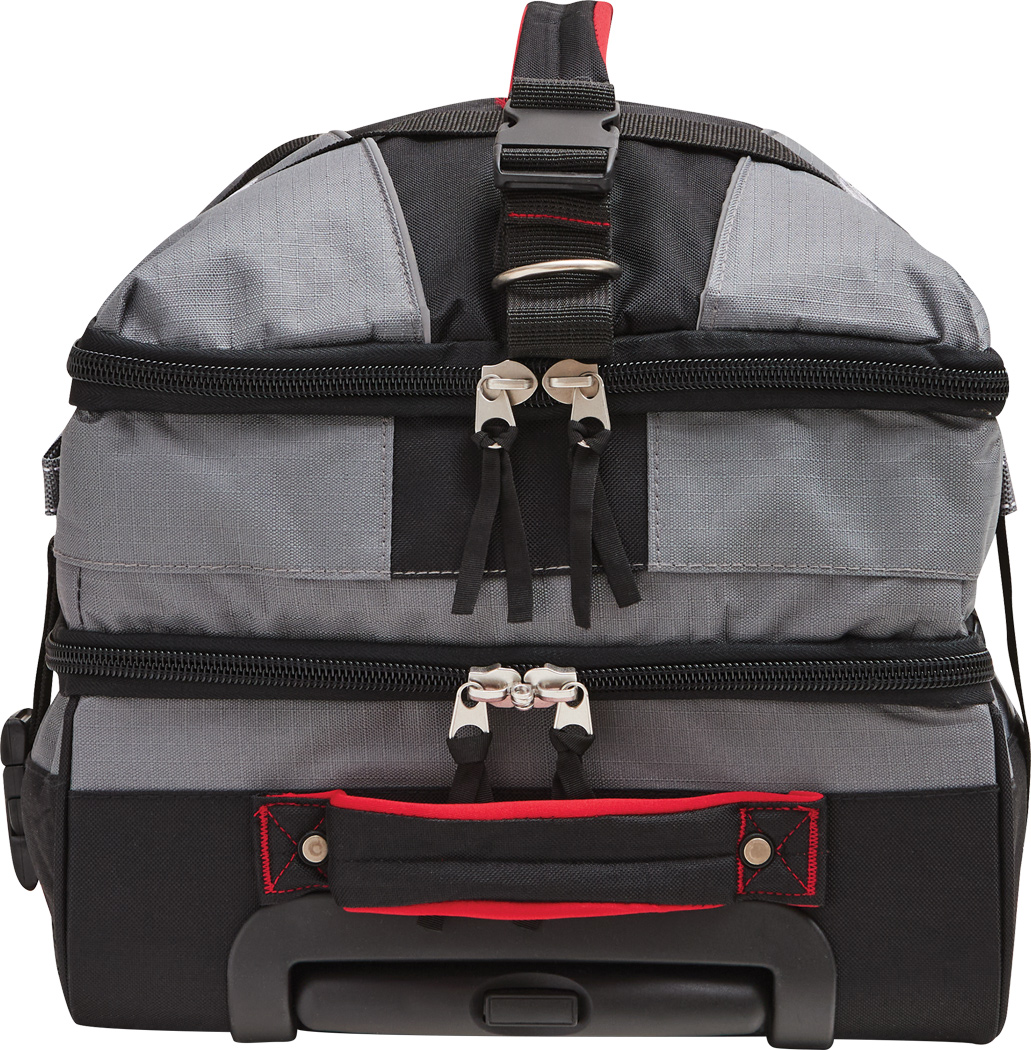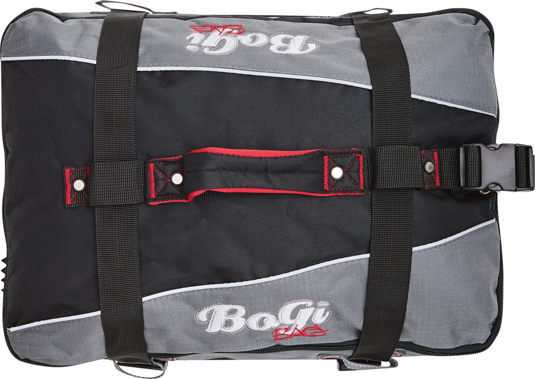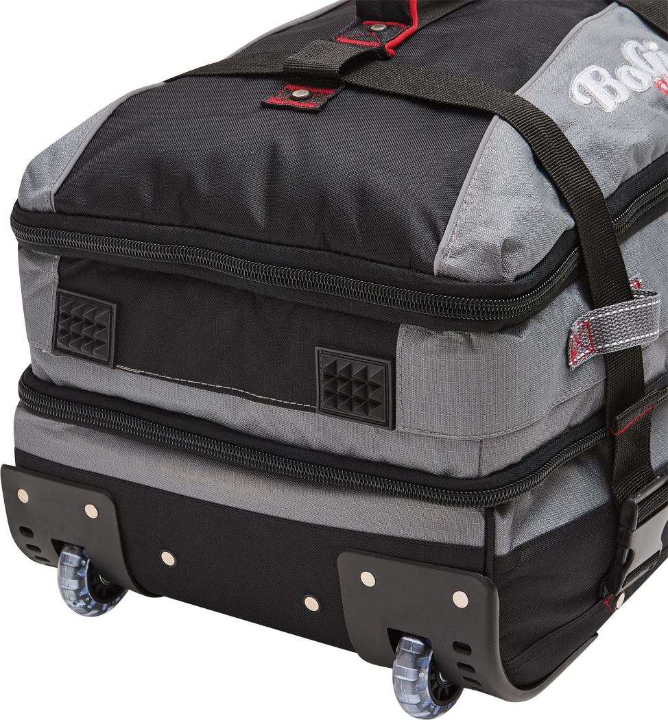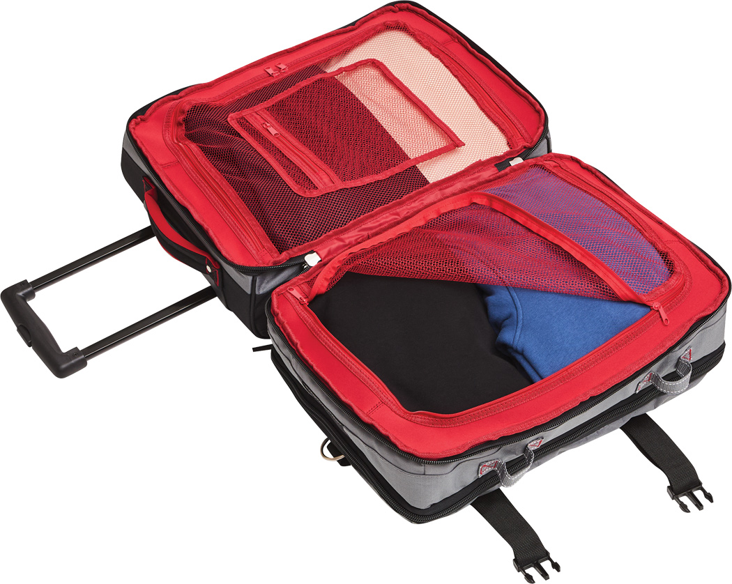 Trolley-Reisetasche BoGi S: getrennte Packebenen mit Reißverschluss, Hauptfach mit 2 Trennwänden, aufgesetzte Netztasche innen, 2 Reißverschluss-Fächer innen, 2 gepolsterte Tragegriffe, versenkbares Trolleygestell, 2 Kompressionsgurte mit Schnappverschluss, Adressfach auf der Rückseite, Leichtlauf-Skaterrollen mit Kantenschutz, 2 Gleitschienen für Treppentransport und Bodenfüße, beigefügtes Zahlenkombinationsschloss