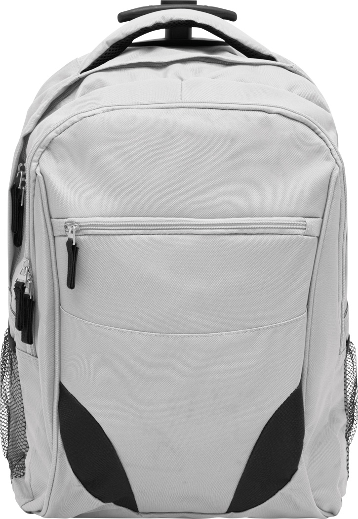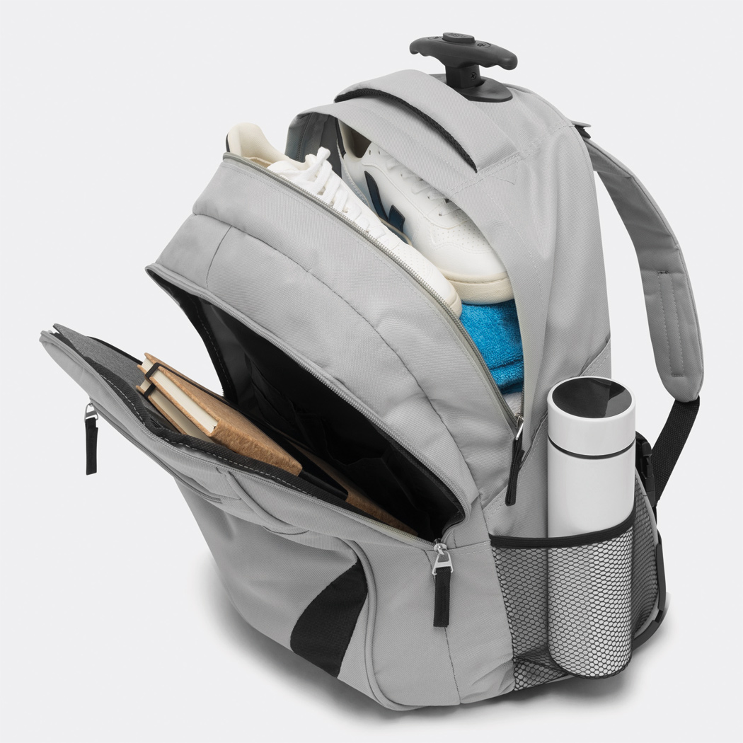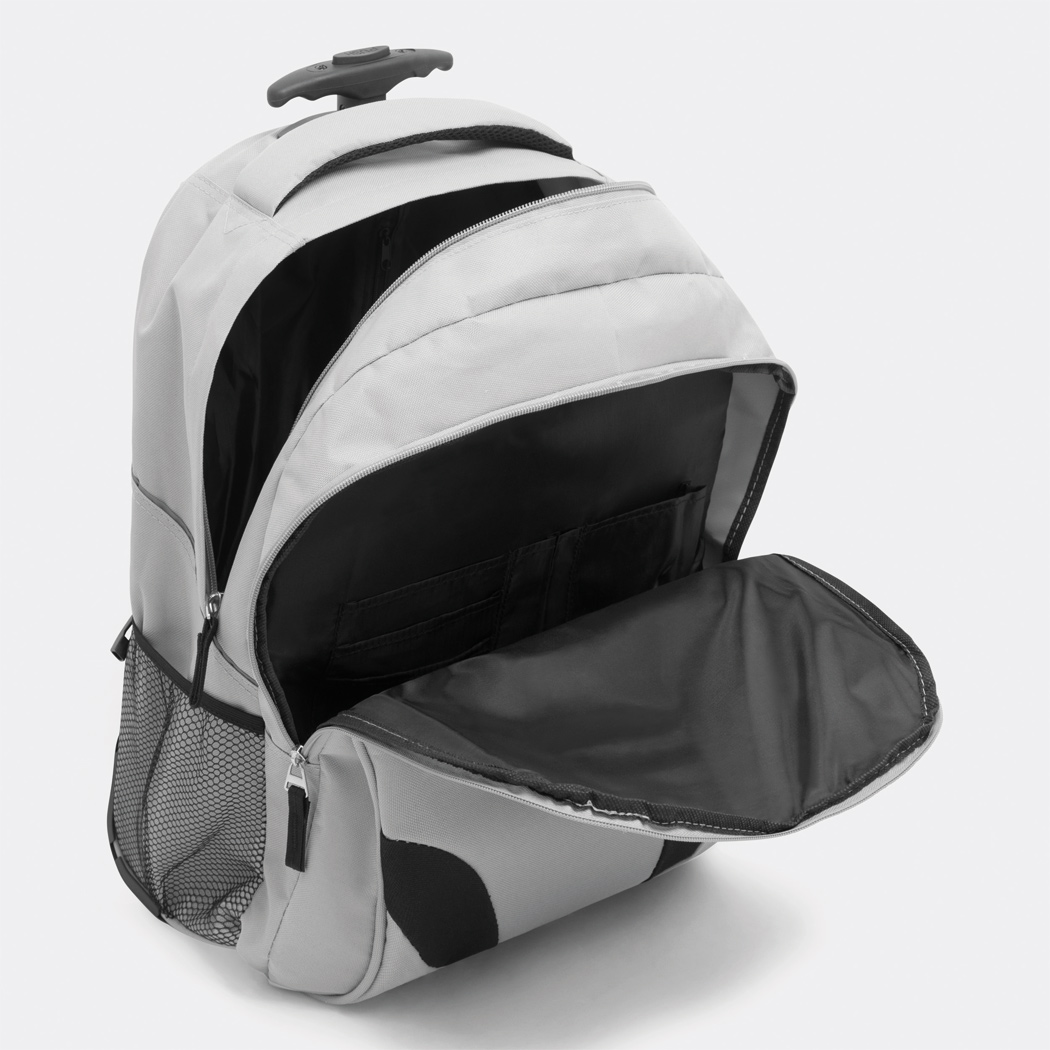 Trolley-Rucksack TRAILER: kleine Reißverschluss-Vortasche, große Reißverschluss-Vortasche mit Organizer, Reißverschluss-Hauptfach mit gepolstertem Laptopfach, 2 seitliche Netzfächer, gepolsterter Rücken und Schultergurte, Reißverschluss-Fach zum Verstauen der Schultergurte, mit Einhand-Teleskopgestell, Tragegriff, 2 leichtlaufende Skaterrollen inkl. Kleiderschutz