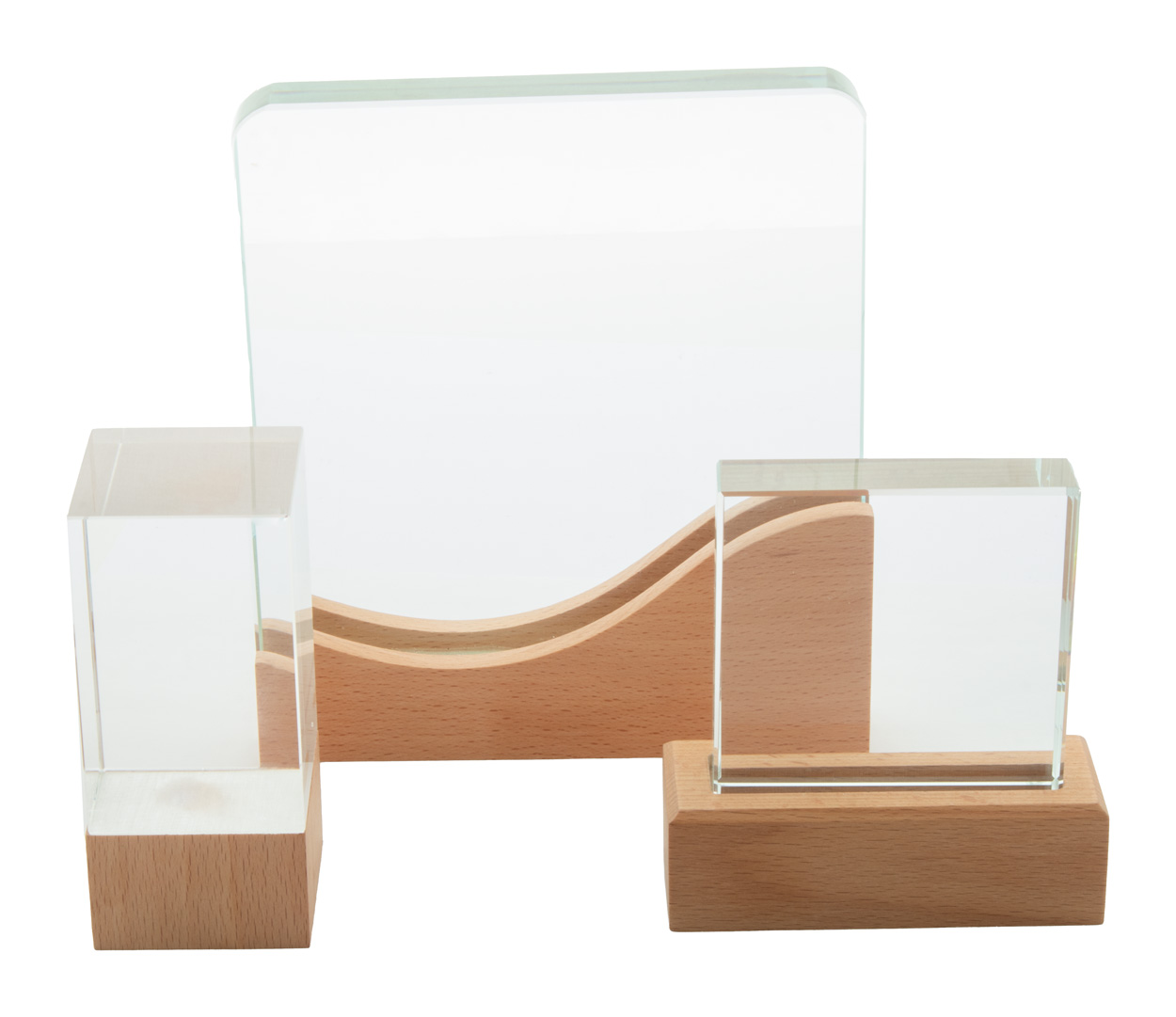 Trophäe aus Glas mit Boden aus Bambus. Einzeln Kraftpapier-Geschenkbox.
