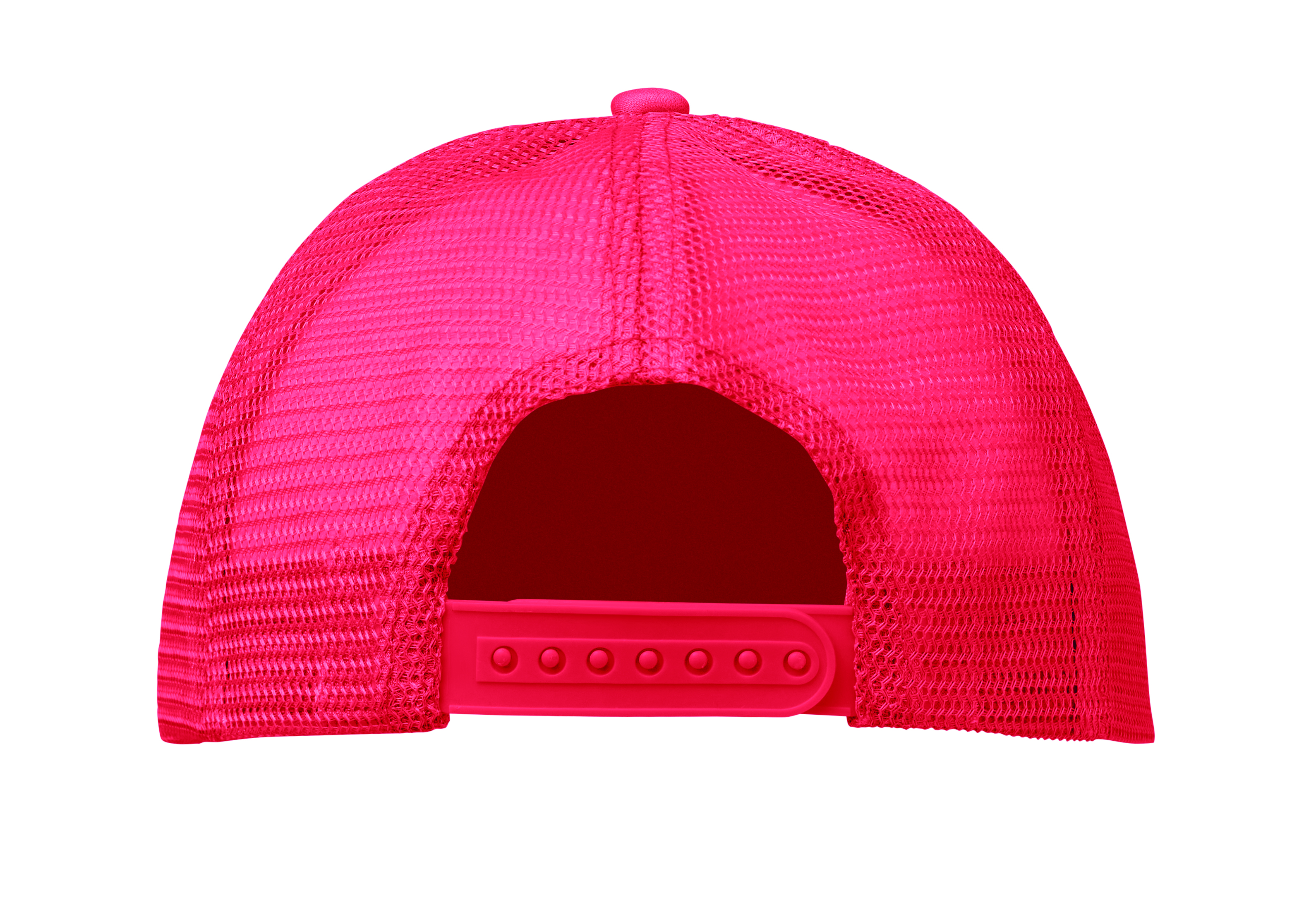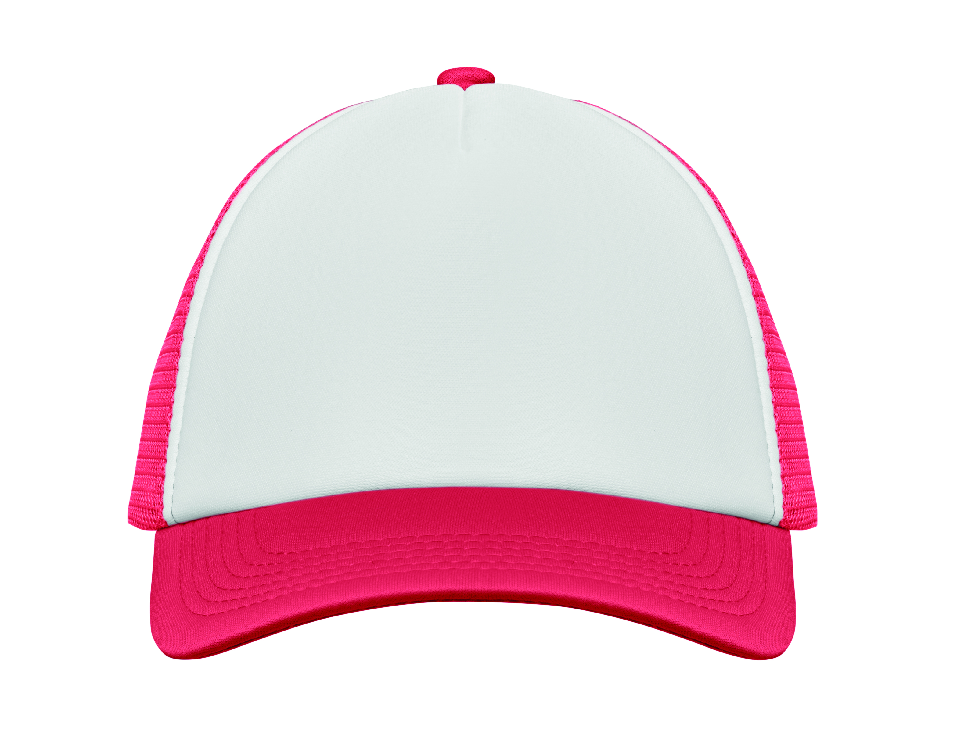 Trucker Kappe. 5 Panele. 140-150 gr / m² Polyester. Verstellbarer Kunststoffverschluss. Weißes Frontpanel, farbiger Kappenschirm aus Polyester Jersey mit Schaum-Verstärkung. Weitere Panele aus Mesh. Größe 7 1/4.
