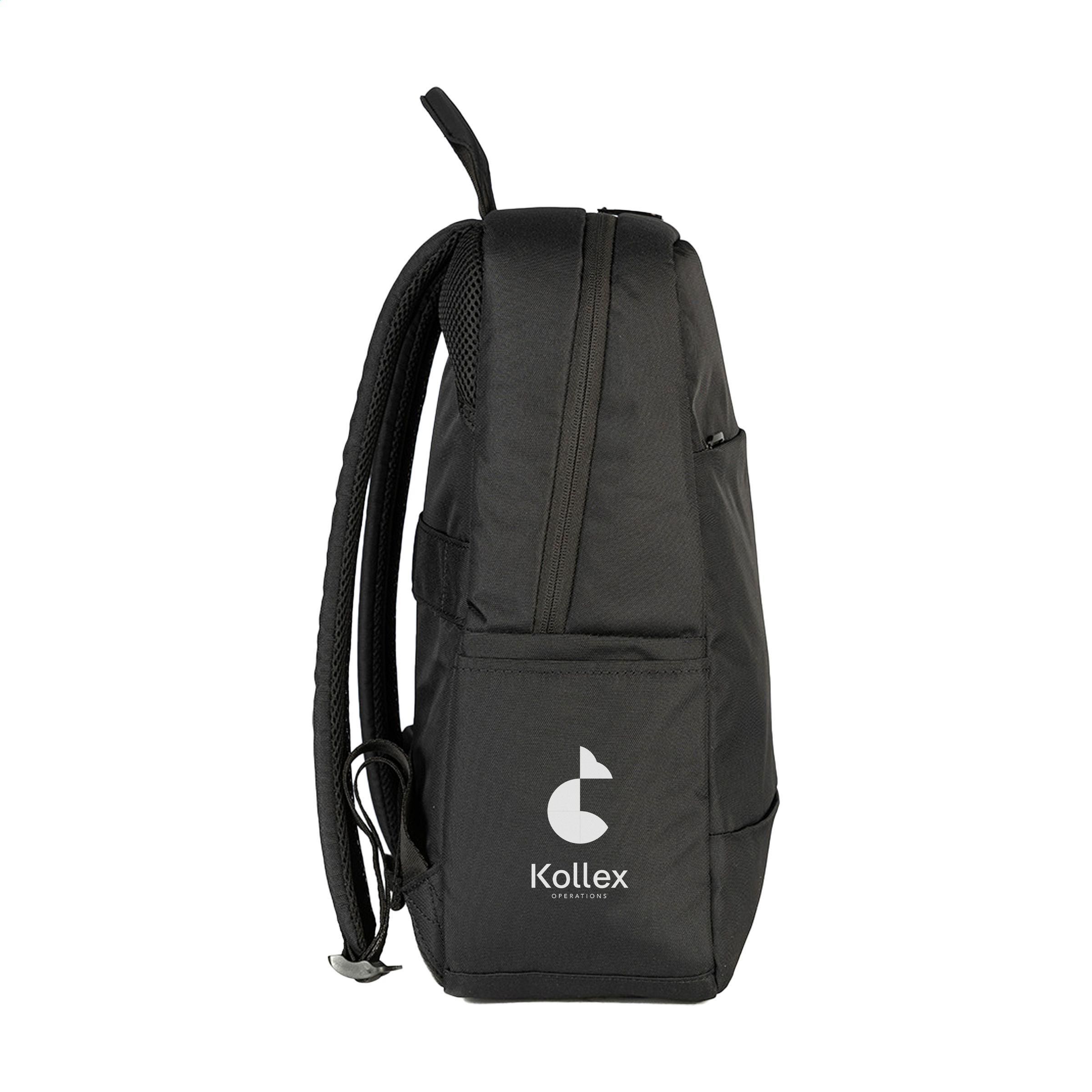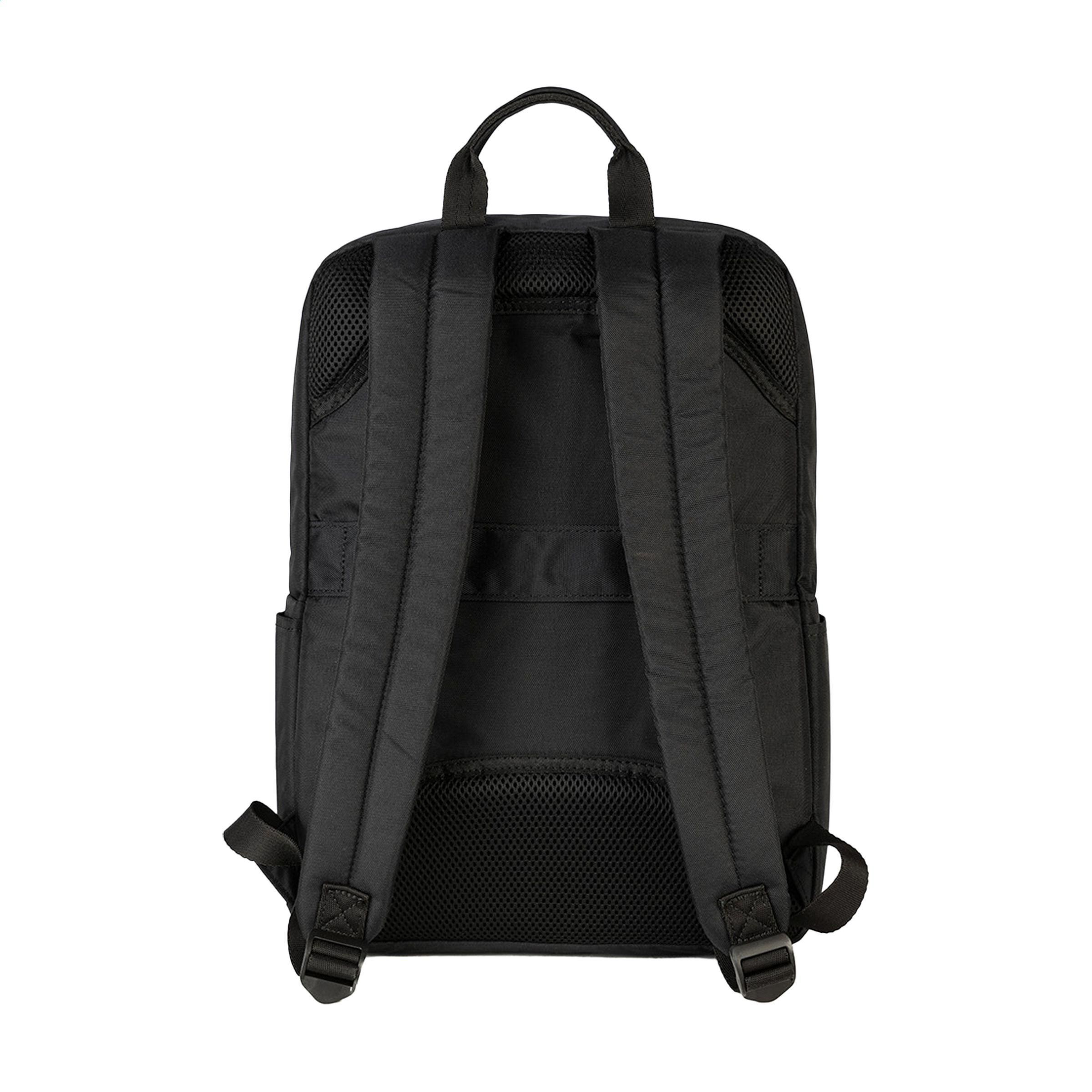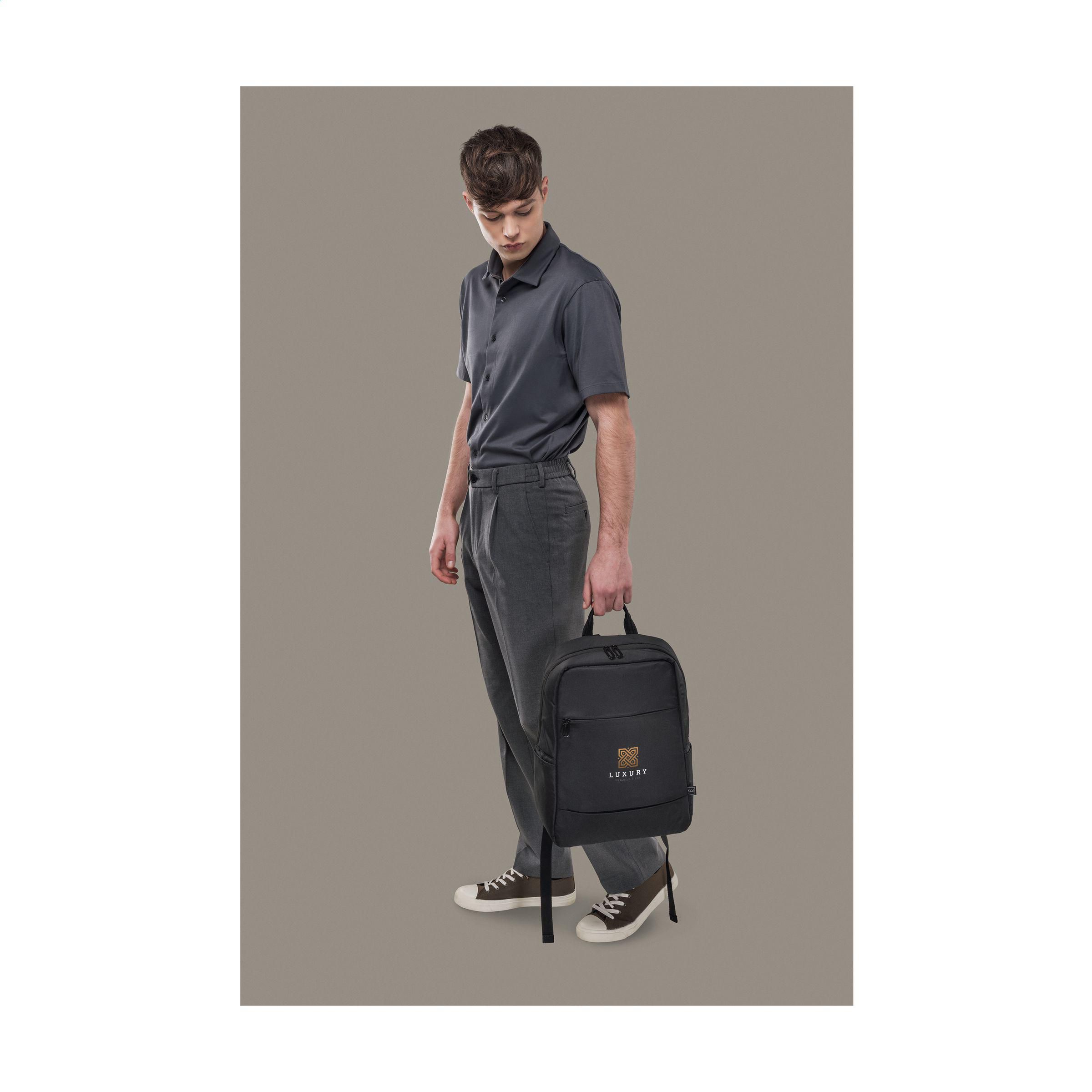 Leichter Laptop-Rucksack der italienischen Marke Tucano. Der moderne, kompakte Rucksack ist aus recyceltem Kunststoff hergestellt, darunter 12 recycelte PET-Flaschen. Das geräumige Fach ist mit einem Netzfach mit Reißverschluss ausgestattet und verfügt über ein stoßfestes Fach für Laptops bis zu 15,6 Zoll oder MacBook Pro 16 Zoll. Das Reißverschlussfach auf der Vorderseite verfügt über einen Organizer für Karten, Handy und Stifte. Komplett gefüttert. Die verstellbaren, gepolsterten Schultergurte und die ergonomische Rückseite sorgen für zusätzlichen Tragekomfort. Mit praktischem Trolley-Gurt und Seitentaschen für eine Trinkflasche und einen Regenschirm. Ein praktischer Rucksack für Arbeit und Freizeit. Fassungsvermögen ca. 20 Liter.