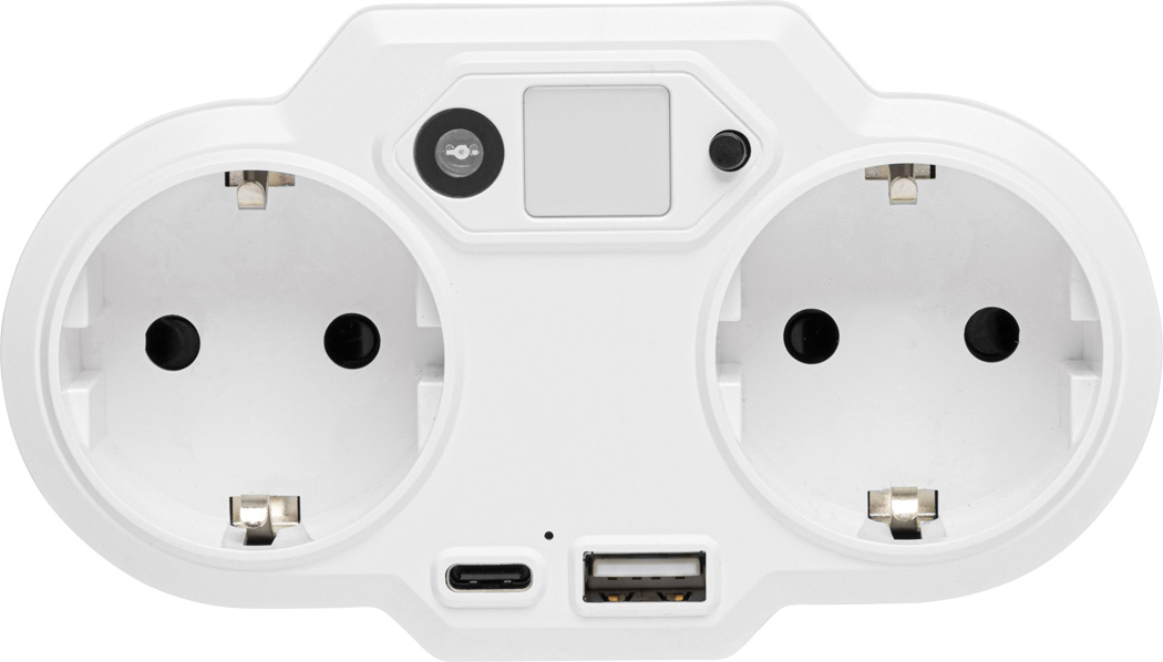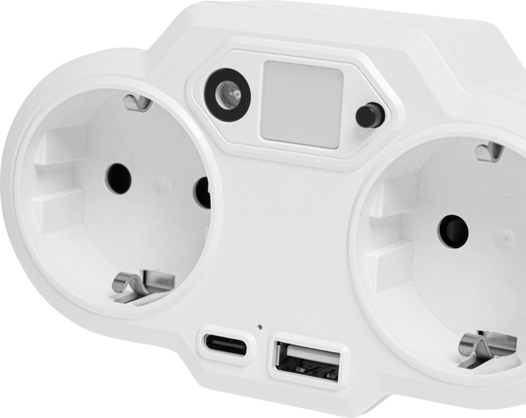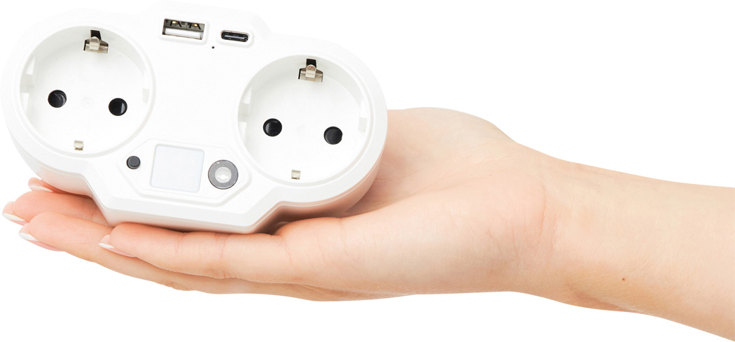 USB-Adapter-Stecker-Netzteil mit Nachtlicht ENDLESS POWER NIGHT: 2 geerdete Schutzkontakt-Steckdosen mit Kindersicherung, 1 Port USB A, 1 Port USB Typ C, Gesamt-Ausgangsleistung USB: max. 3,4A, Ausgangsleistung Schutzkontakt-Stecker max. 3.250W, Nachtlicht mit Lichtsensor und Ein- / Ausschalter, blaue Status LED, nicht geeignet für UK, in Box