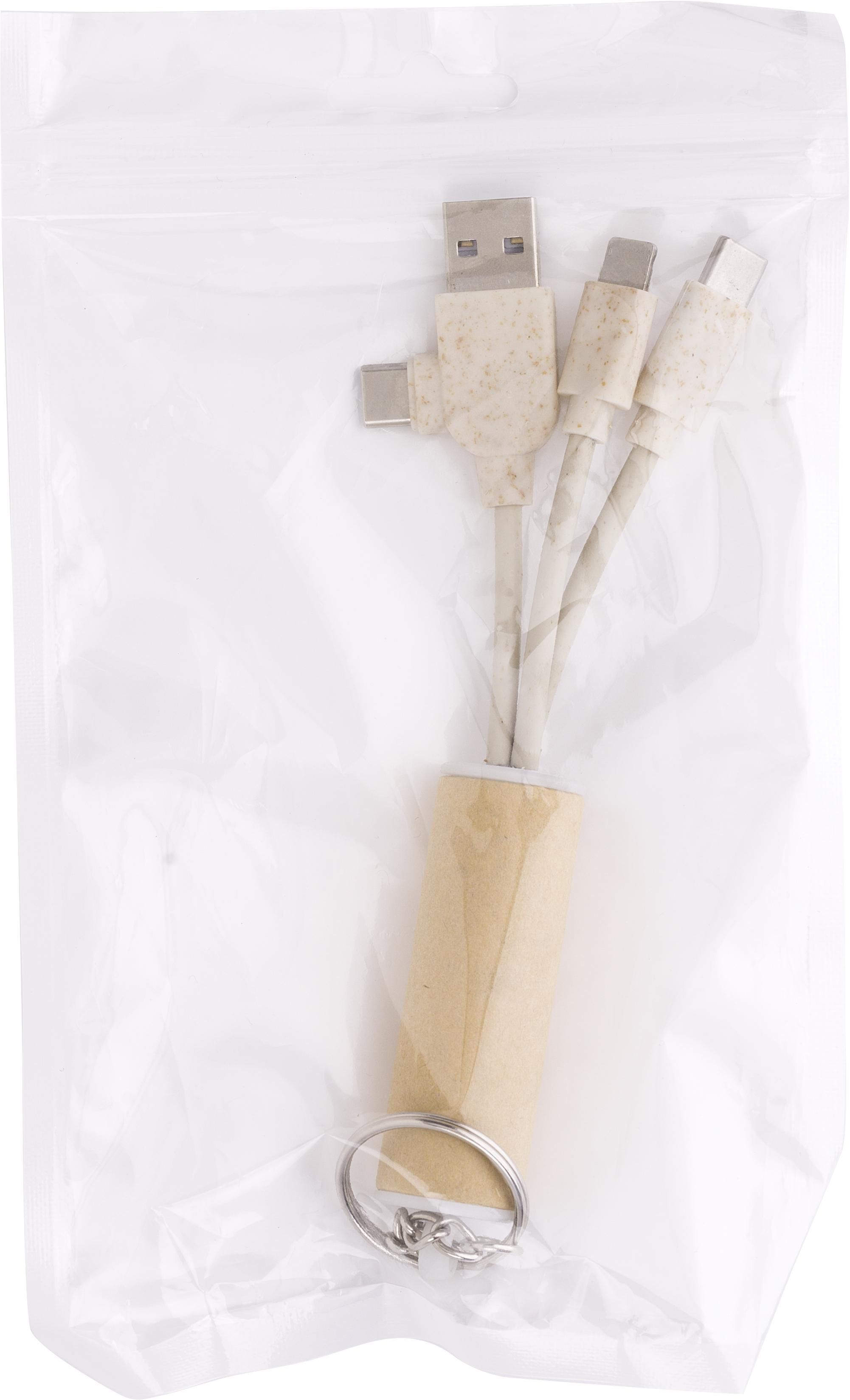 USB-Ladegerät-Schlüsselanhänger mit Papierdetails. Mit USB-C, Micro-USB und Lightning. Einzeln verpackt in einer braunen Kartonbox.