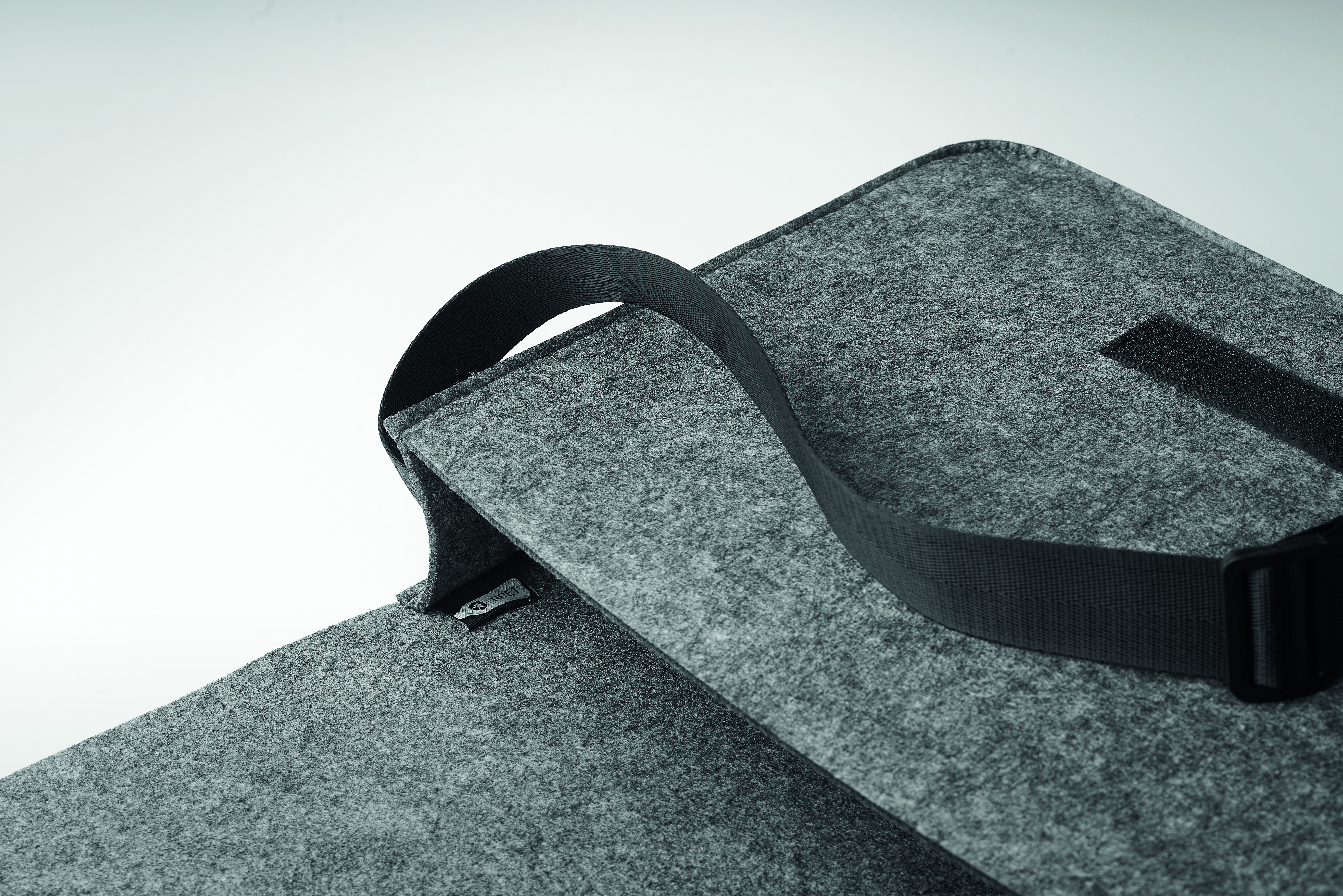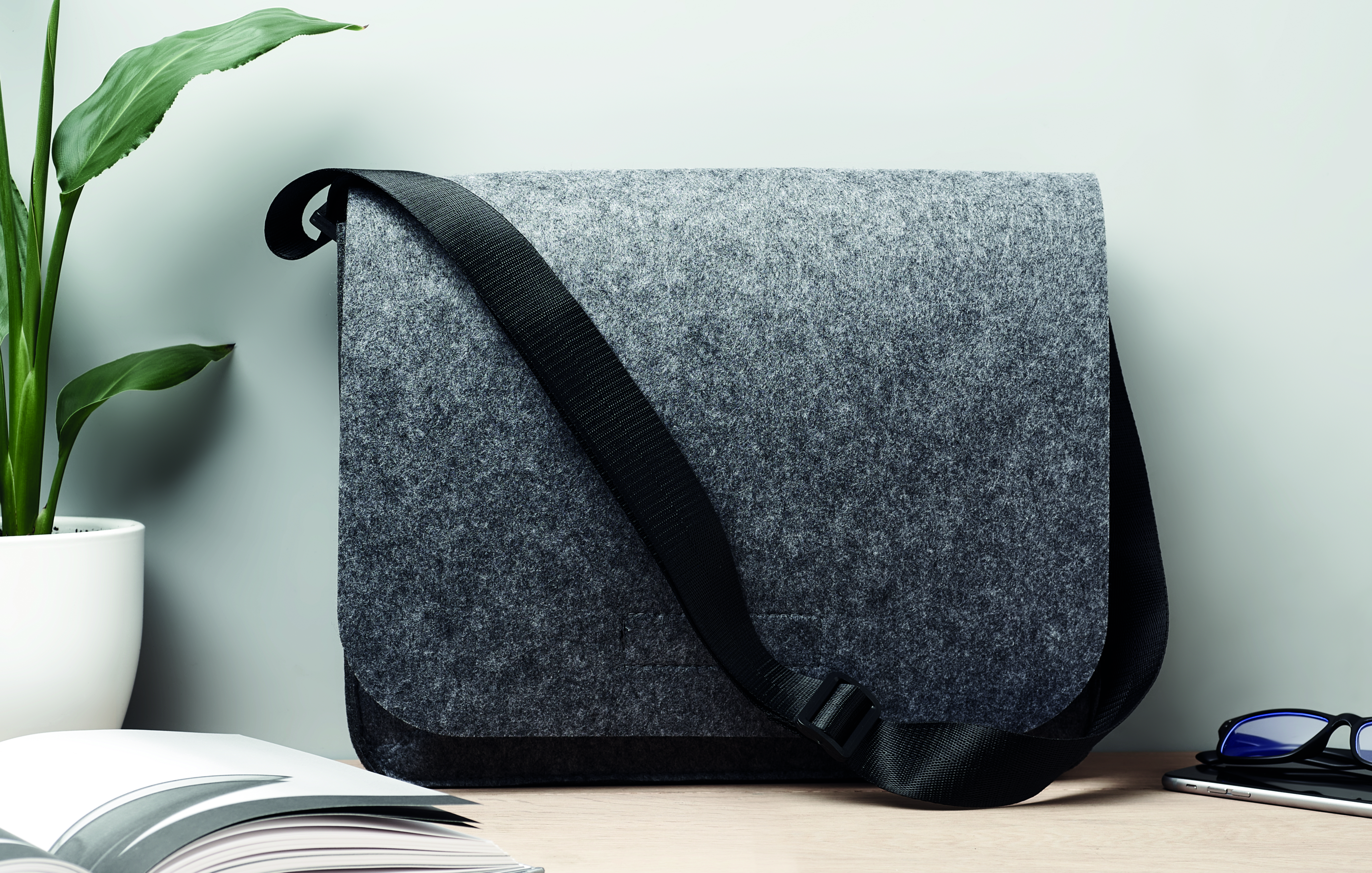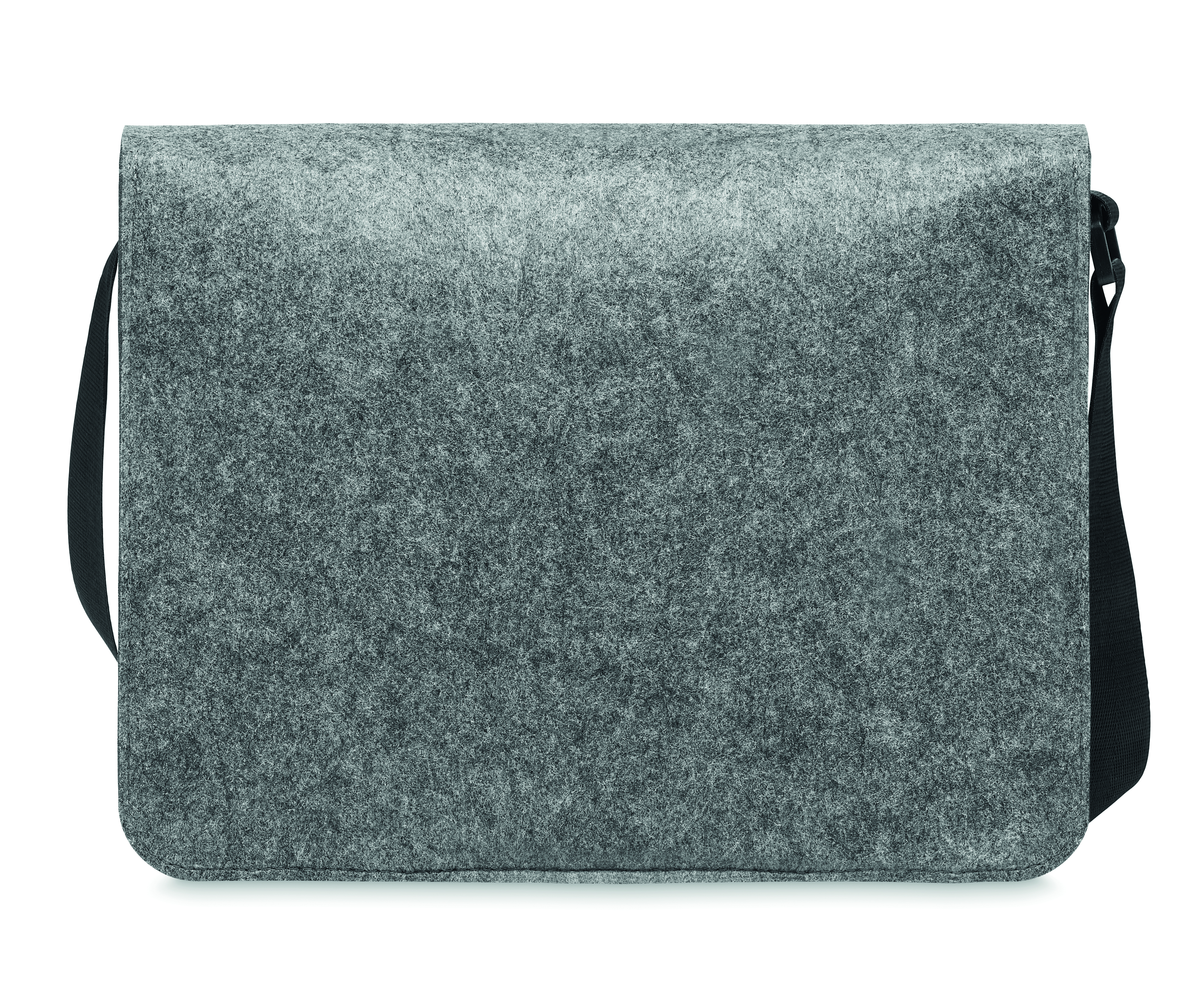 Umhängetasche aus RPET-Filz. Klettverschluss und Umhängegurt. Bietet Platz für einen 15'' Laptop.