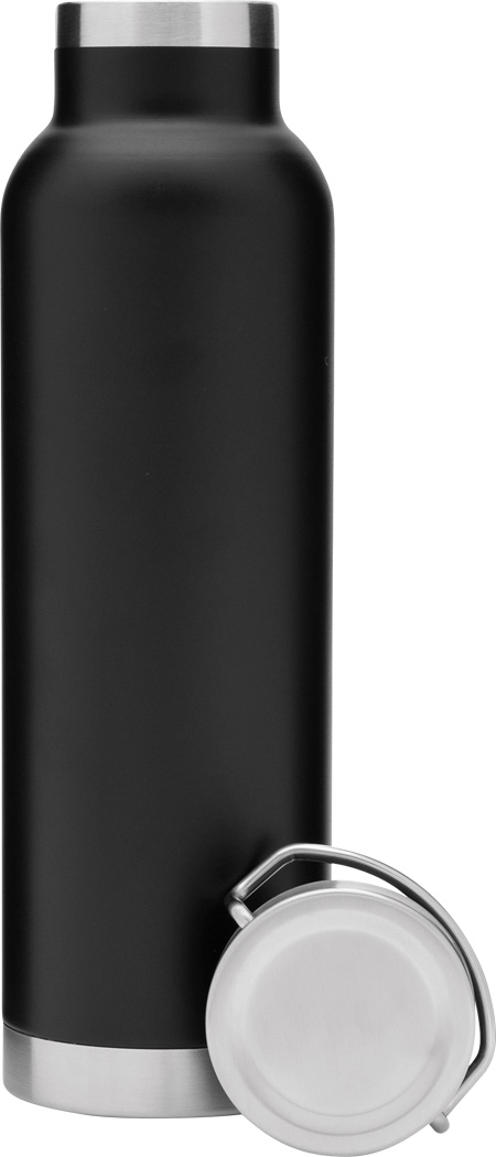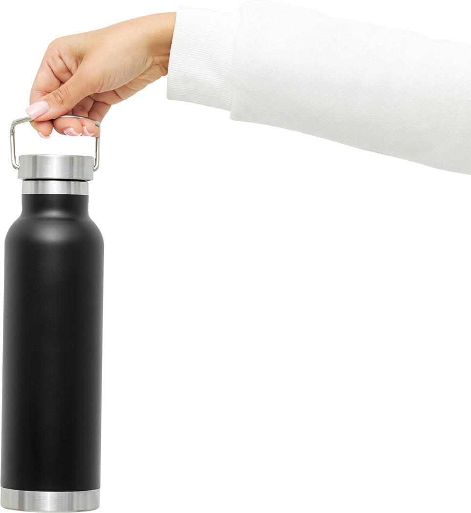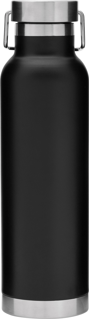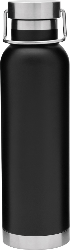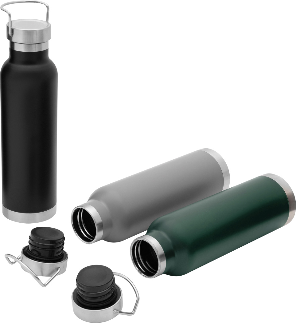 Edelstahl-Isolierflasche MILITARY, Vakuum-Kupfer isoliert: doppelwandig, innen und außen aus Edelstahl, silberner Deckel mit Schraubverschluss, Silikon-Dichtring und Tragegiff, Füllmenge ca. 650 ml, hält ca. 12 Stunden warm und bis zu 24 Stunden kalt, in Box