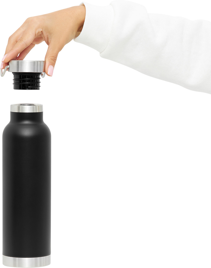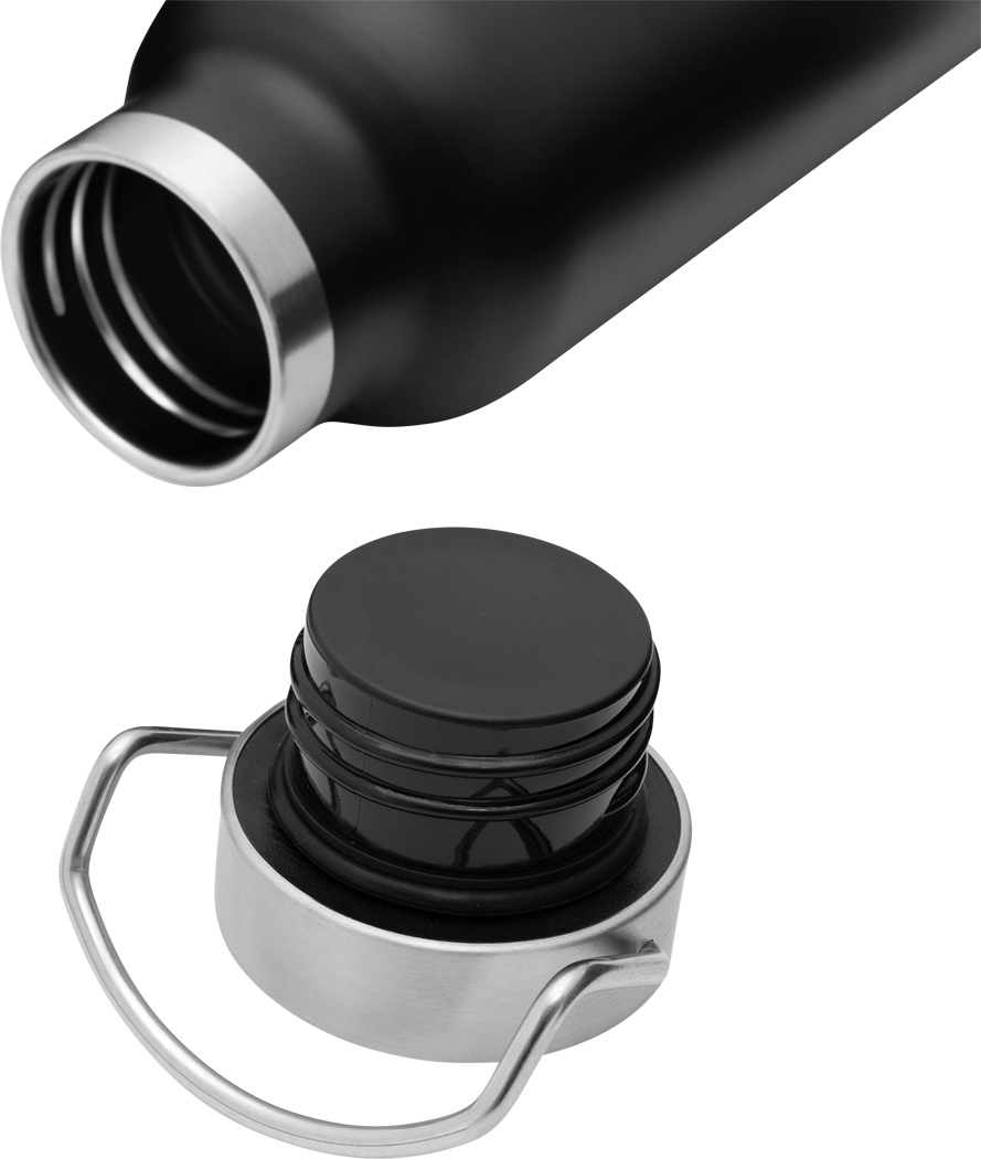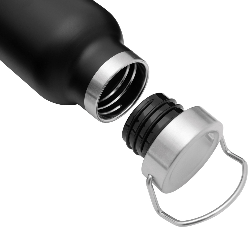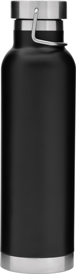 Edelstahl-Isolierflasche MILITARY, Vakuum-Kupfer isoliert: doppelwandig, innen und außen aus Edelstahl, silberner Deckel mit Schraubverschluss, Silikon-Dichtring und Tragegiff, Füllmenge ca. 650 ml, hält ca. 12 Stunden warm und bis zu 24 Stunden kalt, in Box