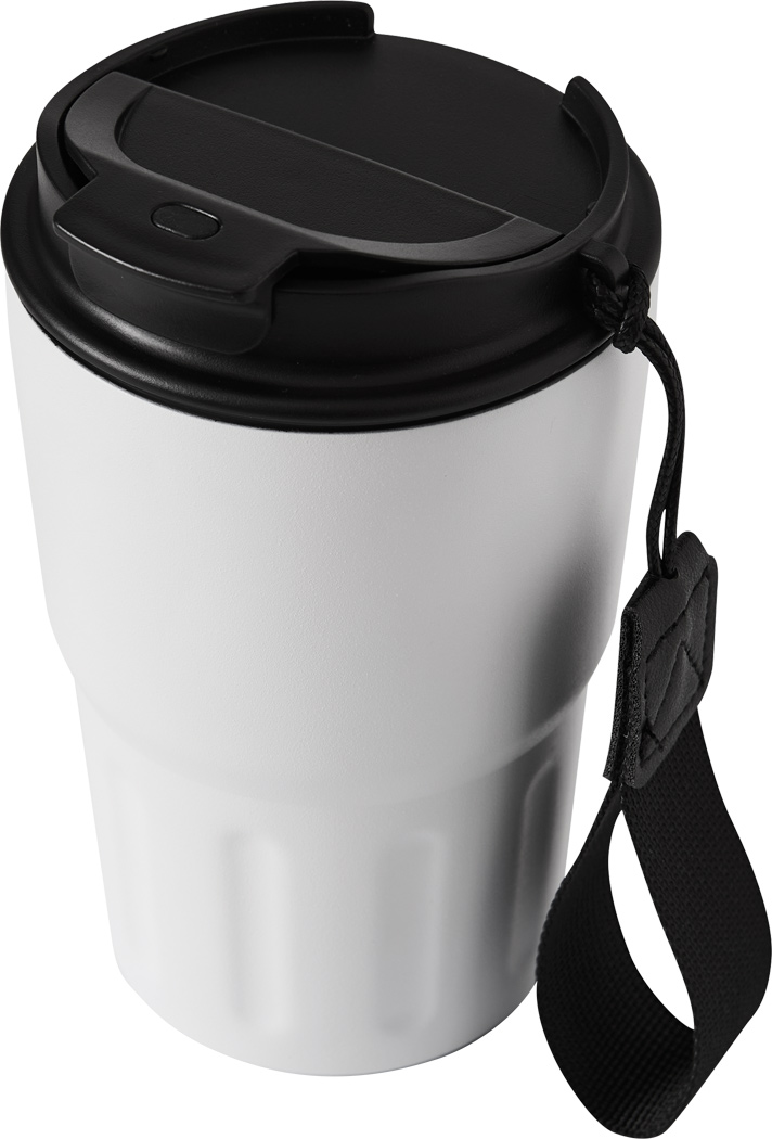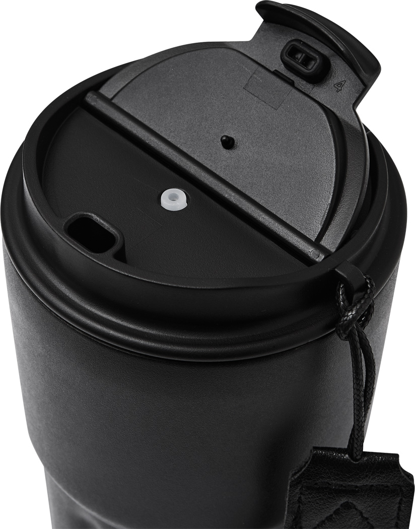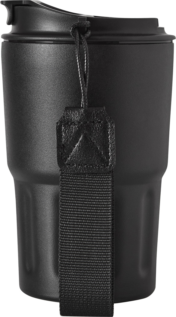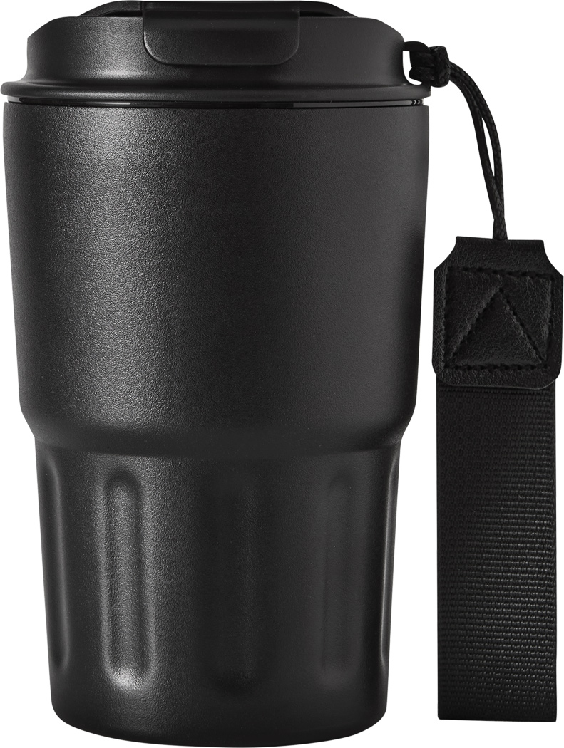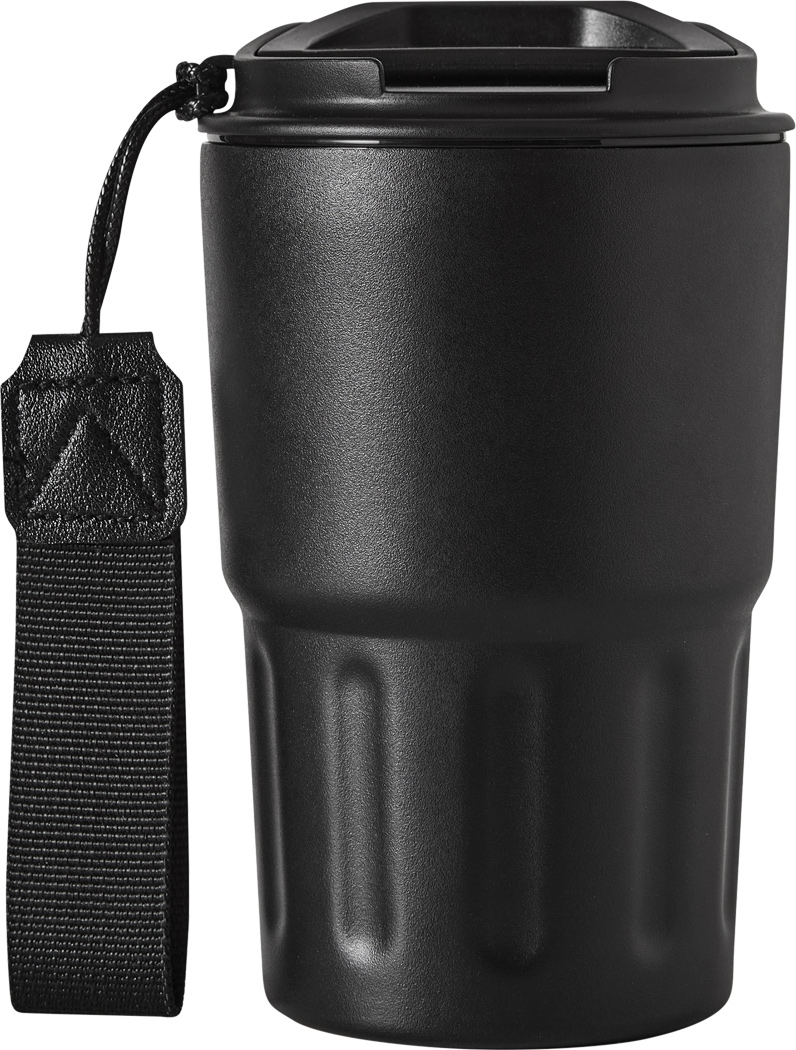 Vakuum-Trinkbecher TRAVEL MUG, doppelwandig: innen und außen aus Edelstahl, matte Pulverlackierung, schwarzer Kunststoff-Deckel mit sicherem Schraubverschluss, Silikon-Dichtring, integrierter Trinköffnung zum Aufklappen und Trageschlaufe aus recyceltem Kunststoff, Füllmenge ca. 400 ml, hält ca. 8 Stunden warm und bis zu 12 Stunden kalt, in Box