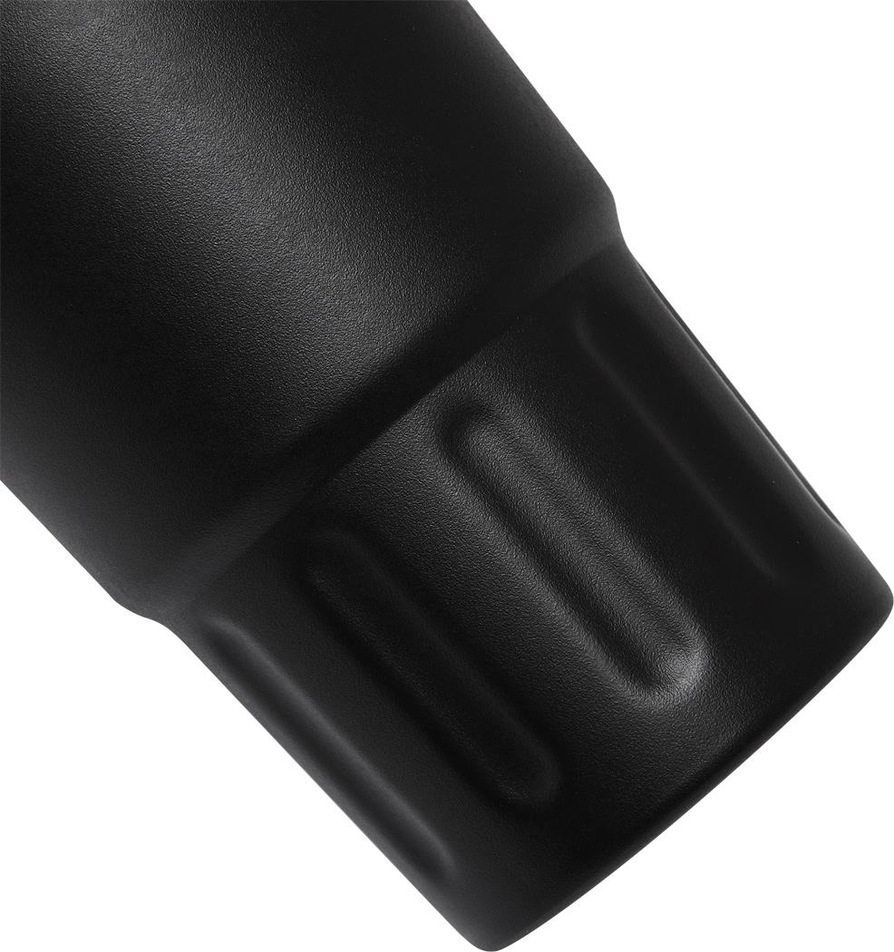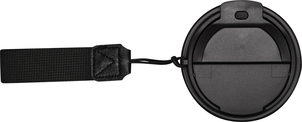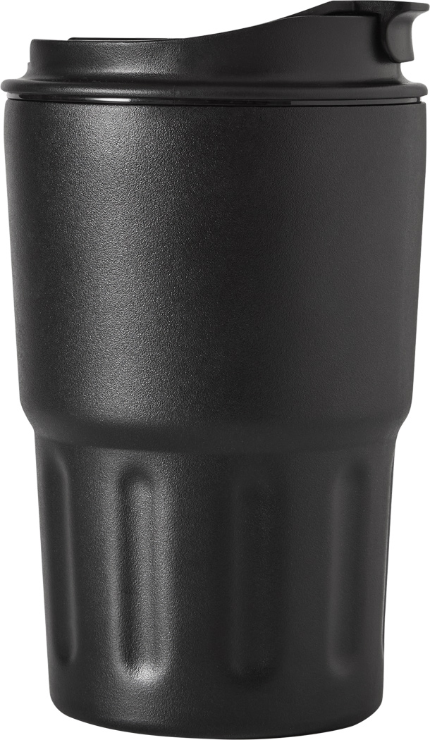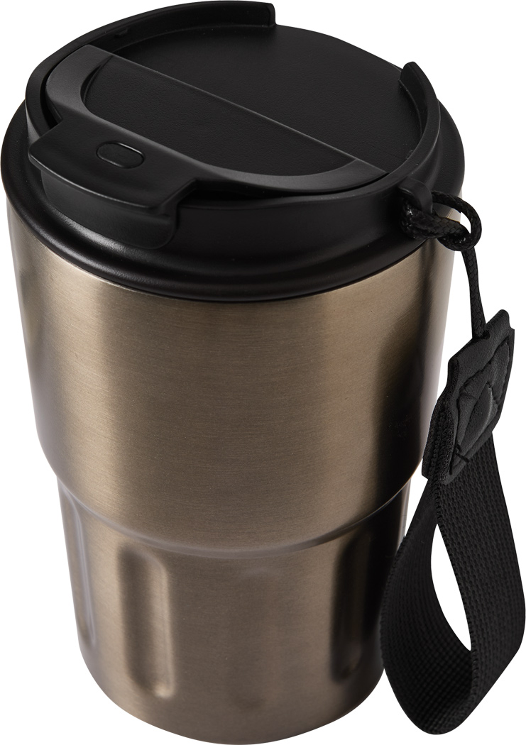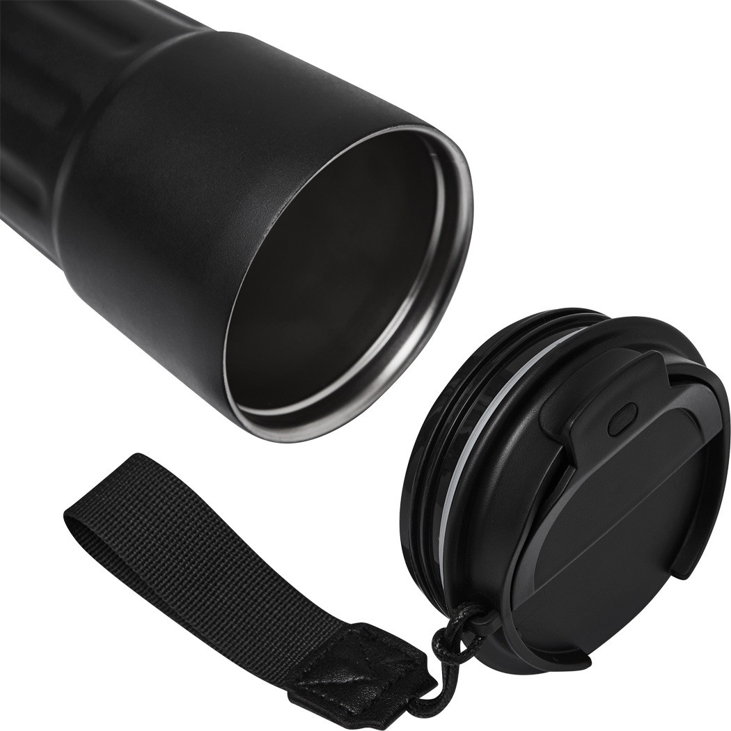 Vakuum-Trinkbecher TRAVEL MUG, doppelwandig: innen und außen aus Edelstahl, matte Pulverlackierung, schwarzer Kunststoff-Deckel mit sicherem Schraubverschluss, Silikon-Dichtring, integrierter Trinköffnung zum Aufklappen und Trageschlaufe aus recyceltem Kunststoff, Füllmenge ca. 400 ml, hält ca. 8 Stunden warm und bis zu 12 Stunden kalt, in Box