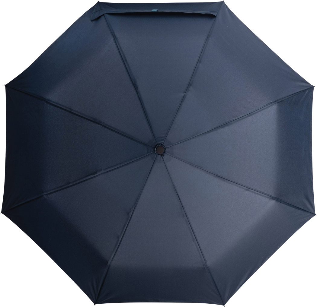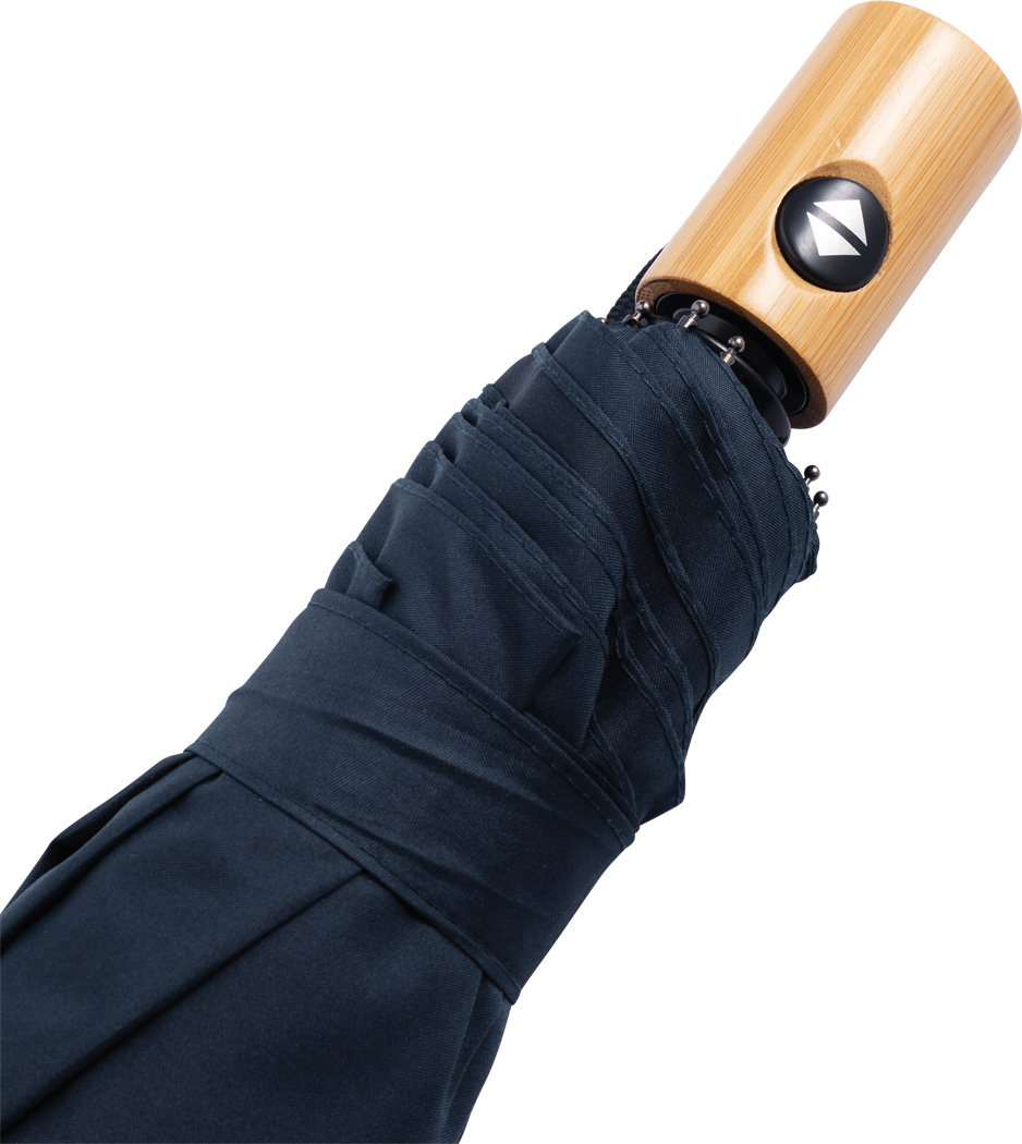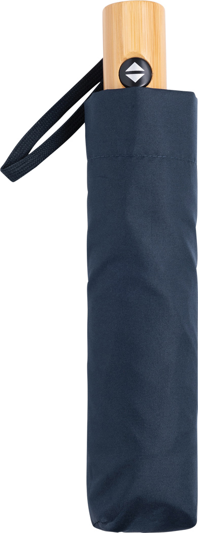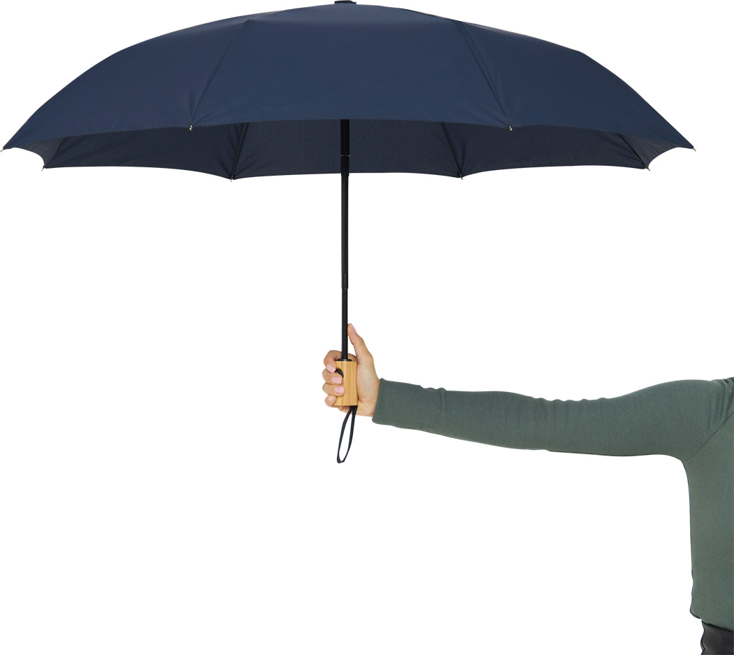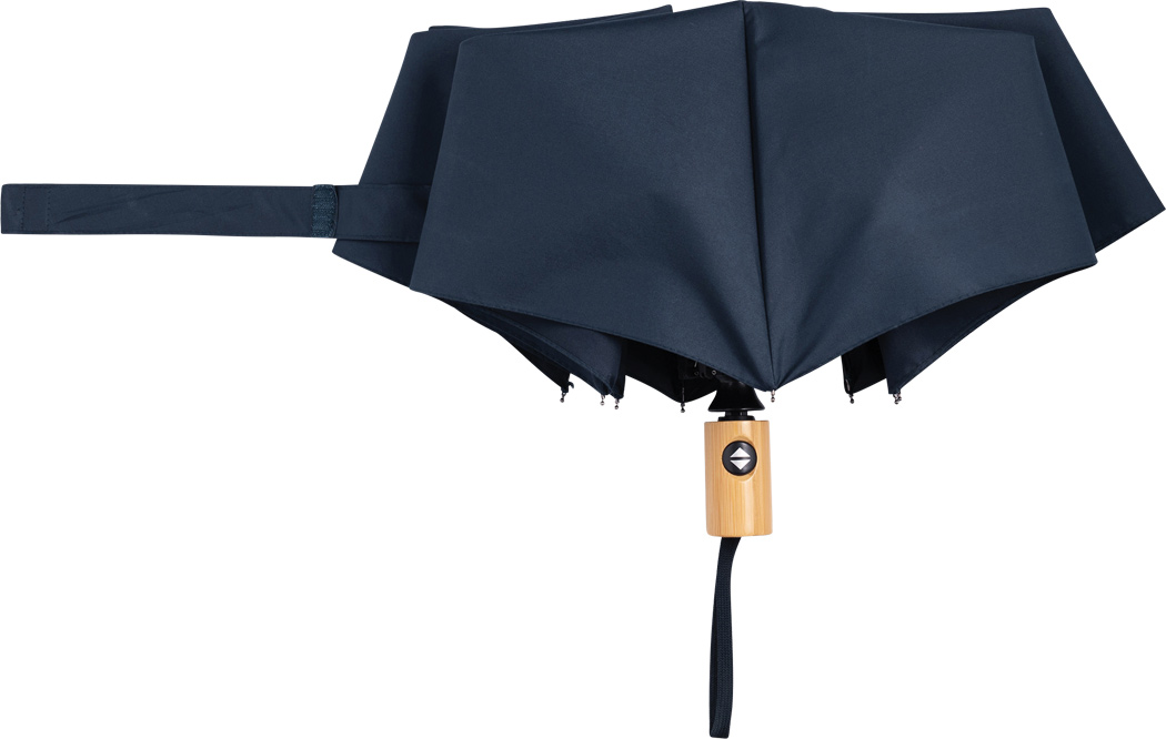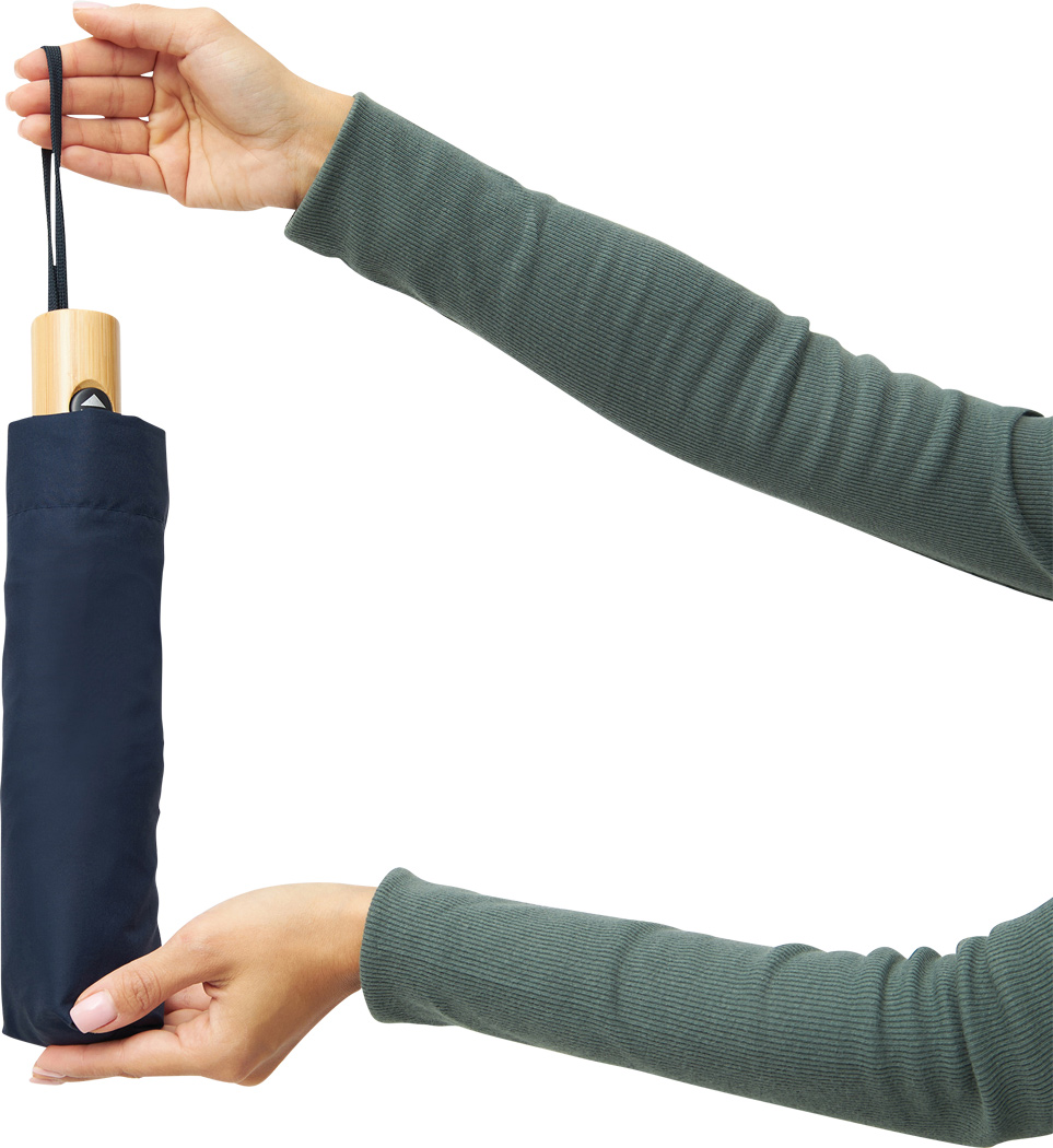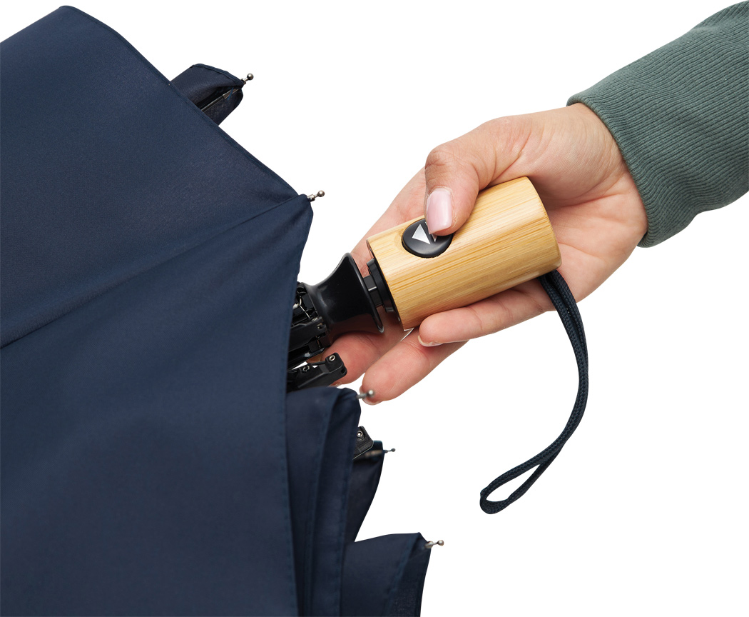 Vollautomatischer Windproof-Taschenschirm CALYPSO in farblich abgestimmtem Futteral: 3-teiliger Metallstock, mit Metall-Kunststoff-Fiberglasspeichen und Metalltips, Bambusgriff mit Handschlaufe, Polyester-Pongee-Bespannung aus recycelten Kunststoffen / RPET, Schließband mit Klettverschluss