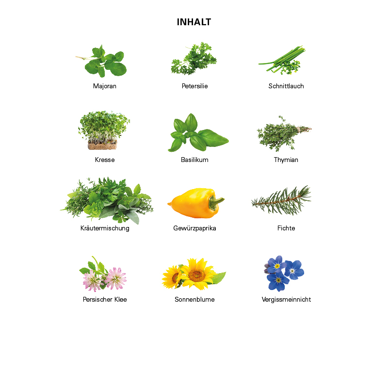 | Füllung: | 24 Substrattabletten und 24 Samentütchen in 12 Sorten |