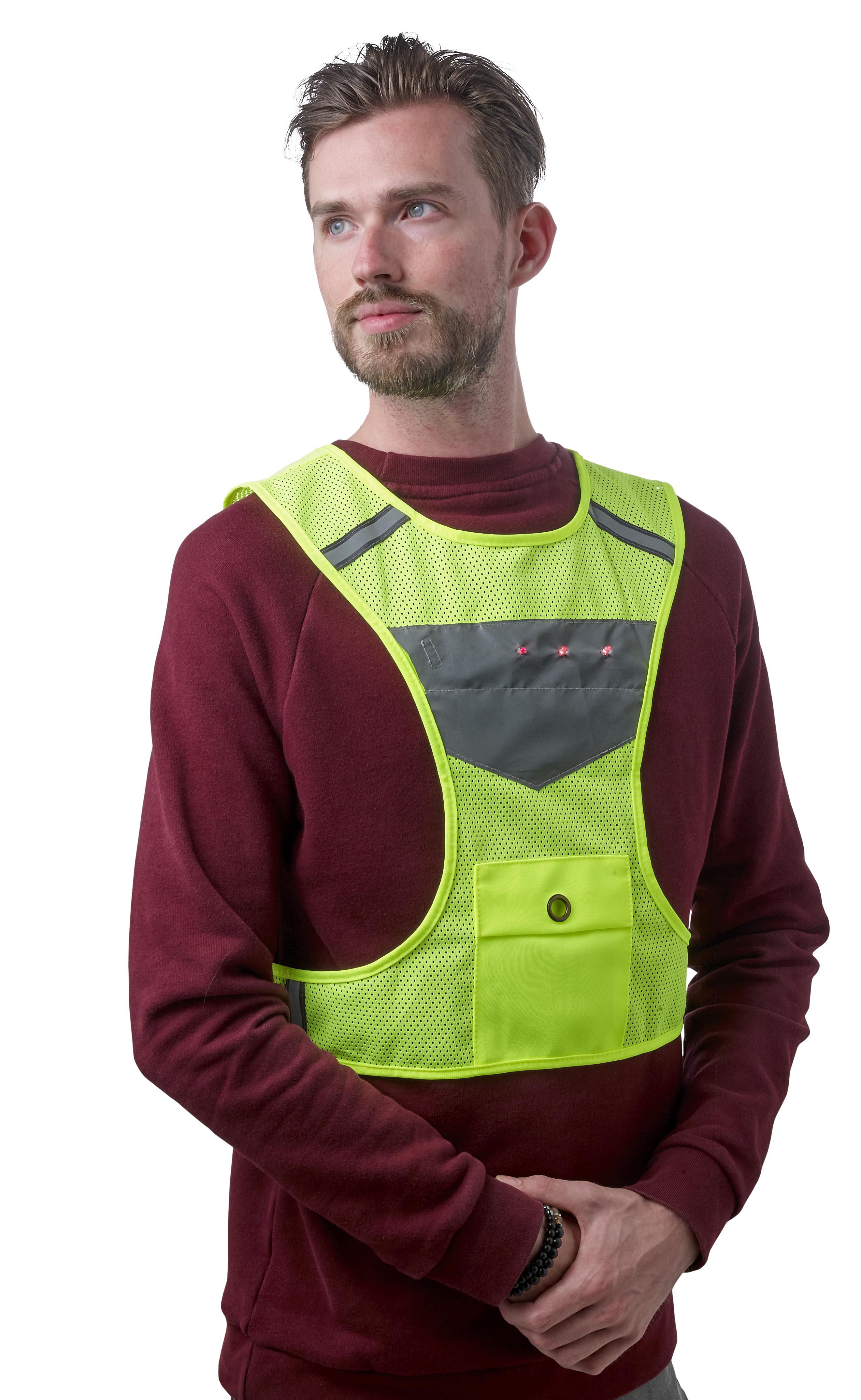 Warnweste aus Netzgewebe mit reflektierenden Flächen und drei Reflektoren auf der Vorder- und Rückseite. Zusätzlich gibt es drei LED-Leuchten (vorne und hinten), eine kleine Tasche auf der Vorderseite und einen Klettverschluss auf der Rückseite.