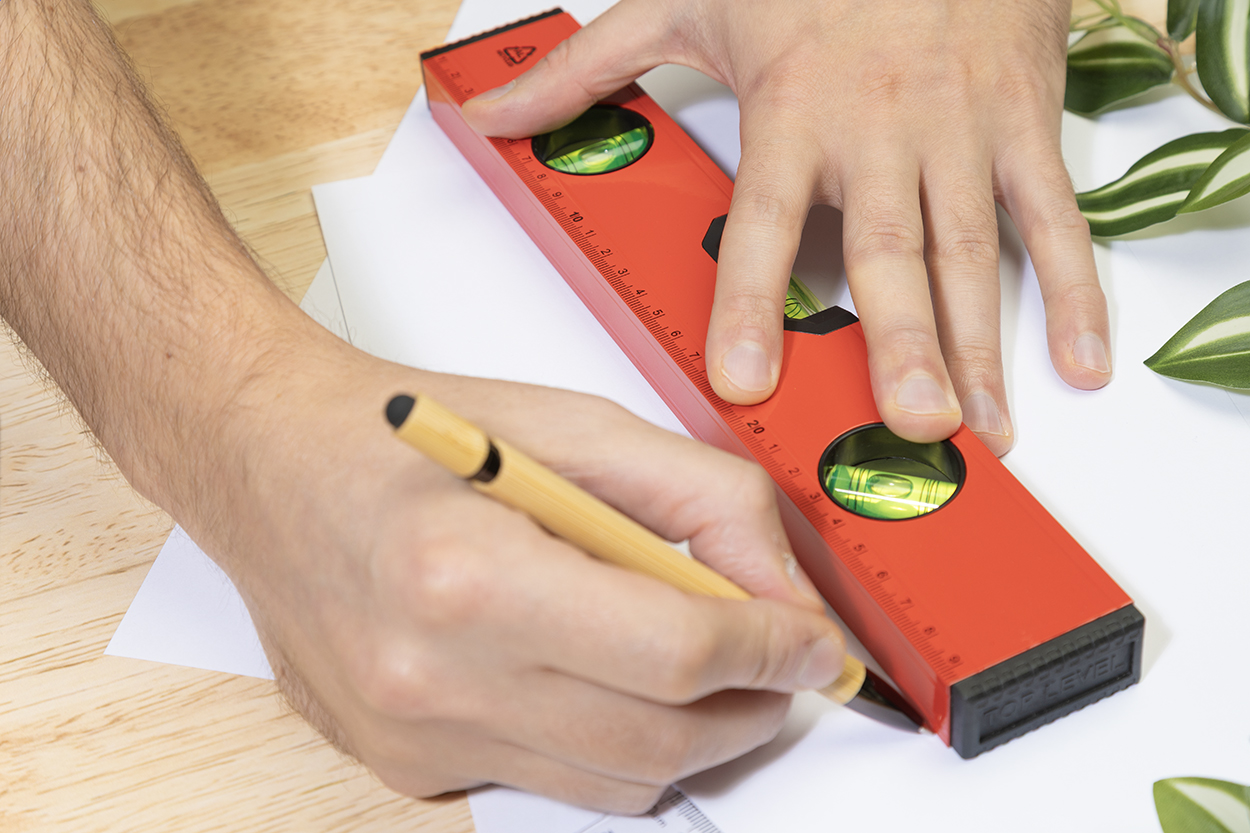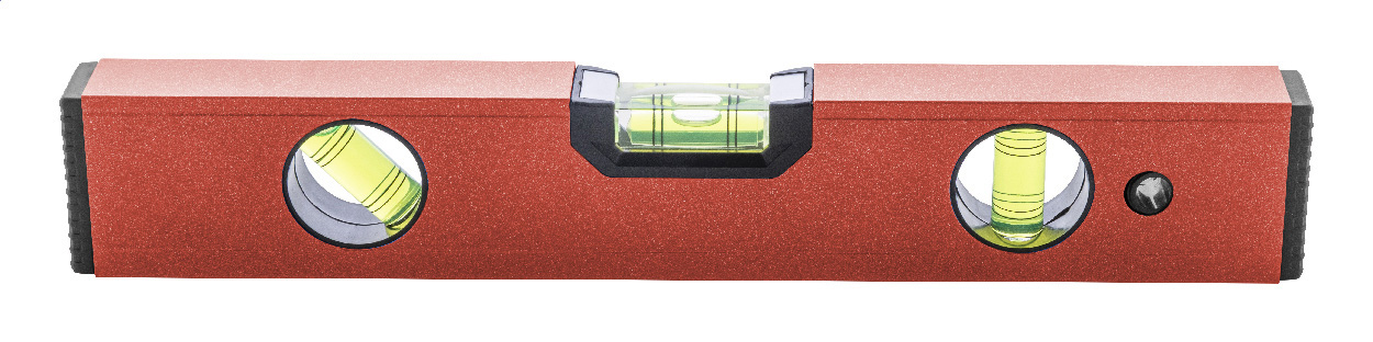 Magnetische Wasserwaage aus recyceltem Aluminium mit dreifacher Libelle (horizontal, vertikal und 45°) und 30 cm Lineal.
