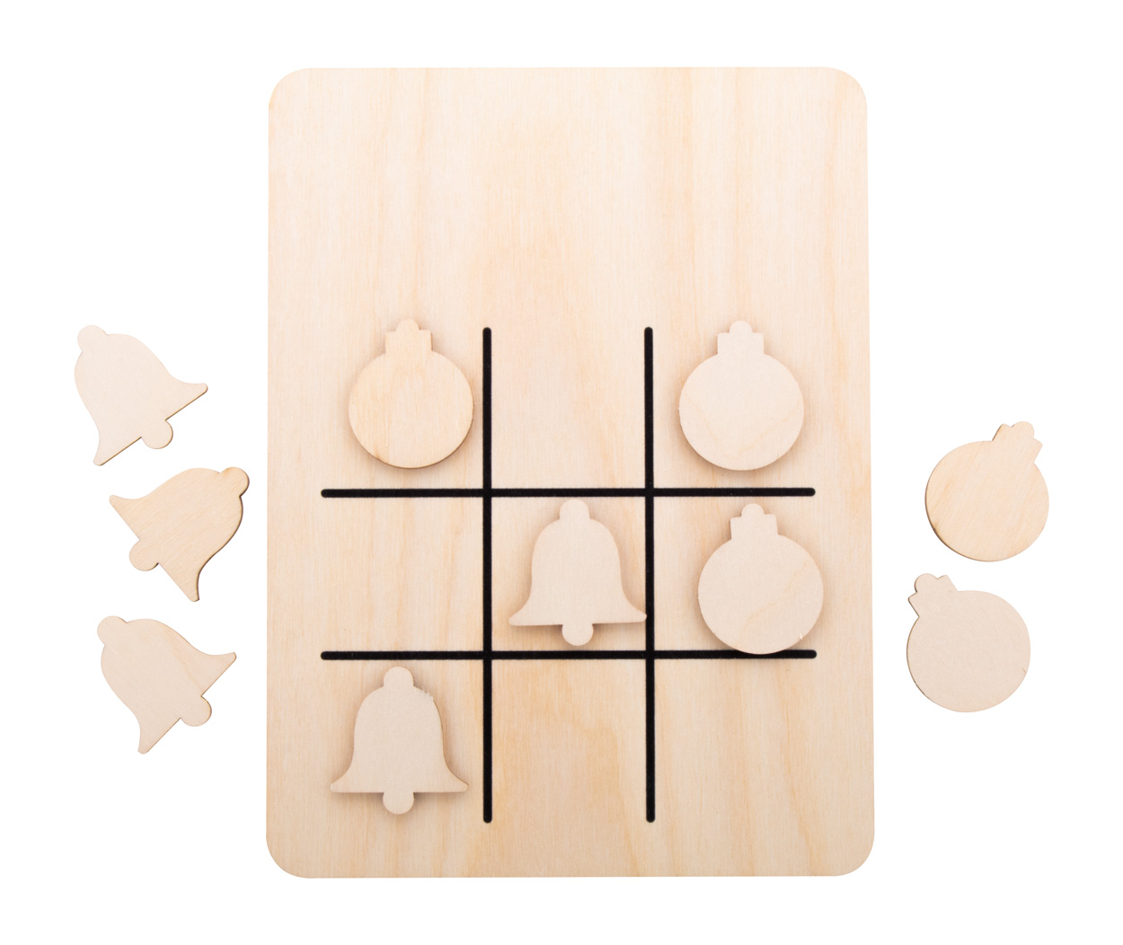 Tic-Tac-Toe-Spiel in weihnachtlichem Design aus Birkensperrholz mit 10 Spielsteinen.