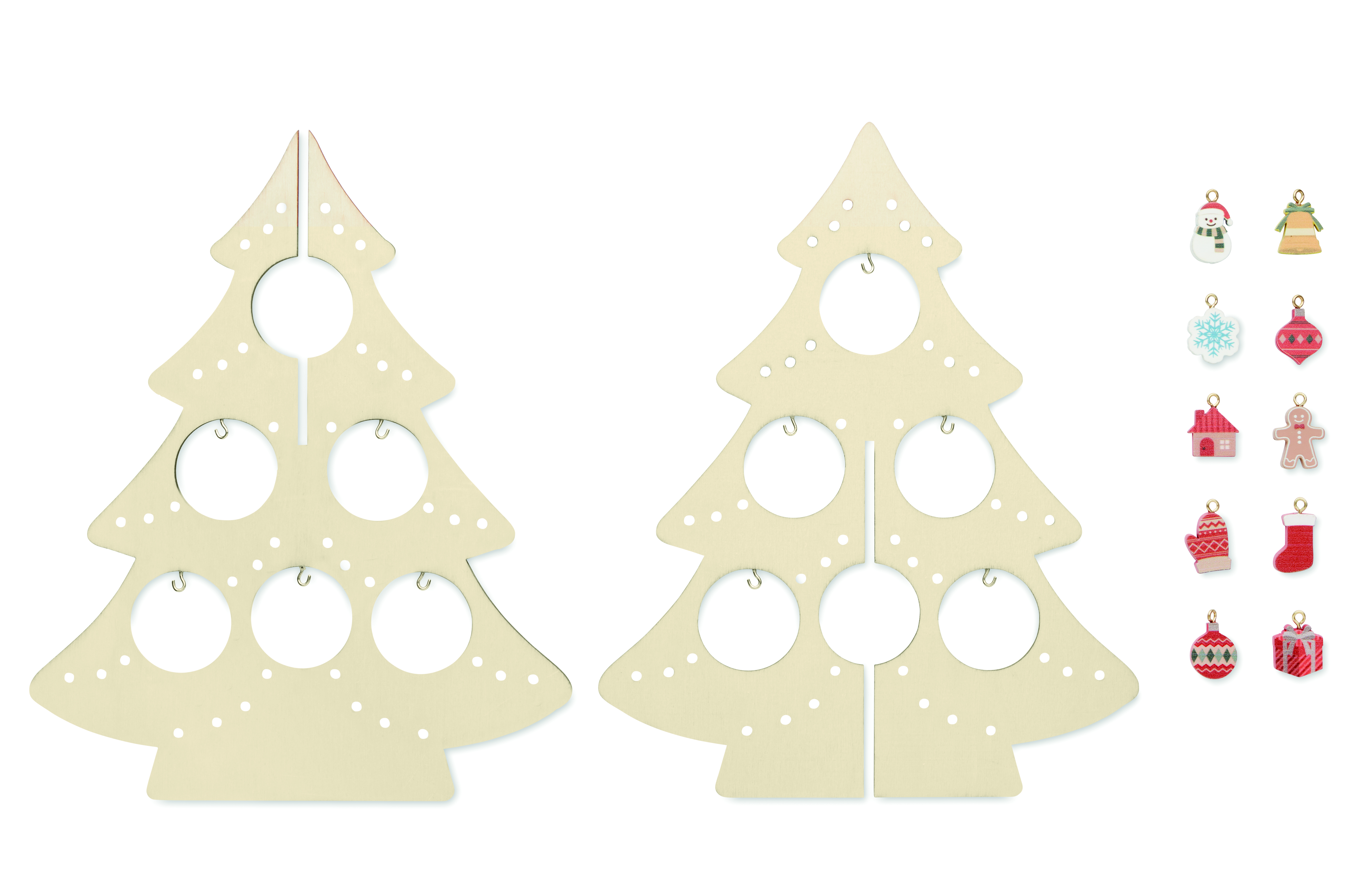 Weihnachtliche Dekoration aus Sperrholz in Form eines Weihnachtsbaumes mit 10 unterschiedlichen Ornamenten. Montage erforderlich.